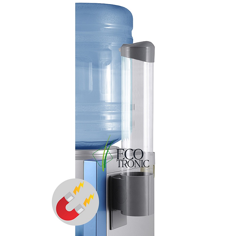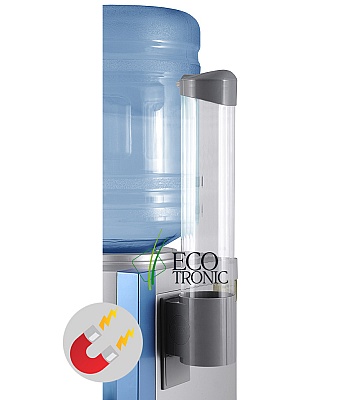 Стильный и практичный держатель для стаканов от Ecotronic серого цвета. Корпус выполнен из качественного поликарбоната, что обуславливает высокую степень прозрачности колбы данного дополнения к кулеру для воды. Вмещает около 50 стаканчиков. Крышечка защищает стаканы от пыли. К аппарату держатель крепится с помощью магнитной пластины.