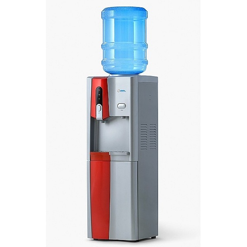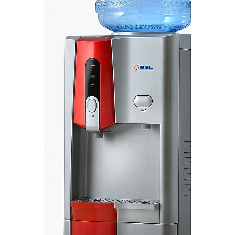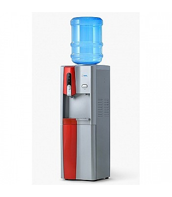 Элегантный напольный кулер серебристого цвета с яркой красной вставкой с правой стороны, расположенной в основной рабочей зоне и переходящая на дверку встроенного 16-литрового холодильника. Удобная подача воды с помощью клавиш-кнопок на лицевой панели.