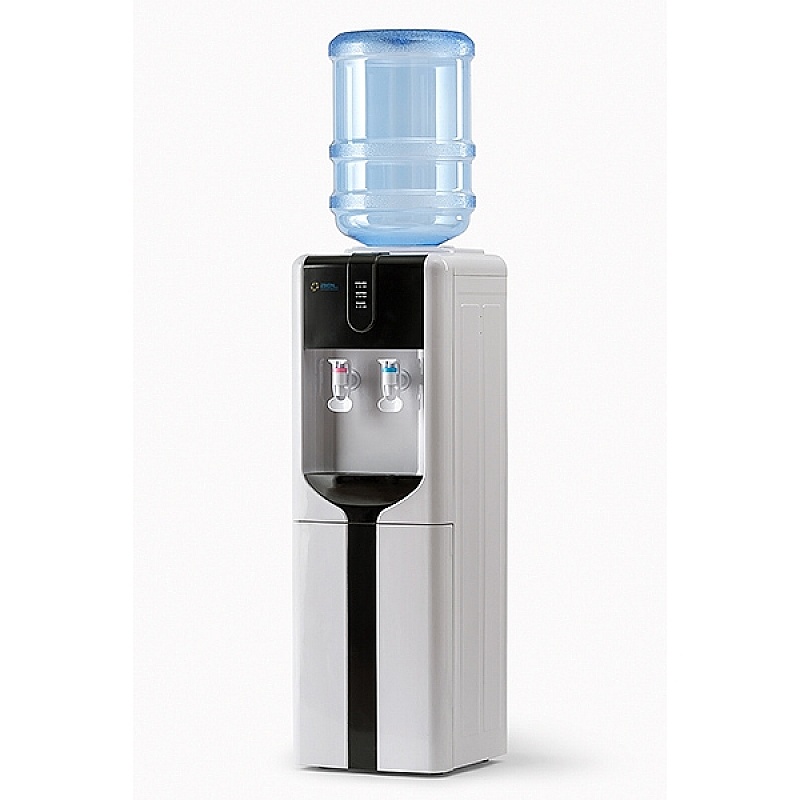 Корпус выполнен в белом цвете с черной вставкой. Производительное компрессорное охлаждение. Классические краны "нажим чашкой". Индикация нагрева/охлаждения на фронтальной панели.