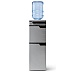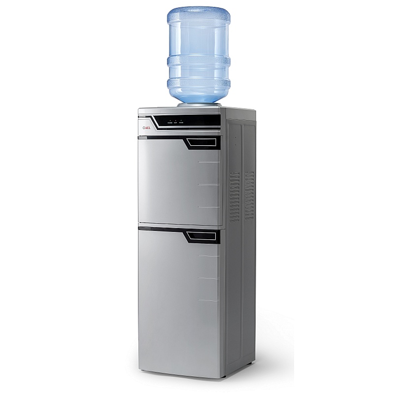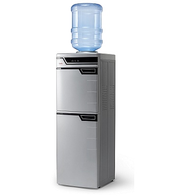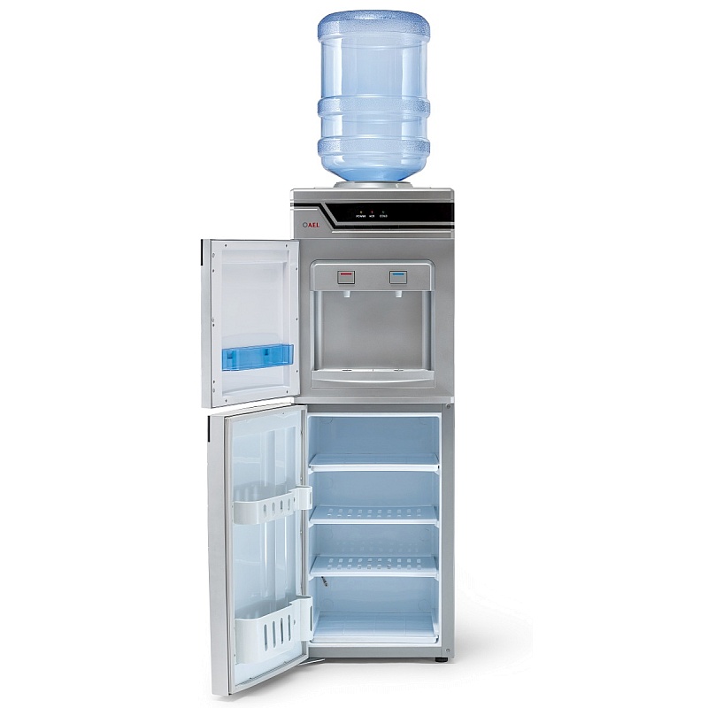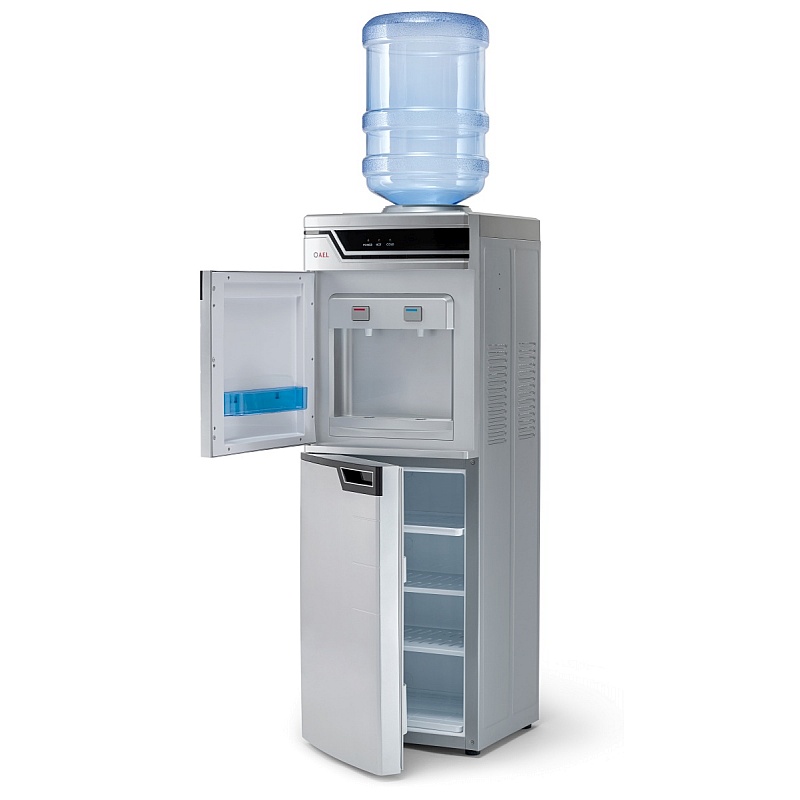 С большой холодильной камерой для хранения продуктов и дверцей, закрывающей рабочую зону клавиш подачи горячей и холодной воды. Весь корпус выполнен в серебристом цвете.