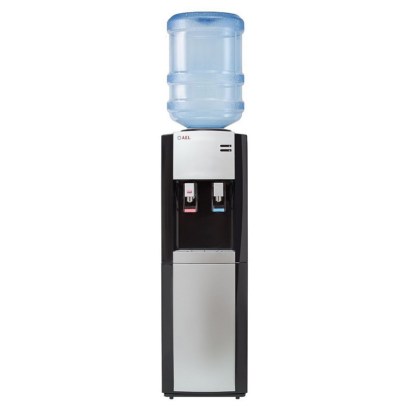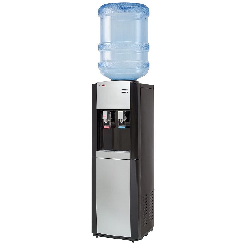 Недорогой кулер с компрессорным охлаждением воды. Черный цвет с серебристой вставкой. Верхняя загрузка бутыли. Удобные краники "нажим кружкой" с внутренней резьбой, что позволяет при необходимости легко и быстро их менять. Кран горячей воды с кнопкой-защитой от случайного нажатия.