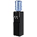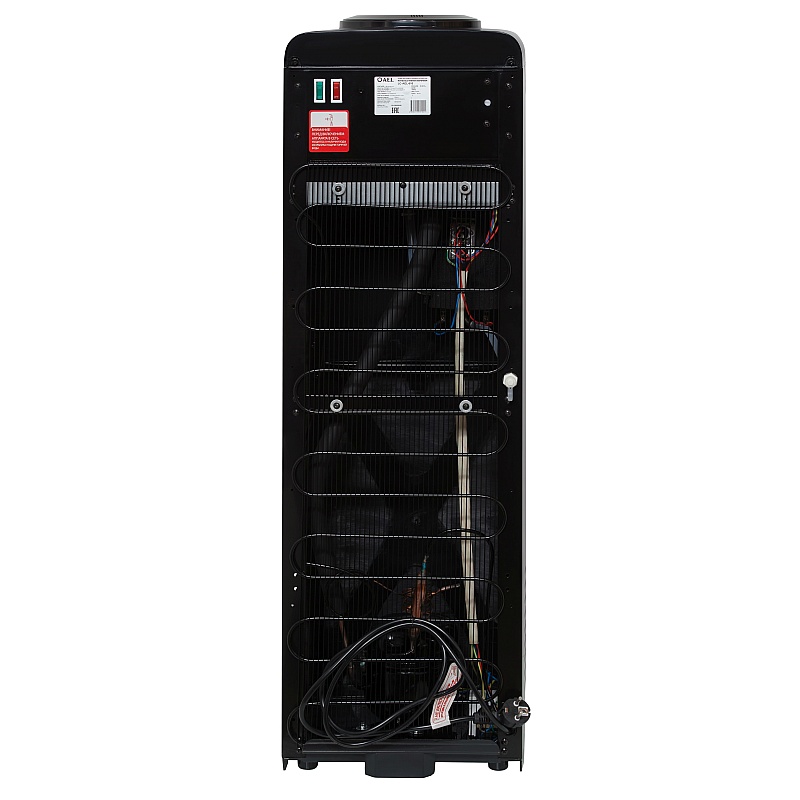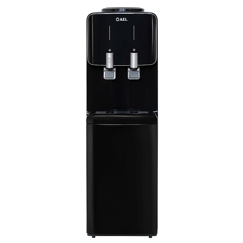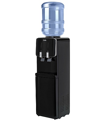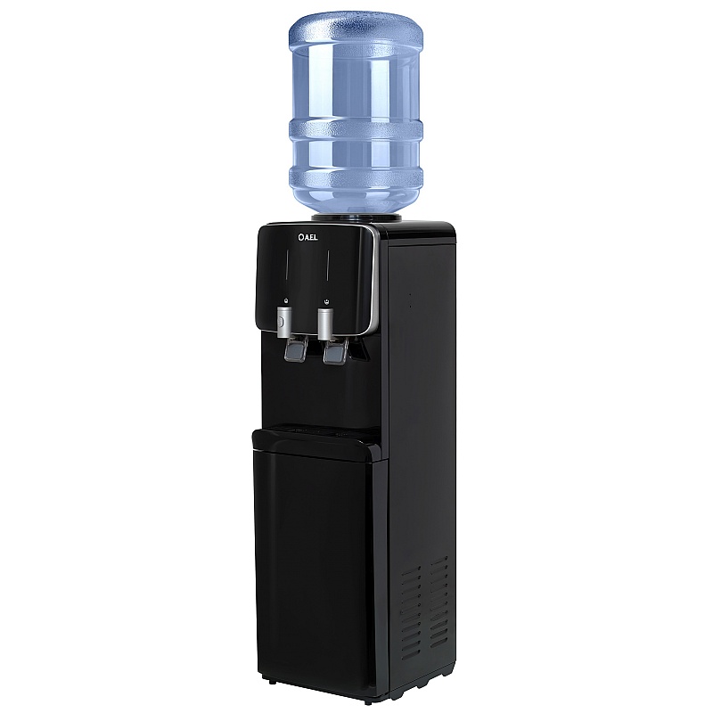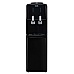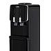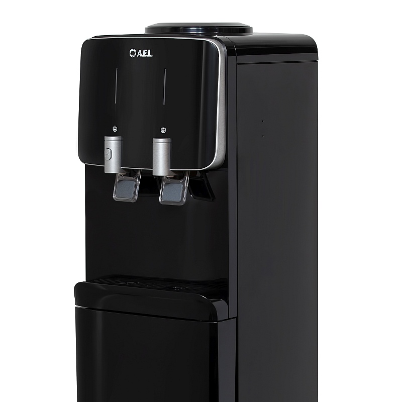 напольный кулер с компрессорным охлаждением черного цвета и верхней загрузкой бутыли. Удобные краники "нажим чашкой" серебряного цвета с защитой от случайного нажатия на горячую воду.