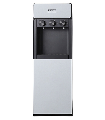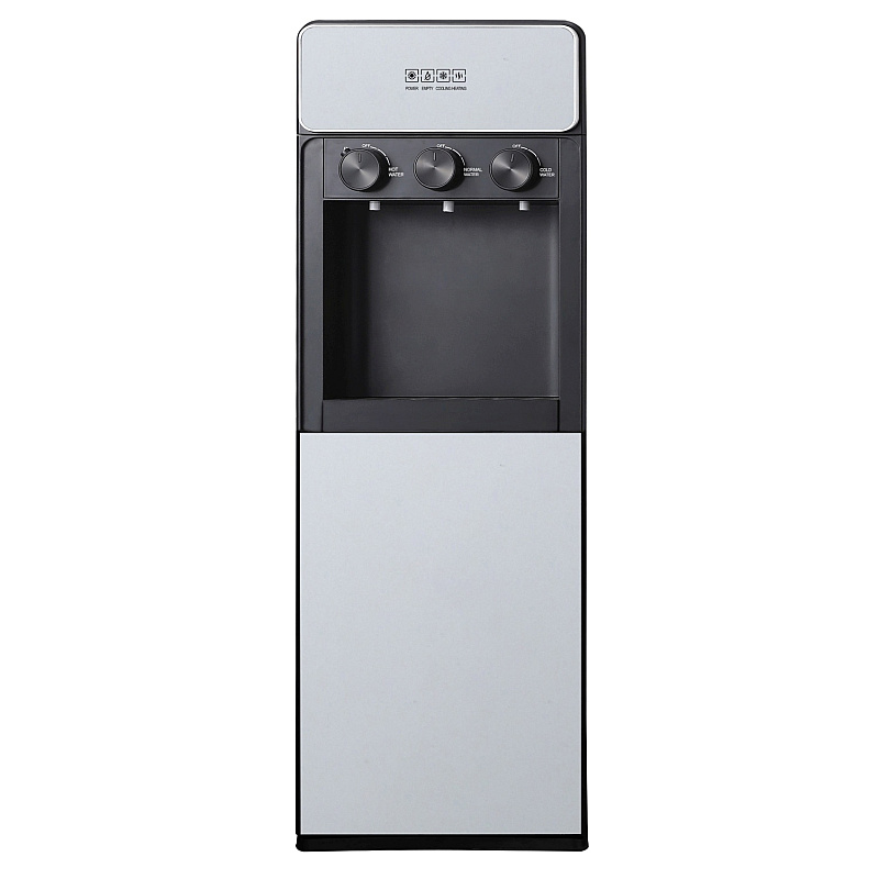 Напольный кулер с нижней загрузкой бутыли и компрессорным охлаждением. Корпус черного цвета с серебристыми вставками. Три крана подачи воды: горячей, холодной и комнатной температуры. На кране горячей воды располагается кнопка от случайного нажатия. В процессе эксплуатации аппарата в тот момент, когда вода в бутыли закончилась, на панели индикации загорится индикатор наличия воды в бутыли. Это символизирует о том, что необходимо заменить пустую бутыль. Кулер оснащен всеми необходимыми функциями для комфортного использования в офисе, дома или в общественных местах. Компактные размеры и продуманная конструкция делают его удобным в эксплуатации.