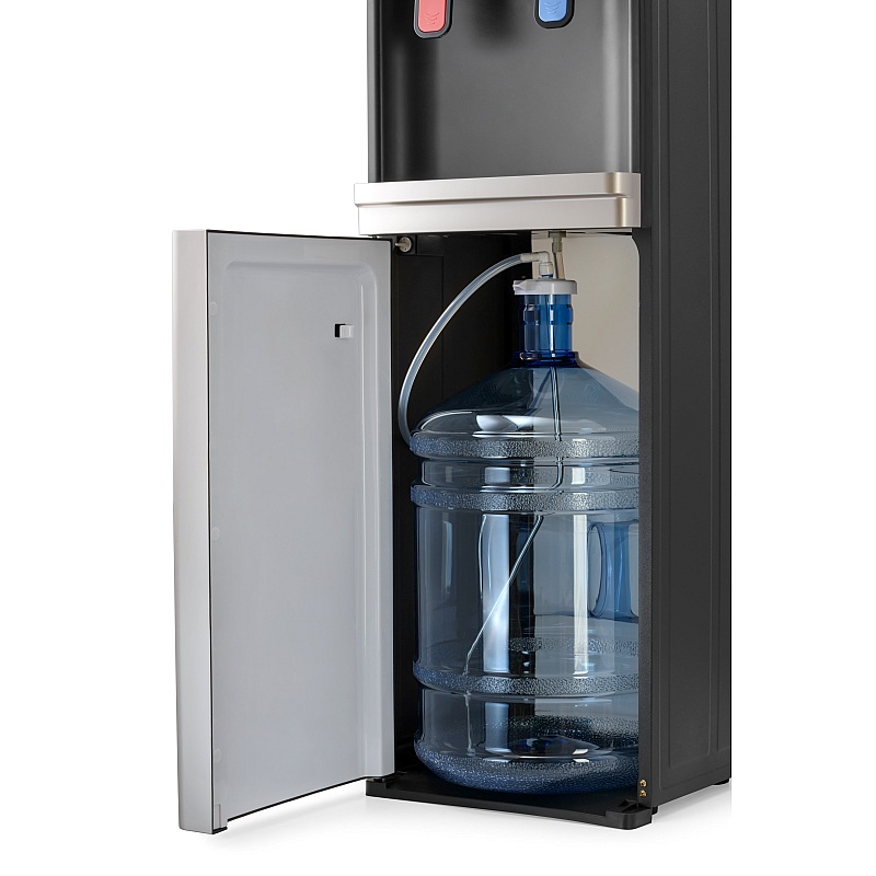 Кулер с нижней загрузкой бутыли с электронным охлаждением. Цвет: черный с золотой вставкой. Модель оснащена двумя краниками подачи воды типа "нажим кружкой" (горячая/холодная). Стильный лаконичный дизайн отлично подойдет для дома или офиса.