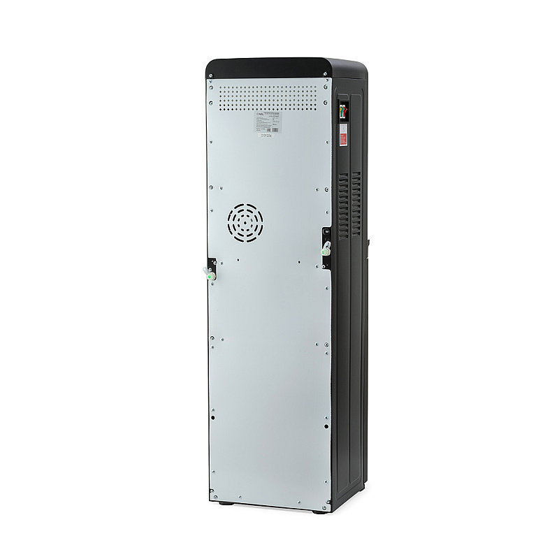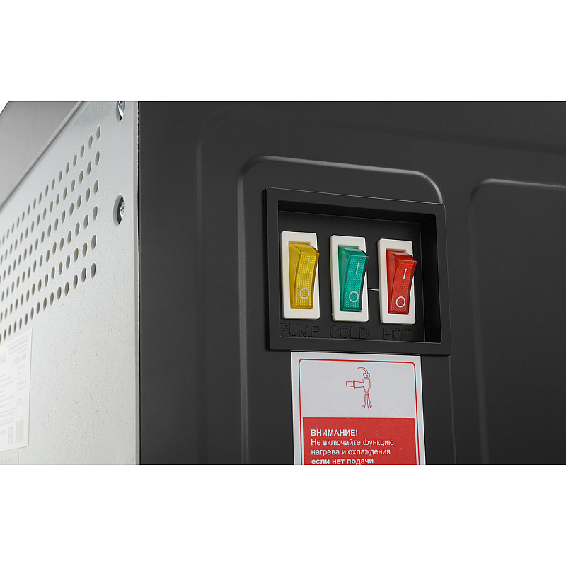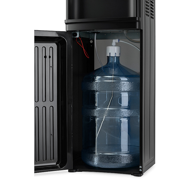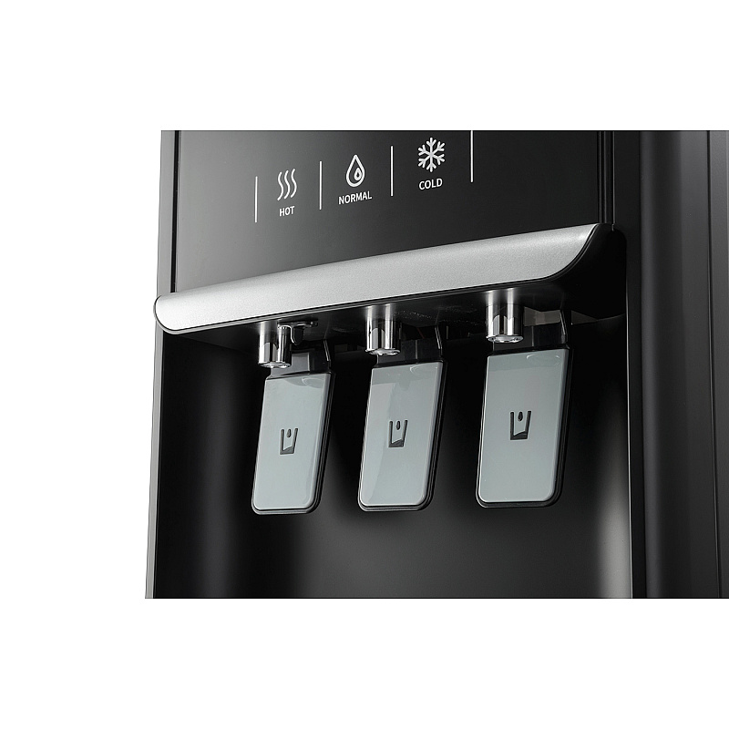 Особенность модели — удобная нижняя загрузка бутыли, благодаря которой замена воды не вызывает сложностей. Кулер оснащён тремя кранами с системой подачи воды нажатием чашки, что делает его использование максимально простым и гигиеничным.