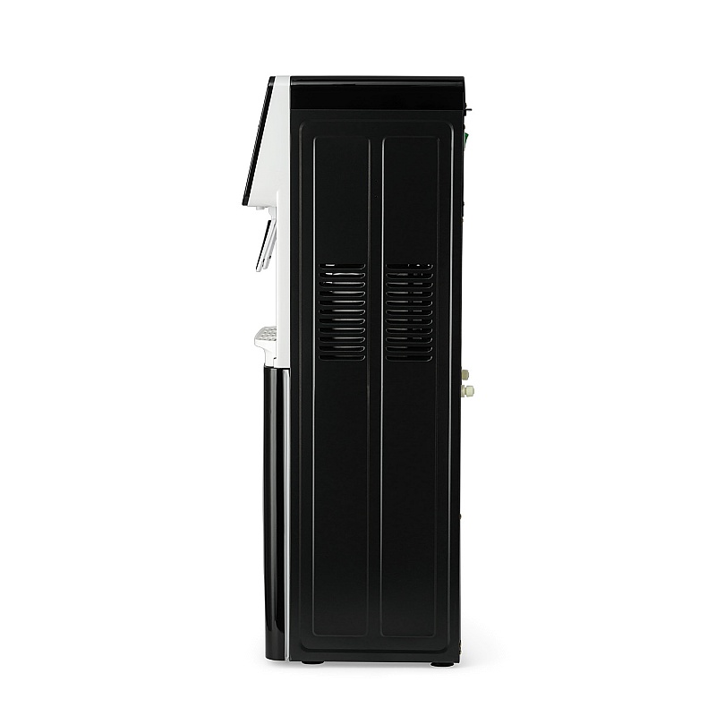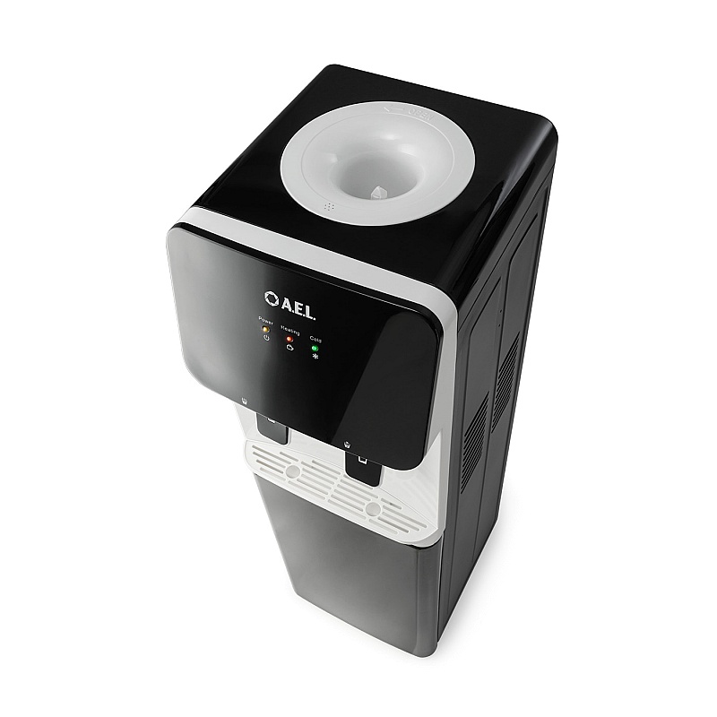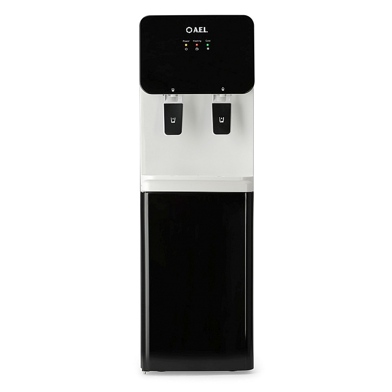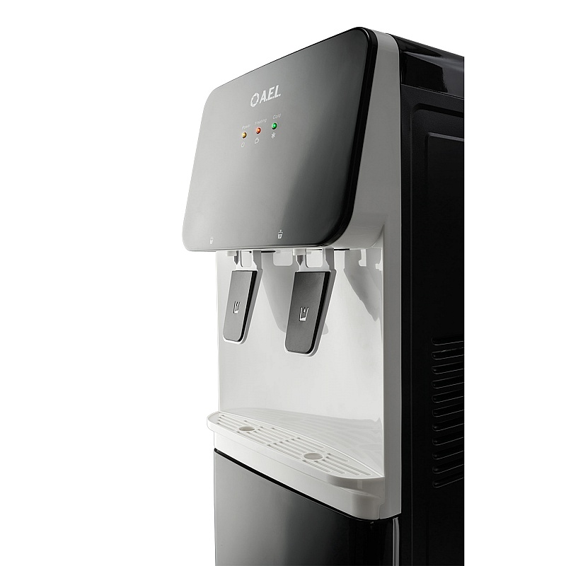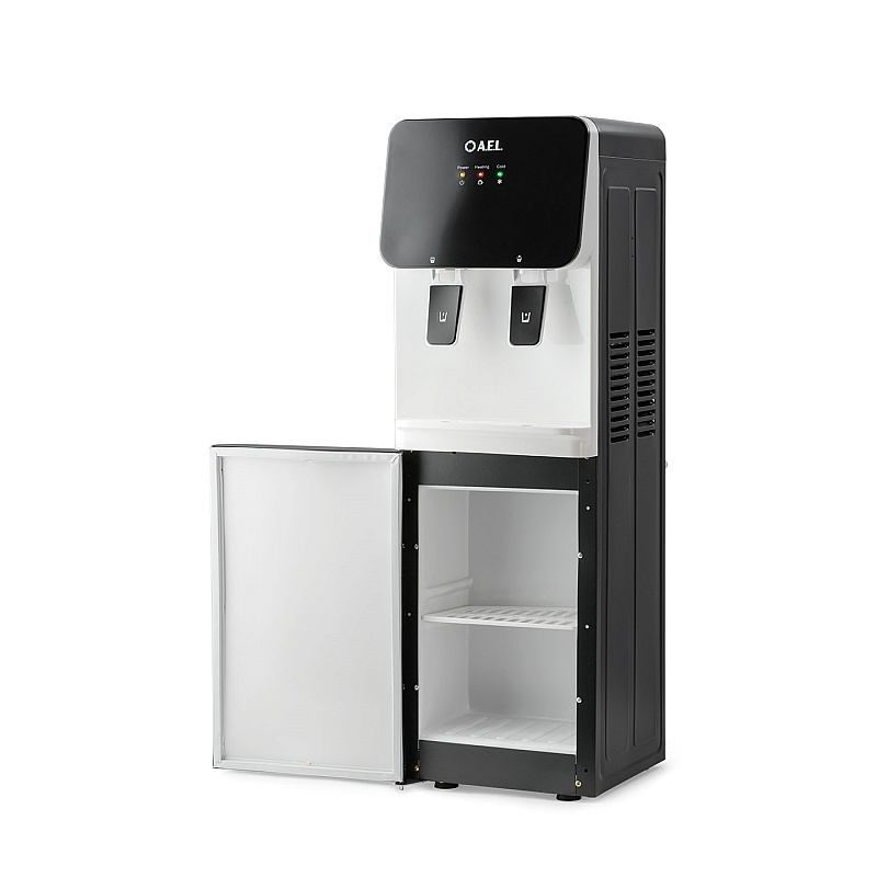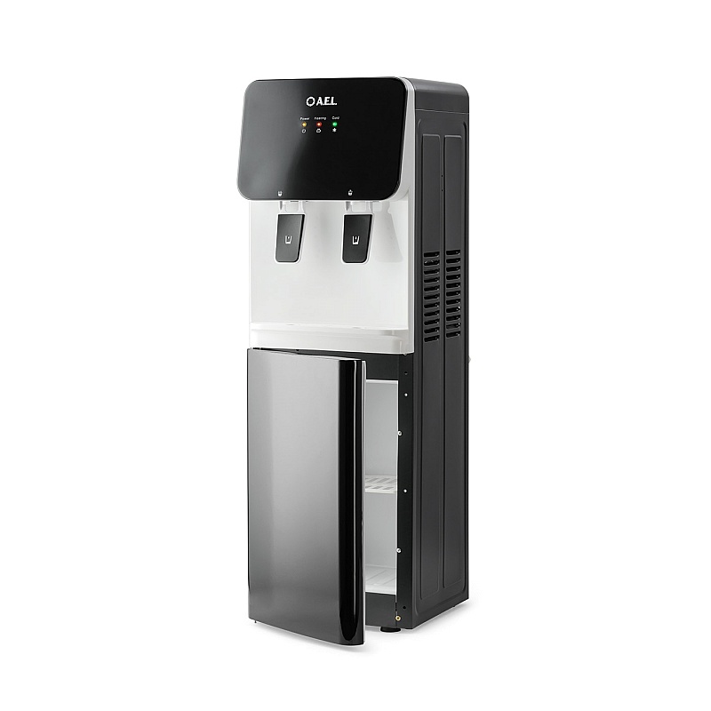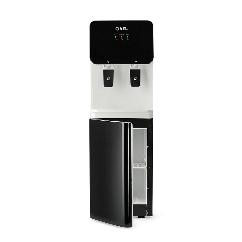 Напольный кулер с электронным охлаждением, нагревом и шкафчиком для продуктов без охлаждения. Гладкая лицевая панель, удобные краны "нажим чашкой" Бюджетный. Цвет черный с белой вставкой на лицевой панели. Шкафчик на 9 литров. Краны "нажим кружкой".