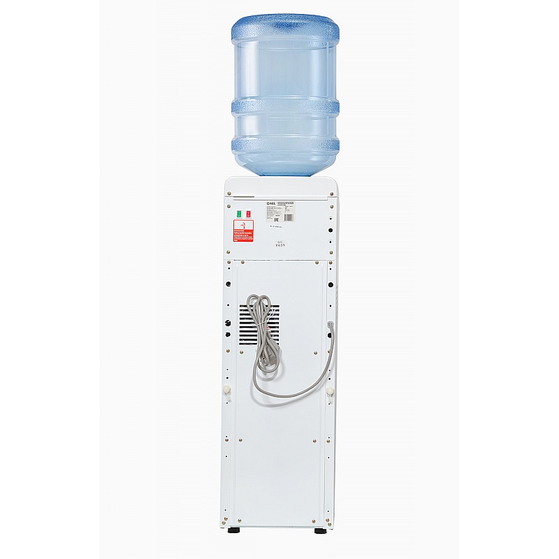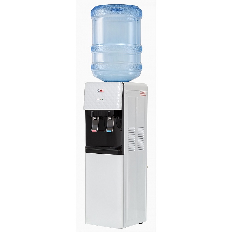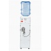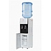 Напольный кулер с электронным охлаждением и верхней загрузкой бутыли. Эконом-вариант. Цвет белый с черной вставкой на лицевой панели. Шкафчик на 9 литров. Краны "нажим чашкой".