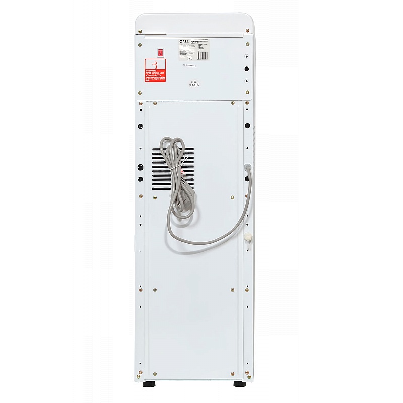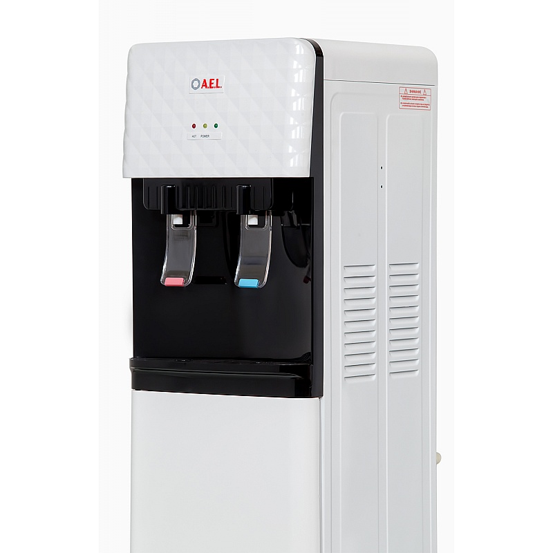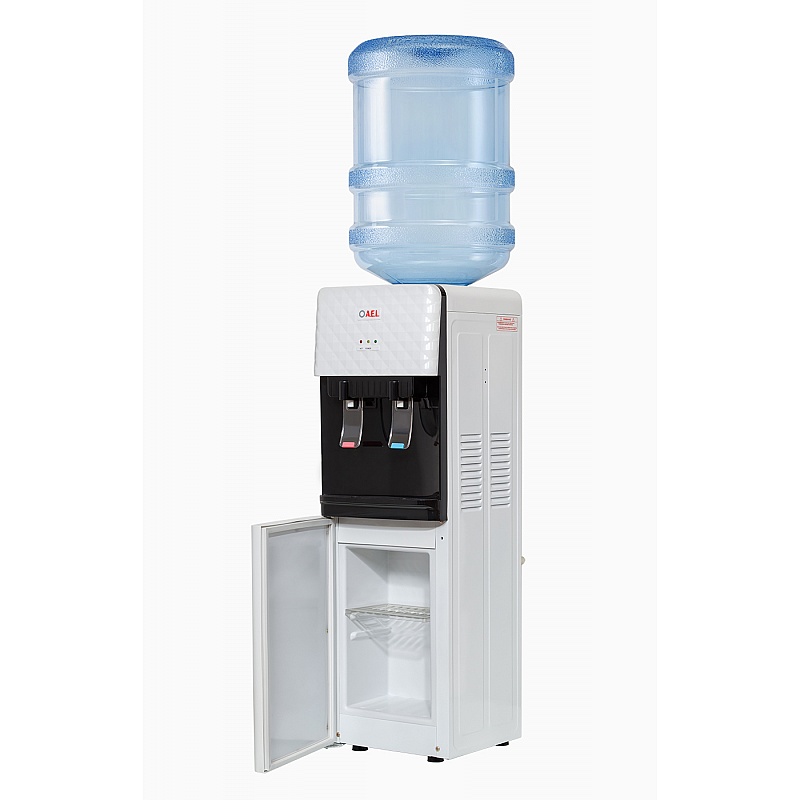 Напольный кулер без охлаждения и верхней загрузкой бутыли. Эконом-вариант. Цвет белый с черной вставкой на лицевой панели. Шкафчик на 9 литров. Краны "нажим чашкой".
