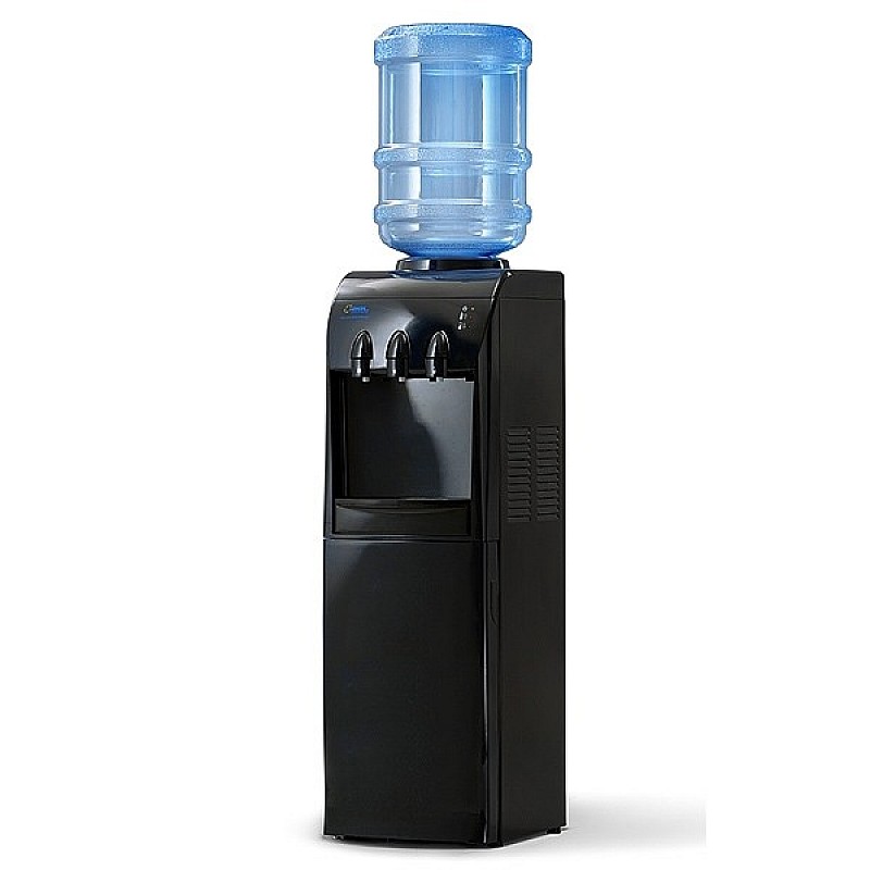 Привлекательный кулер с компрессорным охлаждением, выполненный полностью в черном глянцевом цвете. Вода подается с помощью механических кнопок в горячем, холодном и комнатном состоянии. Аппарат укомплектован новым нагревательным элементом донного типа, не контактирующим с водой напрямую.