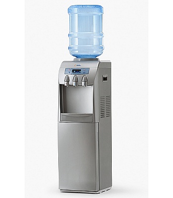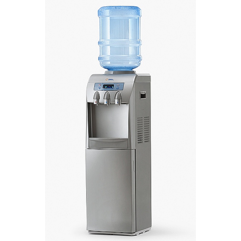 С холодильником на 20л. Из серии аппаратов, позволяющих наливать не только горячую и холодную, но и воду комнатной температуры, выполненный в серебристом цвете. Оснащен панелью управления для регулировки температурного режима нагрева и охлаждения. В нижней части корпуса расположен практичный холодильник.