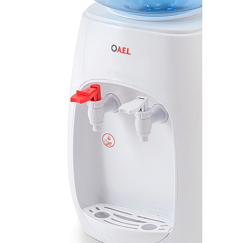 Без функции охлаждения воды. Аппарат нестандартной формы белого цвета. Оснащен кранами типа "нажим рукой", а краник подачи горячей воды имеет защиту от случайного нажатия. Легкий и удобный кулер. Аккуратный дизайн. Актуален как дома и на даче, так и в школе.