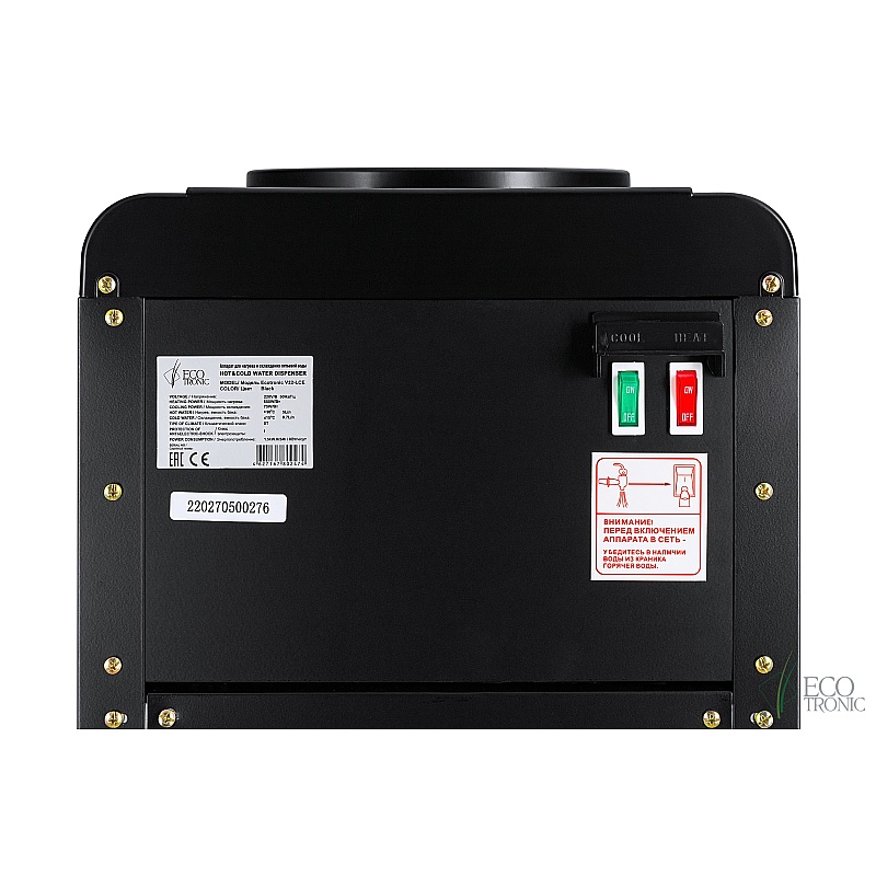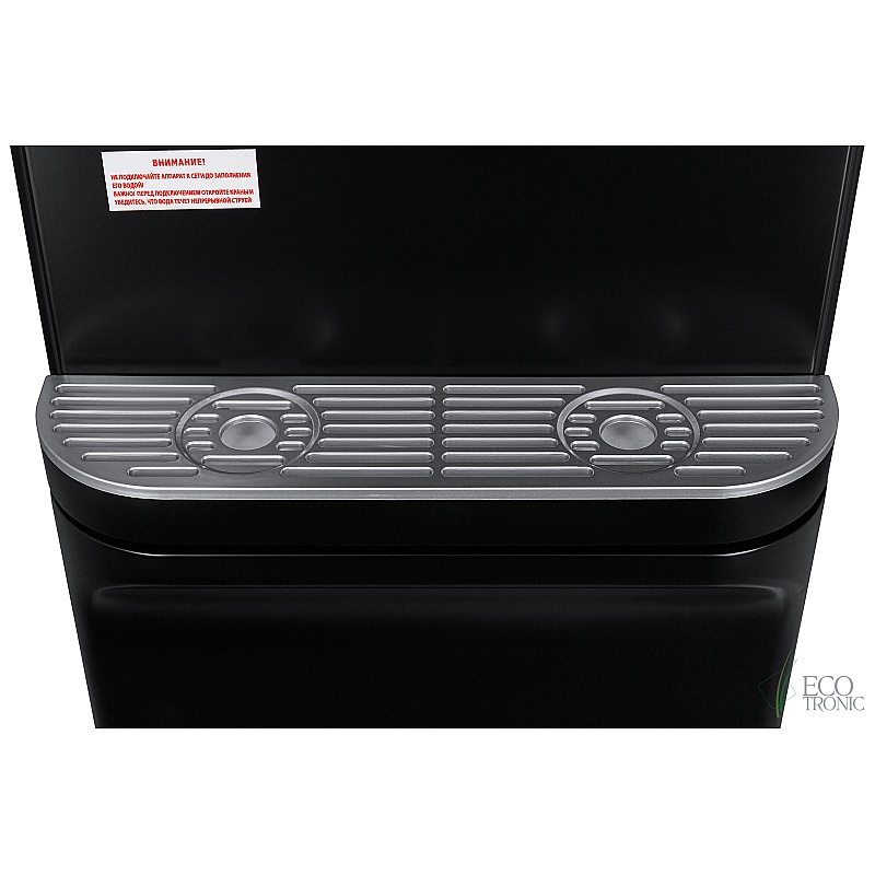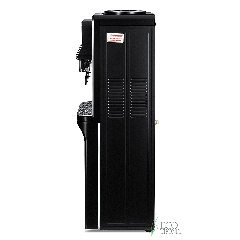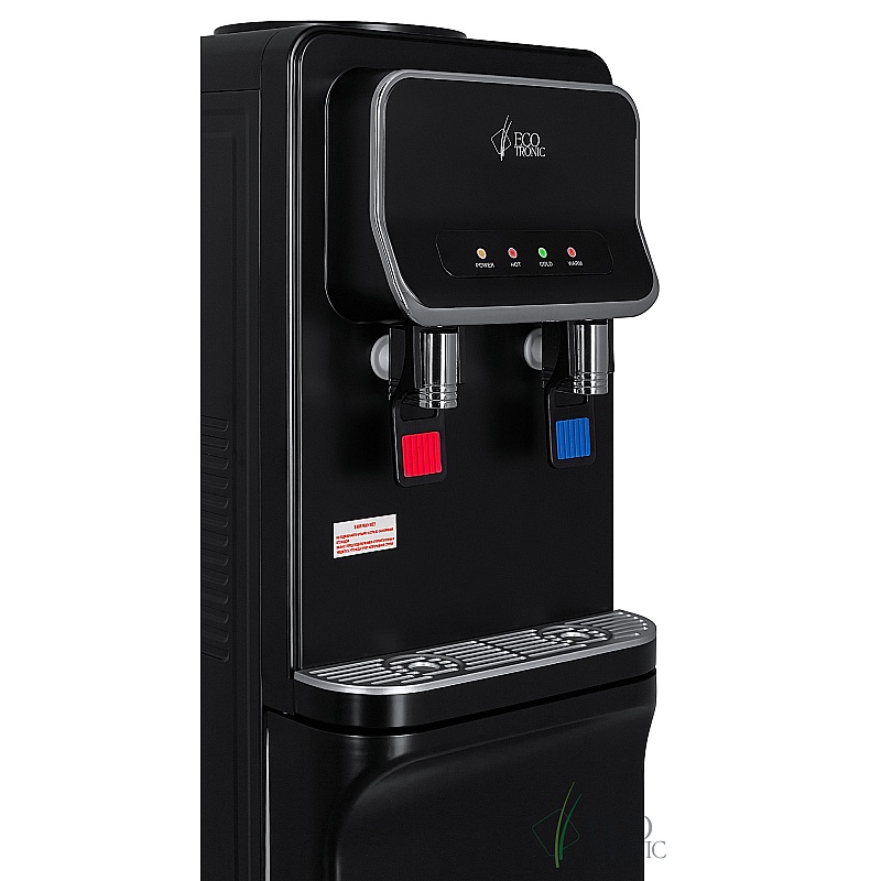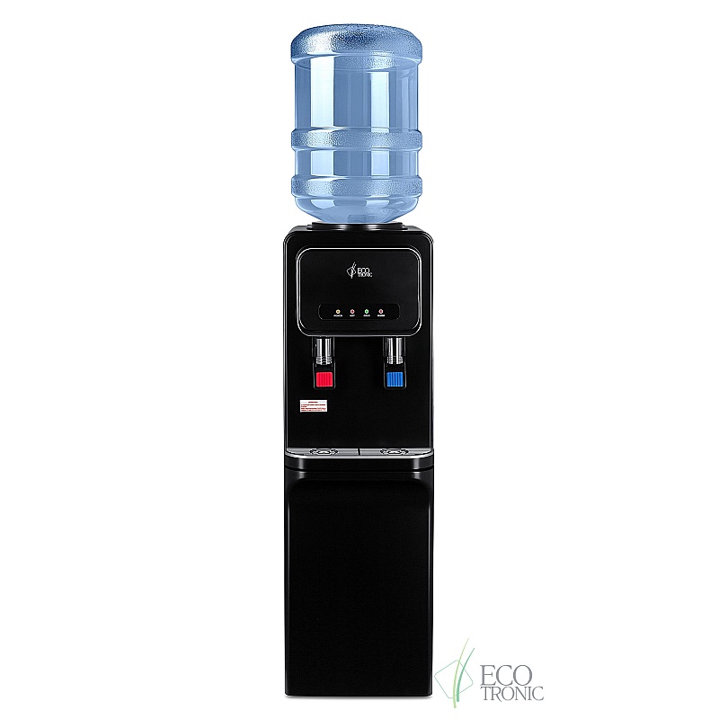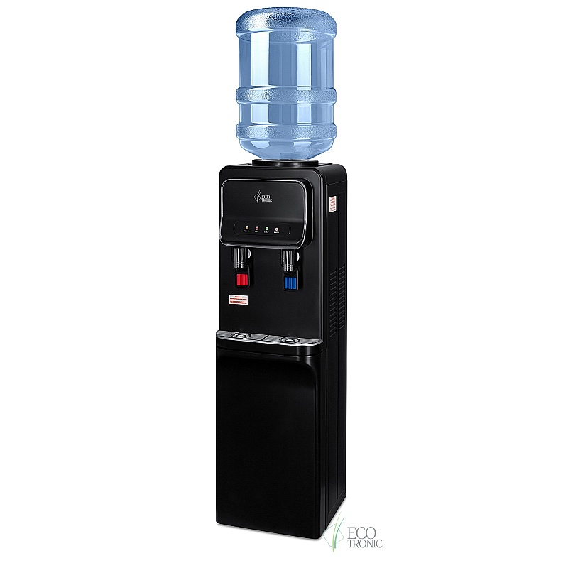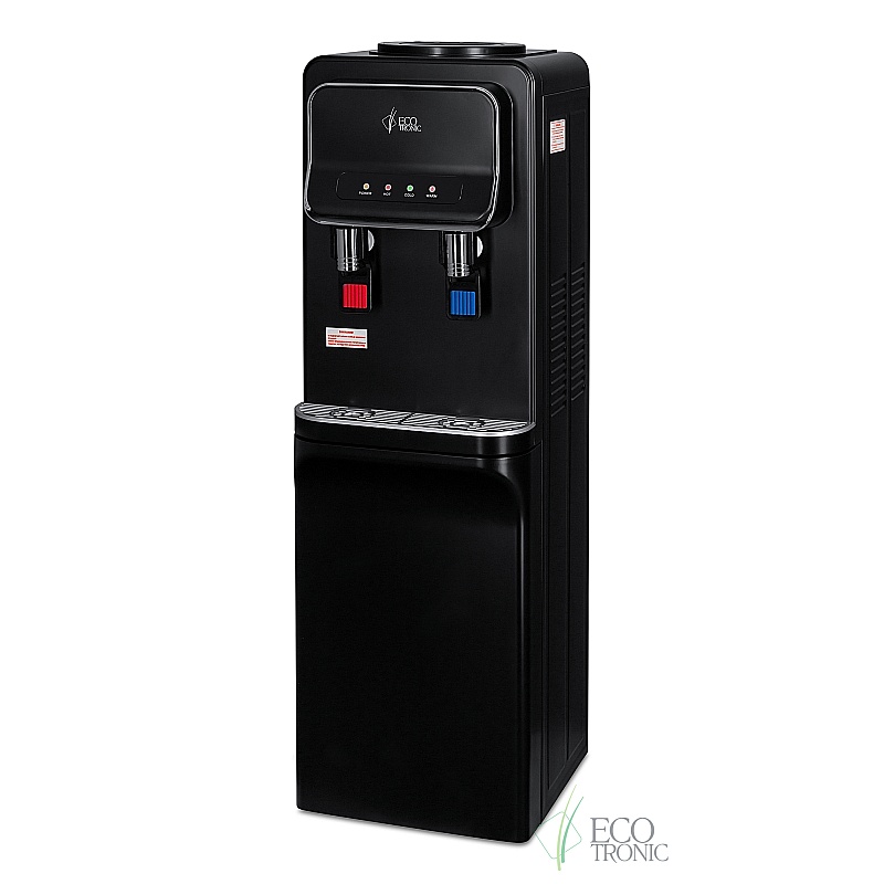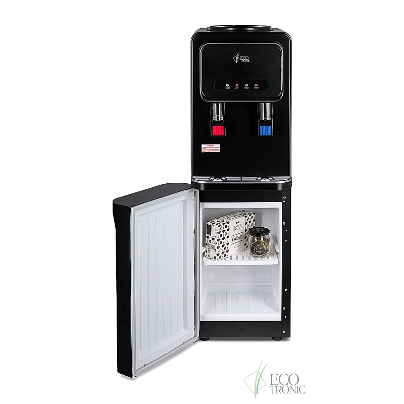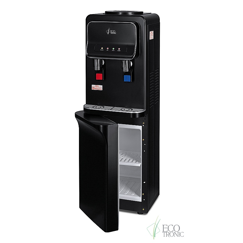 Недорогой напольный кулер с электронным охлаждением и шкафчиком в нижней части. Черного цвета. С электронным охлаждением. Краны подачи воды типа "нажим кружкой". Индикация нагрева и охлаждения. Индикатор warm, указывающий, что горячая вода нагрета до нужной температуры.