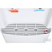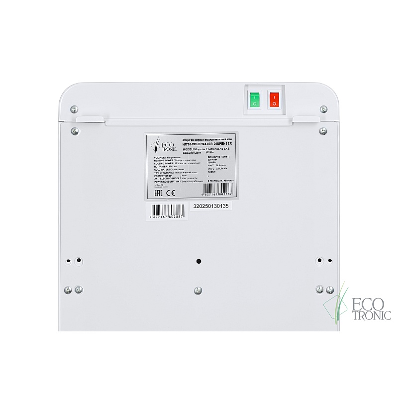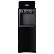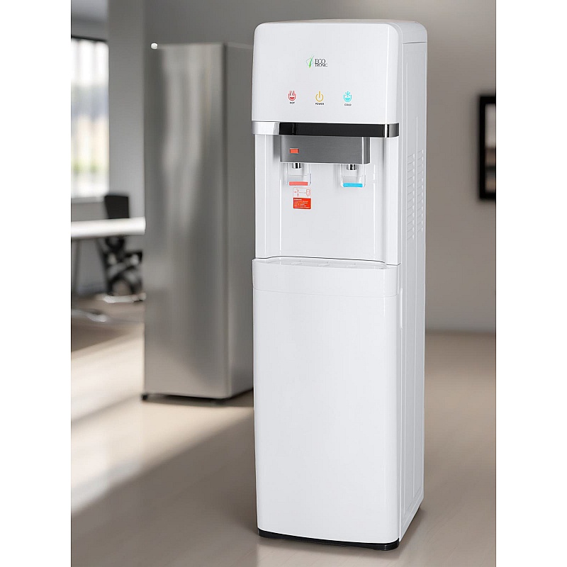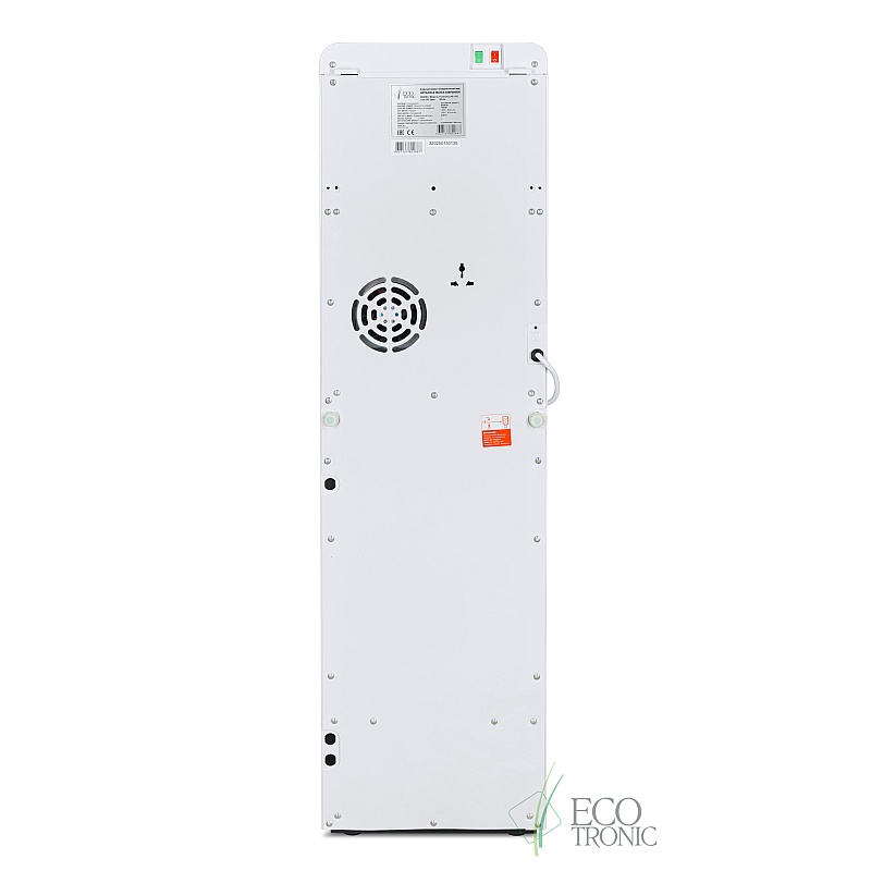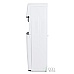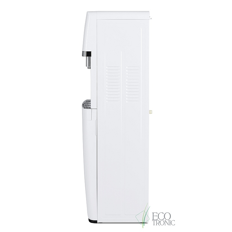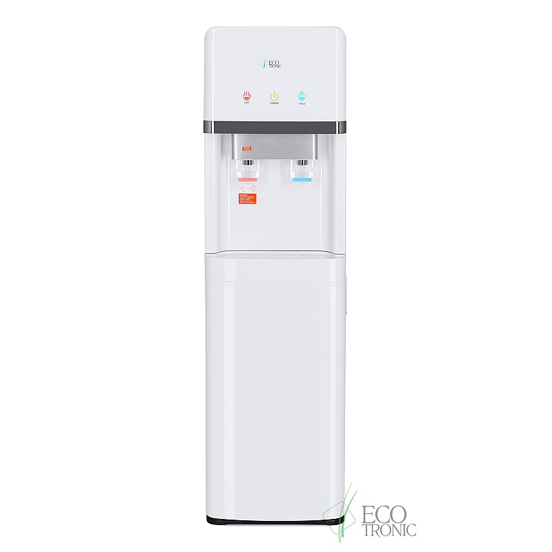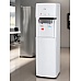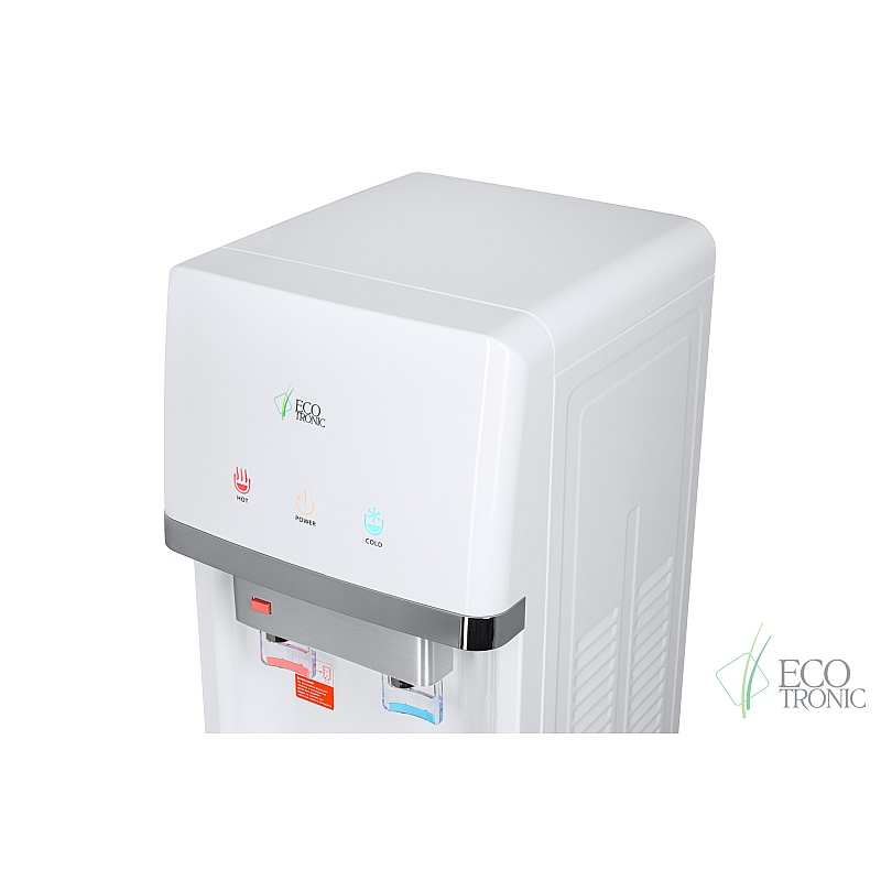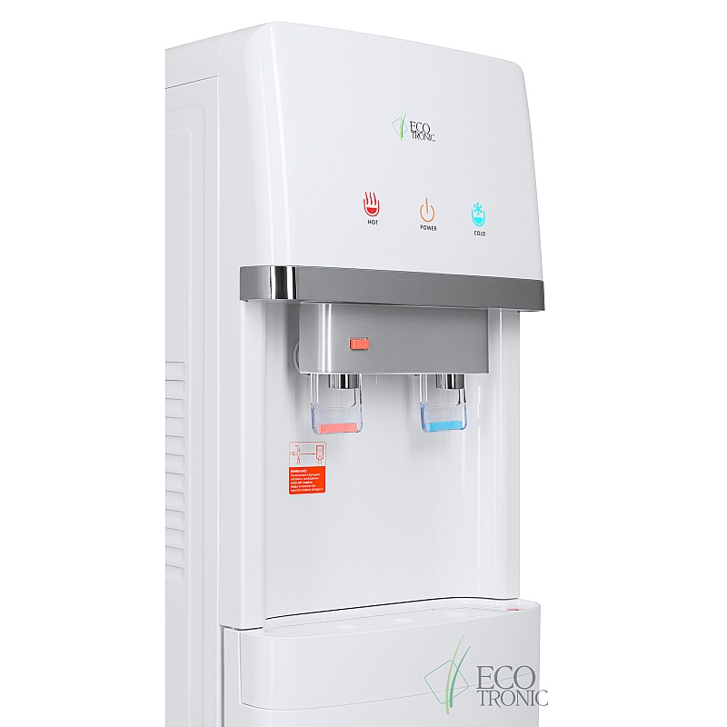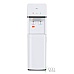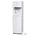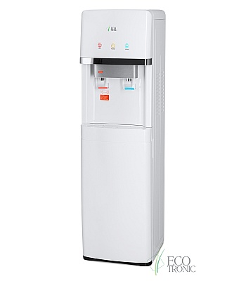 Напольный кулер с нижней загрузкой бутыли и электронным охлаждением. Корпус белого цвета с серебристыми вставками. Лоток водоприемника с поплавком перелива. Индикация режимов нагрева и охлаждения воды и работы аппарата. Краны "нажим кружкой", защита от ошпаривания на кране горячей воды.