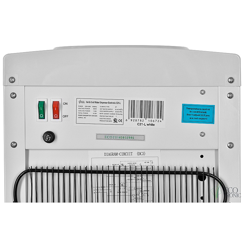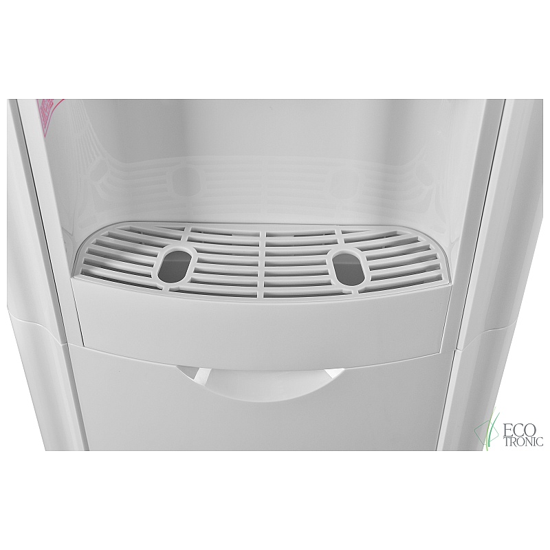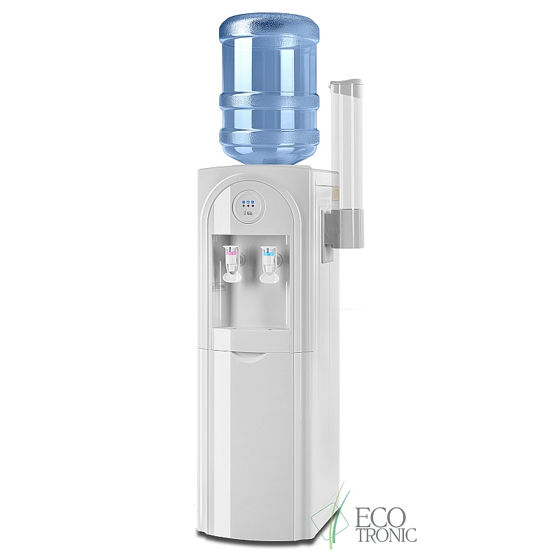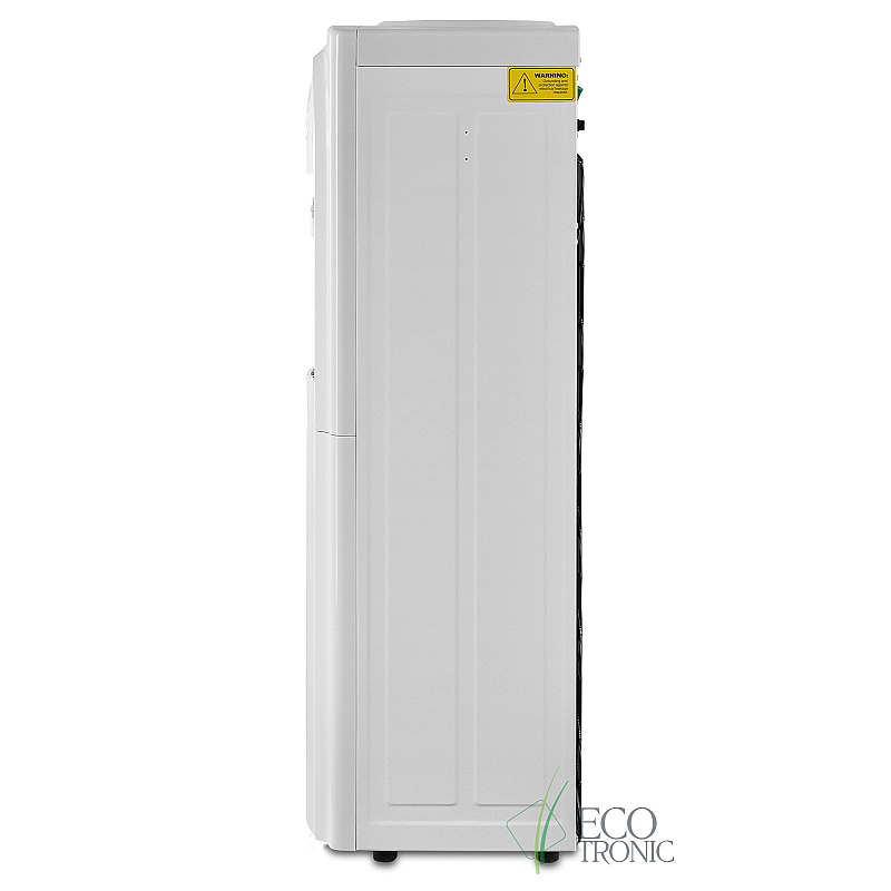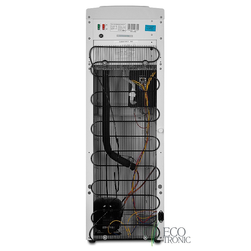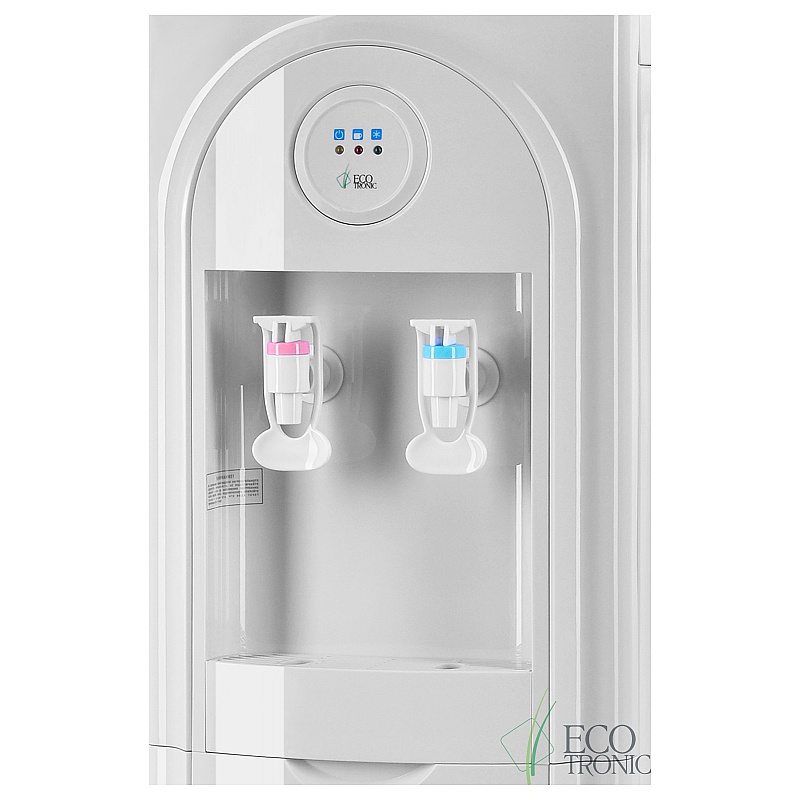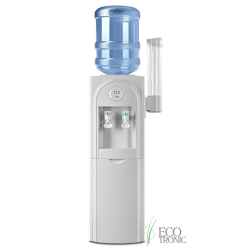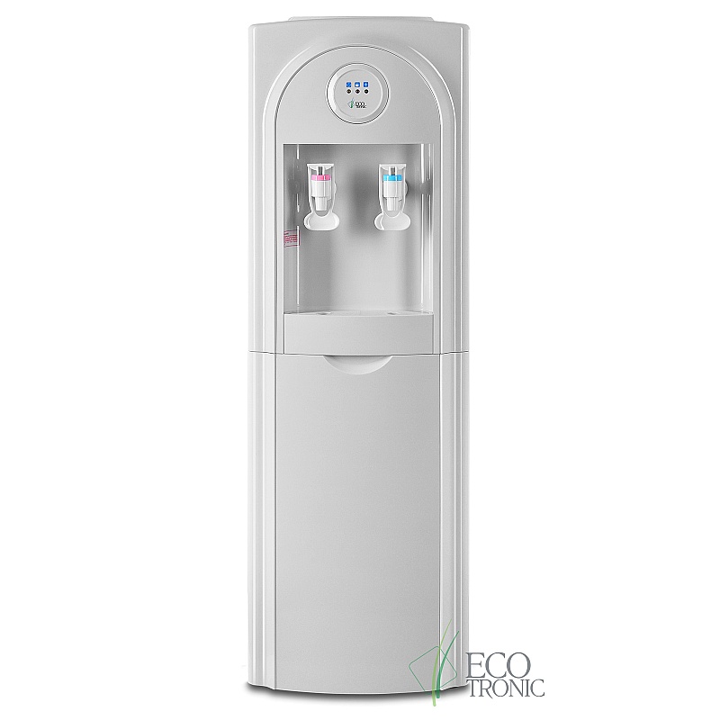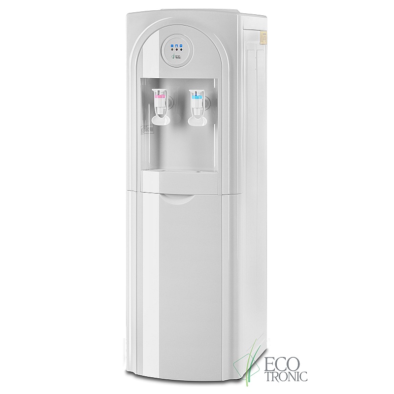 Кулер напольного типа с компрессорным охлаждением. Цвет: белый. Краны "нажим кружкой" без защиты. Индикация нагрева и охлаждения воды.