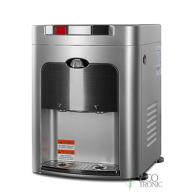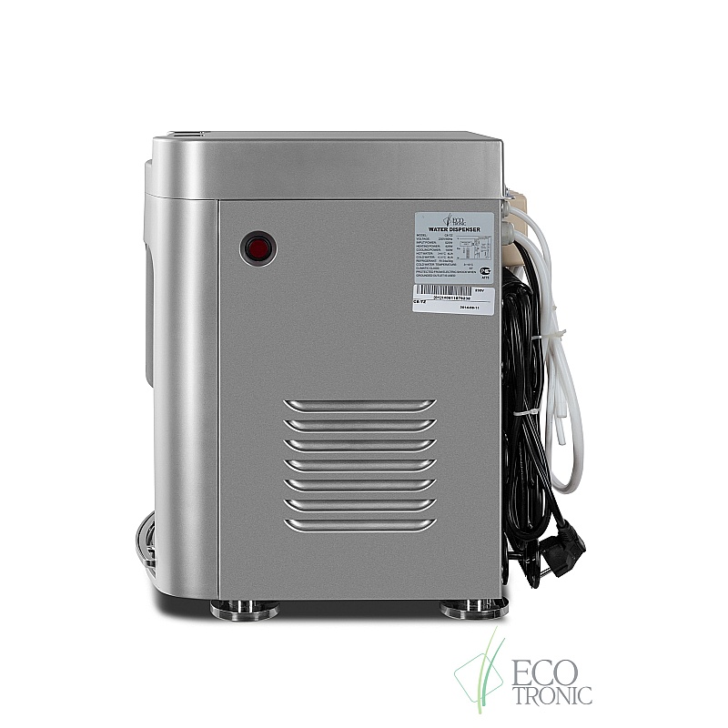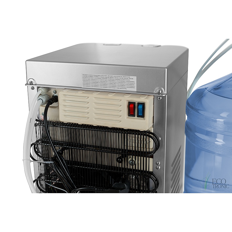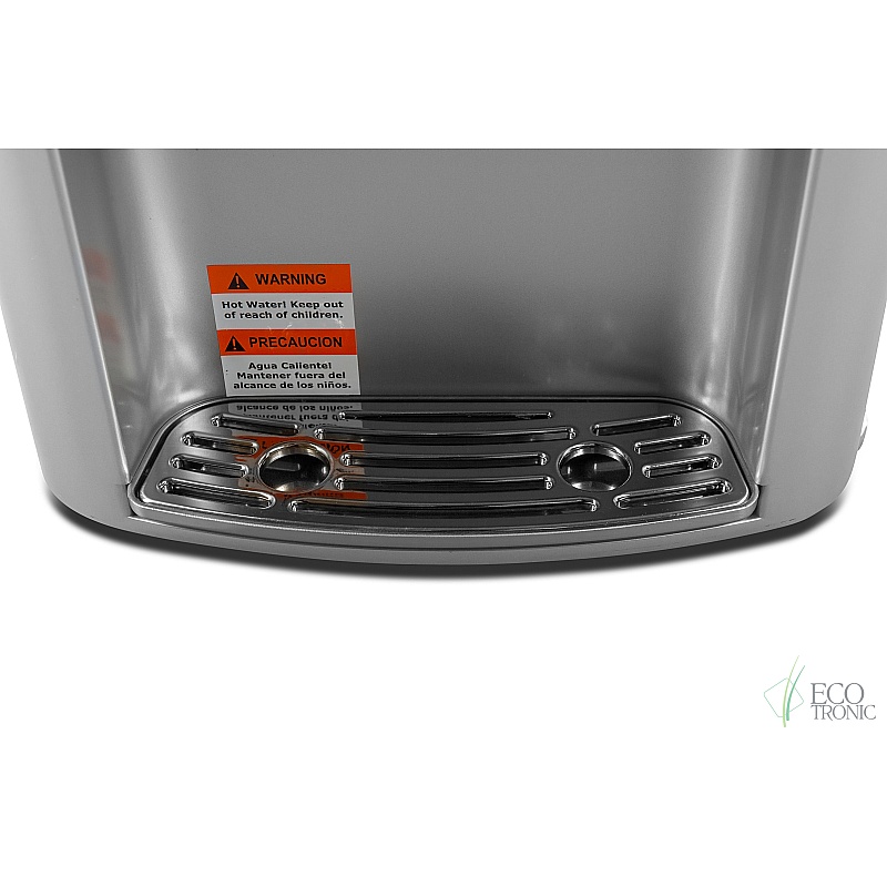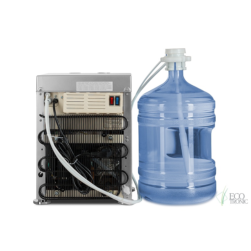 Настольный кулер с удаленной бутылью с компрессорным охлаждением – представитель моделей с дистанционным забором воды. Бутыль не имеет непосредственного контакта с корпусом, вода подается посредством заборной трубки с помповым типом фиксации. Аппарат серебристого цвета с никелированными вставками. Бак горячей воды с безотказным нагревателем нижнего крепления.