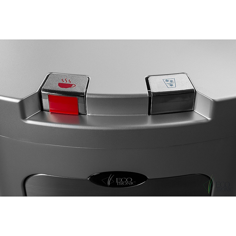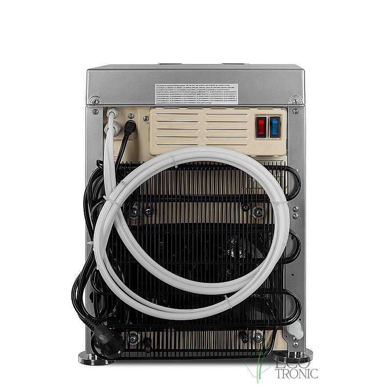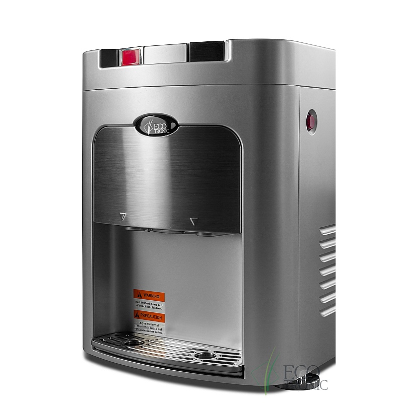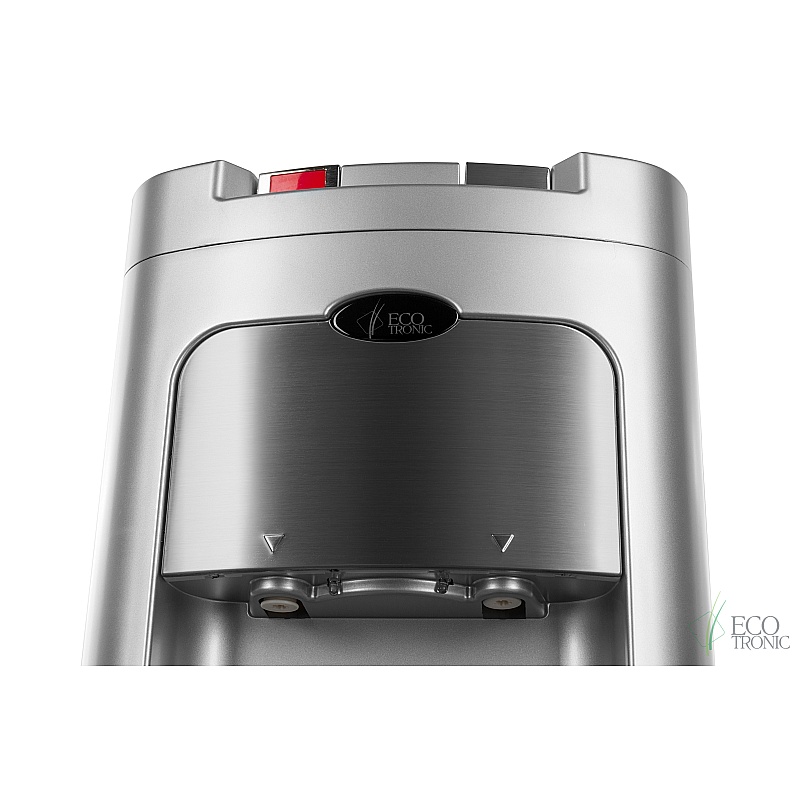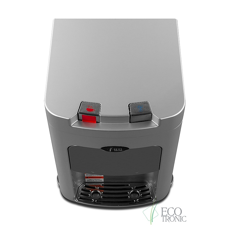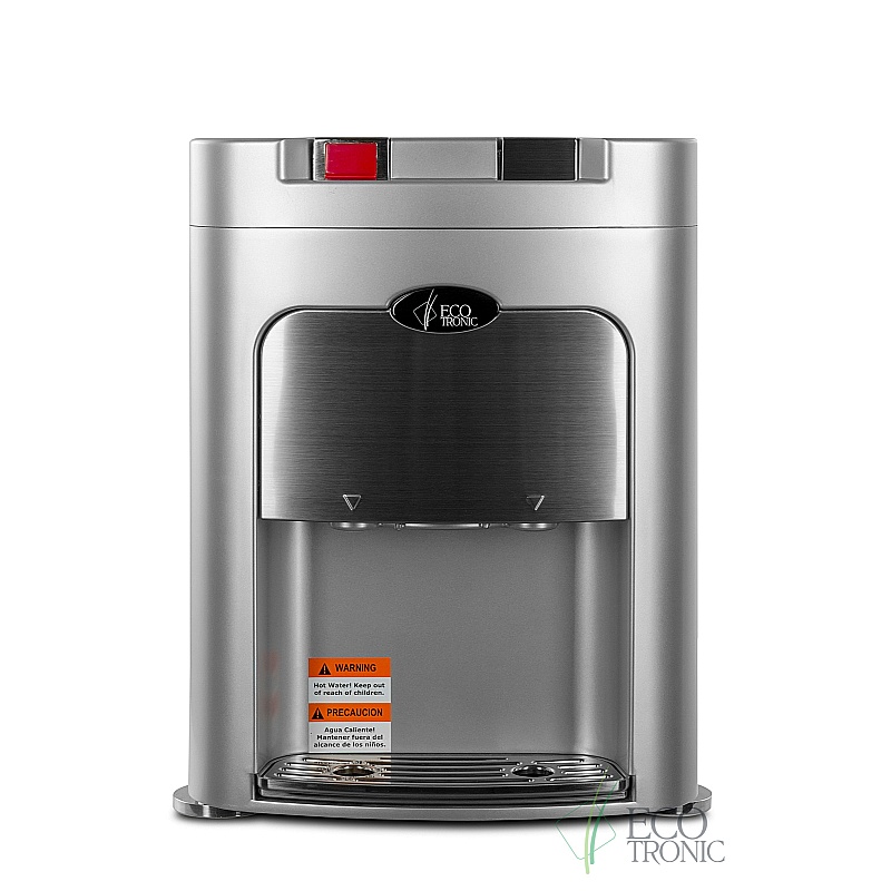 Настольный кулер с удаленной бутылью с компрессорным охлаждением – представитель моделей с дистанционным забором воды. Бутыль не имеет непосредственного контакта с корпусом, вода подается посредством заборной трубки с помповым типом фиксации. Аппарат серебристого цвета с никелированными вставками. Бак горячей воды с безотказным нагревателем нижнего крепления.