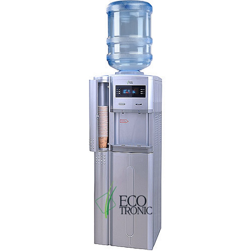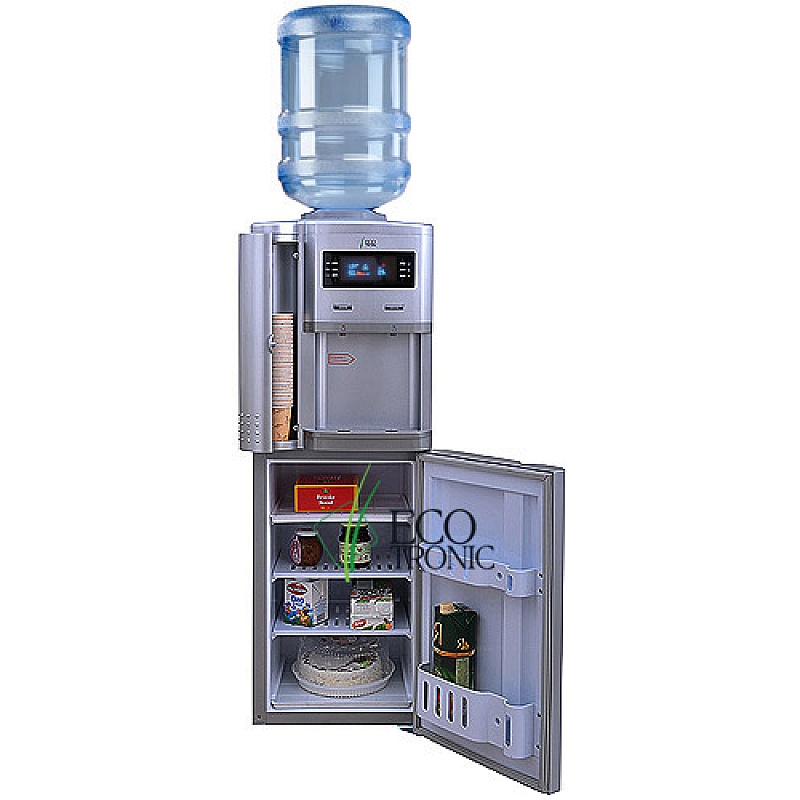 Серебристого цвета, отличительными особенностями которого стали встроенный отсек для одноразовых стаканчиков, а также наличие 60-литрового холодильника, что делает модель популярной и практичной в условиях офисных помещений. При этом кулер оснащен VFD-панелью управления температурой воды.