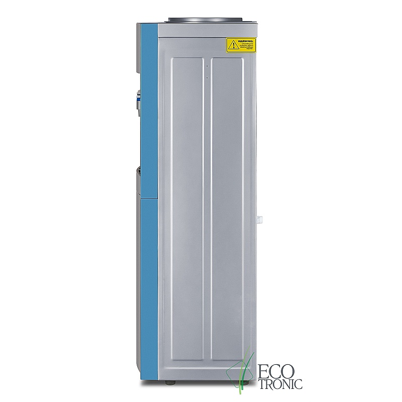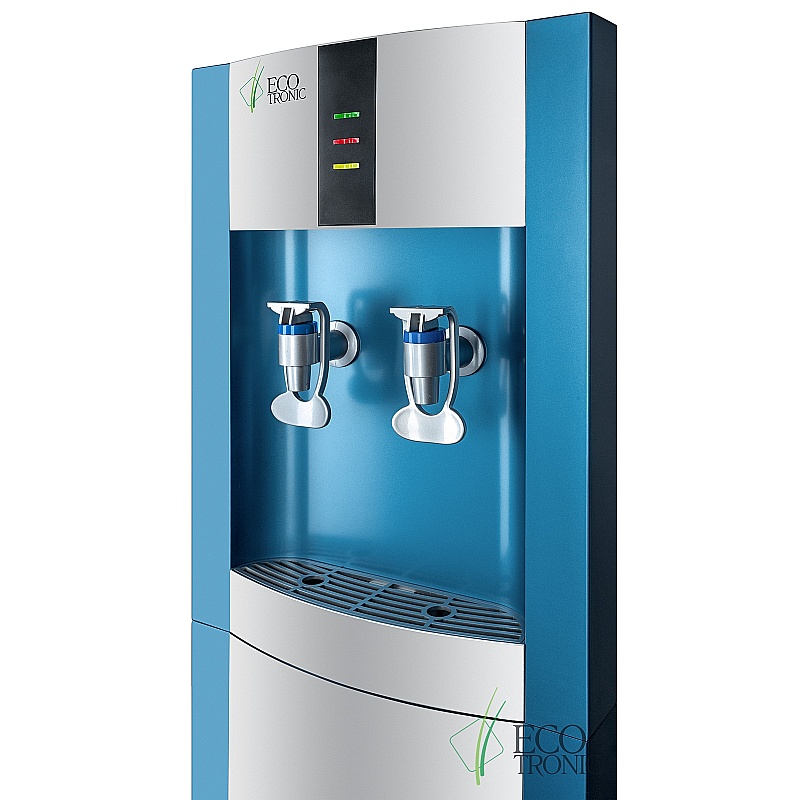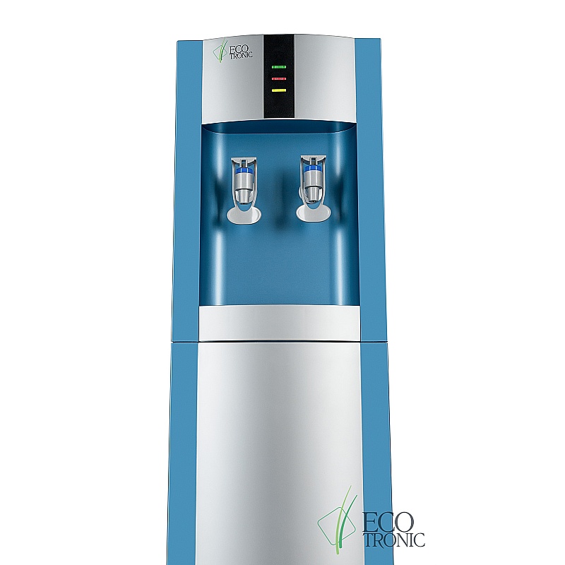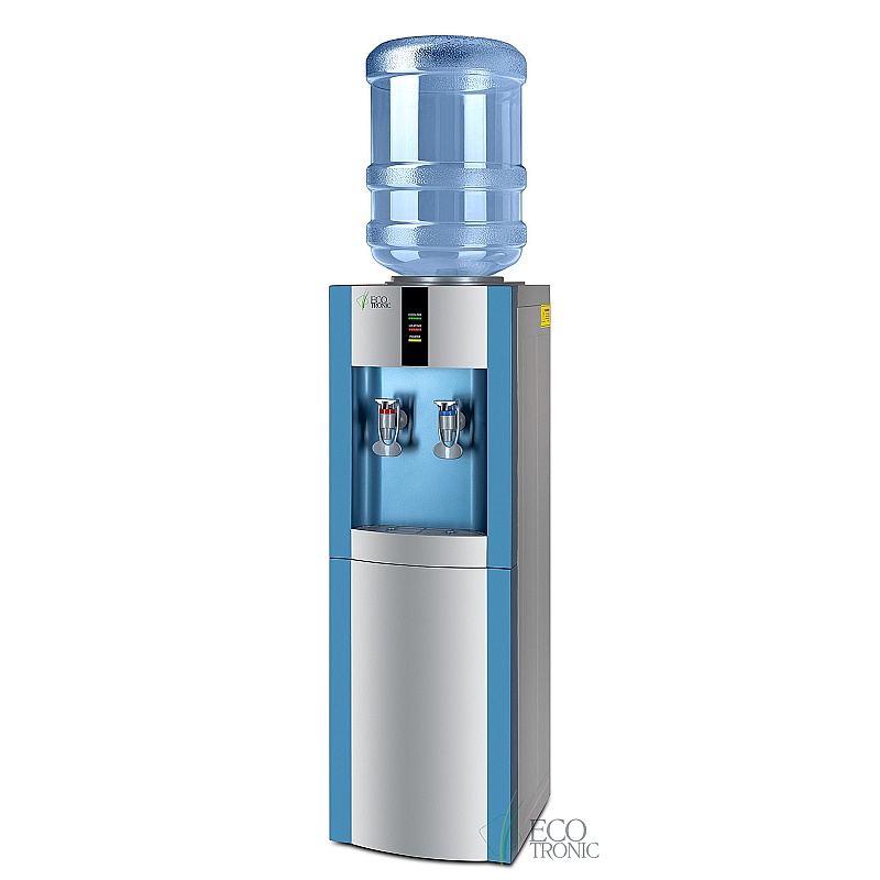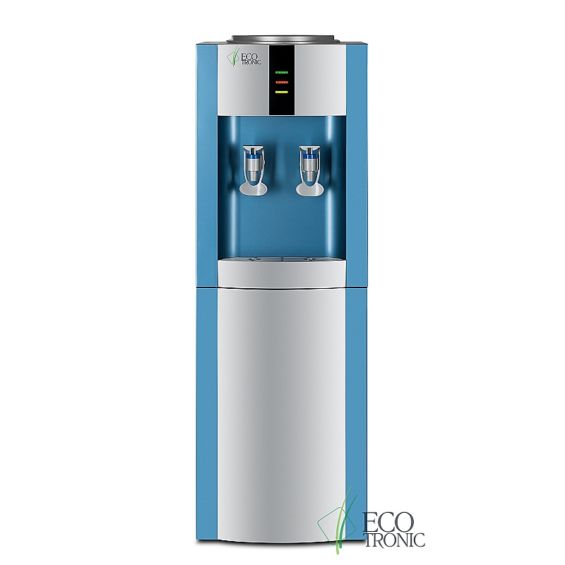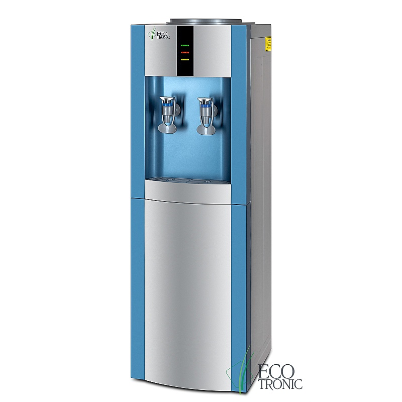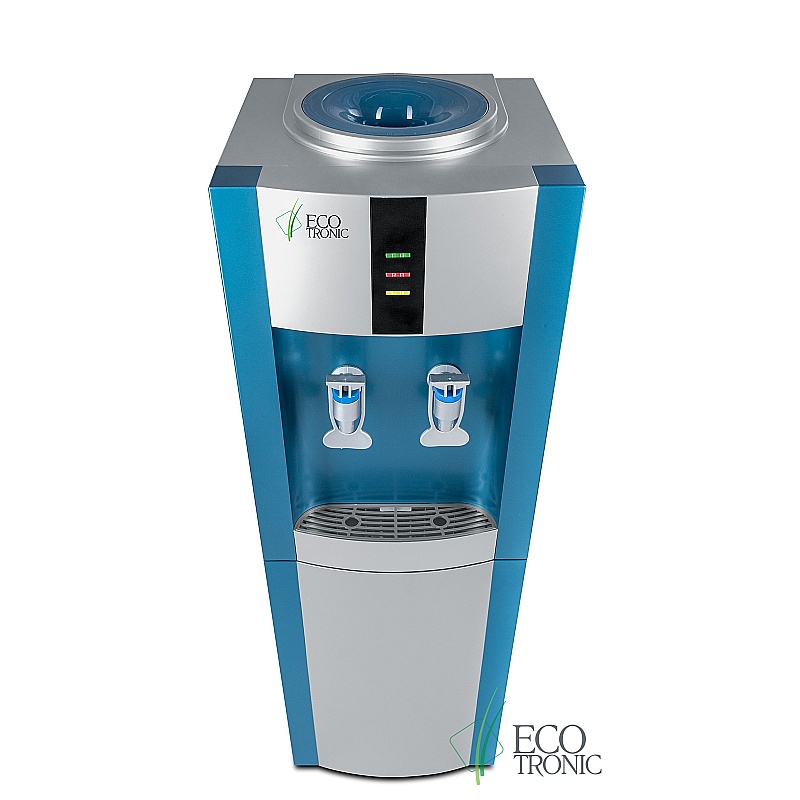 Водораздатчик, бюджетная модель напольной серии кулеров H1 от Ecotronic. Без охлаждения и нагрева воды. Раздает воду комнатной температуры. Кулер совместимсо всеми бутылями 19л. Корпус серебристого цвета, передняя панель сине-зеленая, с серебряной вставкой.