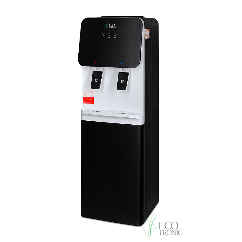 Компактный кулер для воды без охлаждения, только с нагревом и небольшим шкафчиком в нижней части. Корпус черного цвета с белой вставкой в области кранов подачи воды. Индикация режимов работы, нагрева и готовности воды. Краны "нажим кружкой". Высота аппарата 0.85м.