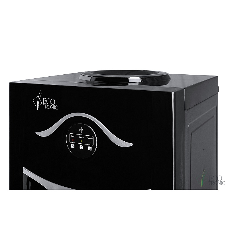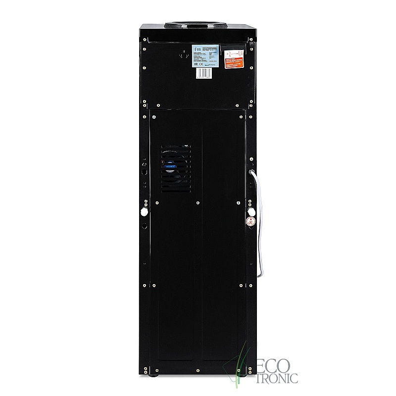 Напольный кулер со шкафчиком и электронным охлаждением воды. Корпус черного цвета с серебристой вставкой на лицевой панели. Шкафчик на 7л для хранения. Краны типа "нажим кружкой". Индикация на лицевой панели. Отдельные выключатели на нагрев и охлаждение на задней стенке. Бак горячей воды - 0.8 л, бак холодной воды - 0,6 л.