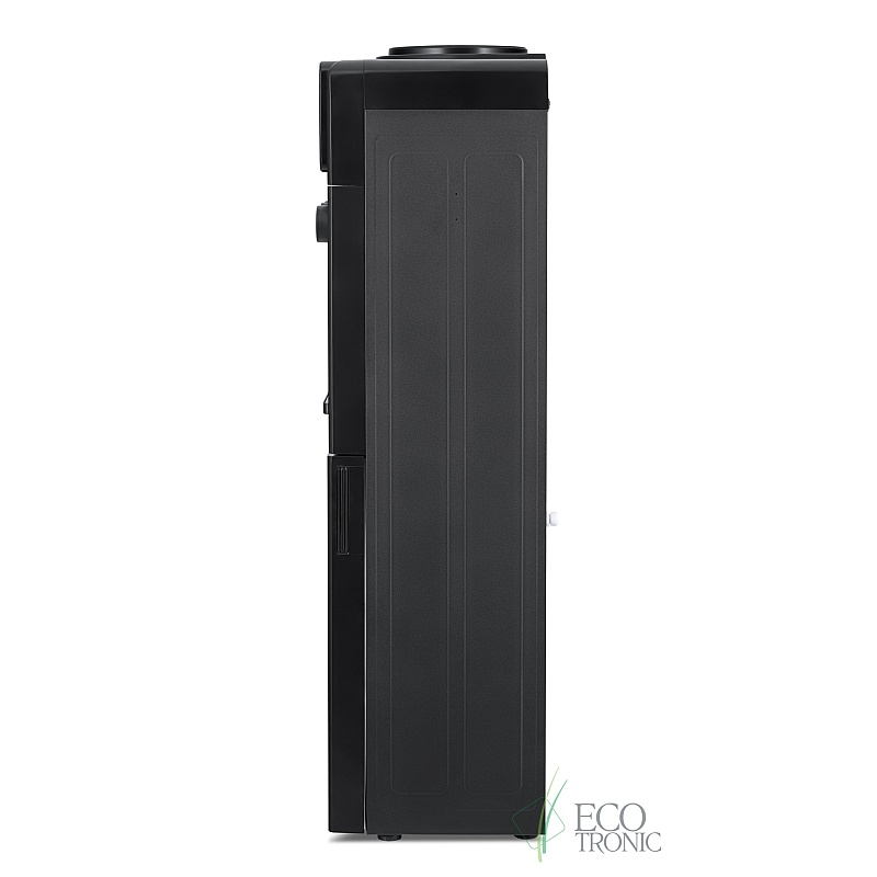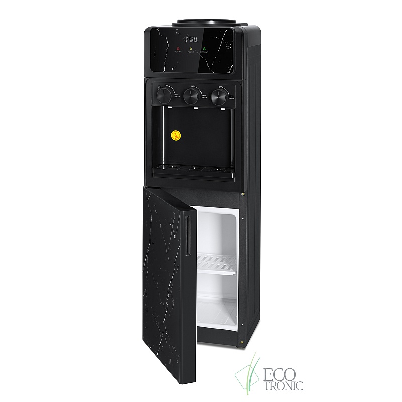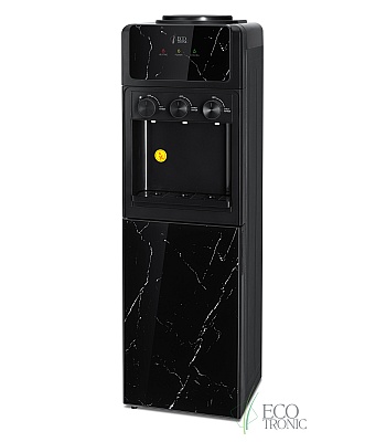 Напольный кулер с электронным охлаждением и функциональным шкафчиком для хранения в нижней части. Электронное охлаждение. Поворотные краны подачи воды, три крана: для горячей воды, холодной и воды комнатной температуры. Корпус чёрного цвета с черной стеклянной вставкой под мрамор. В верхней части расположены индикаторы подключения к сети, нагрева и охлаждения.