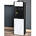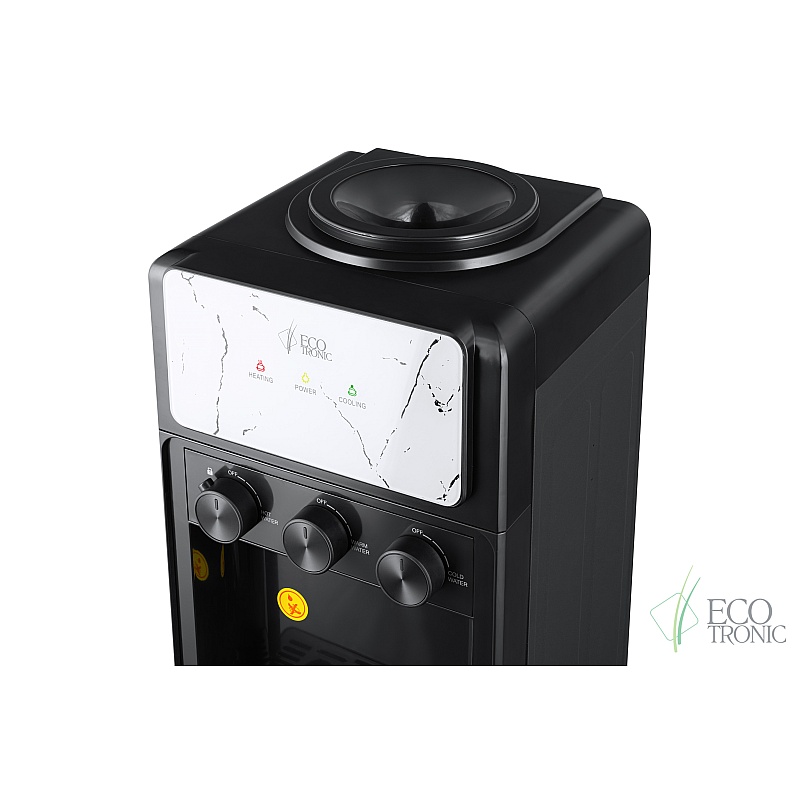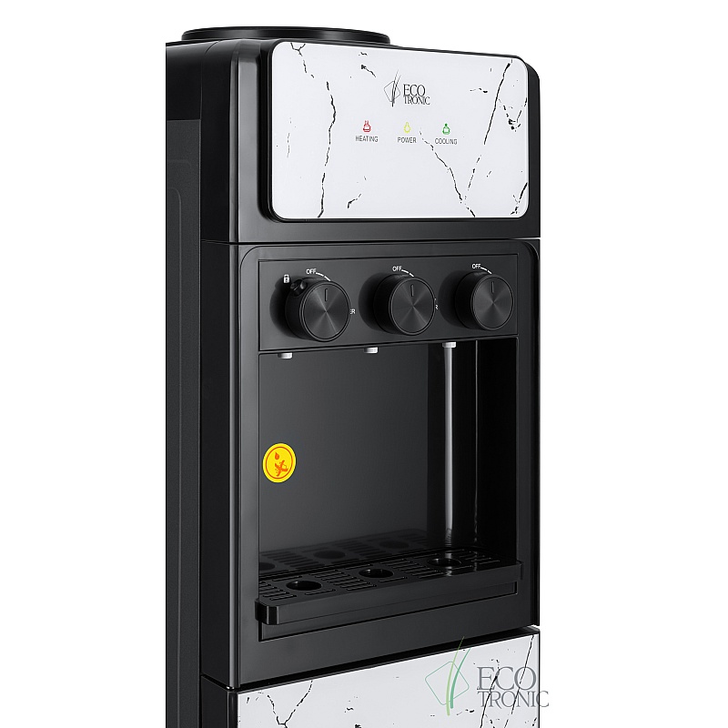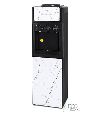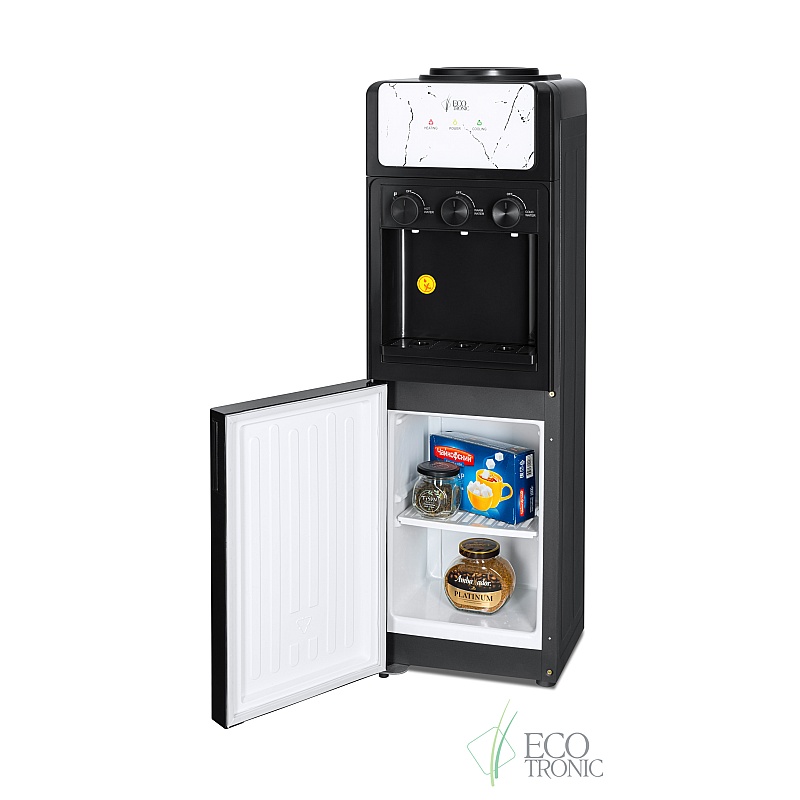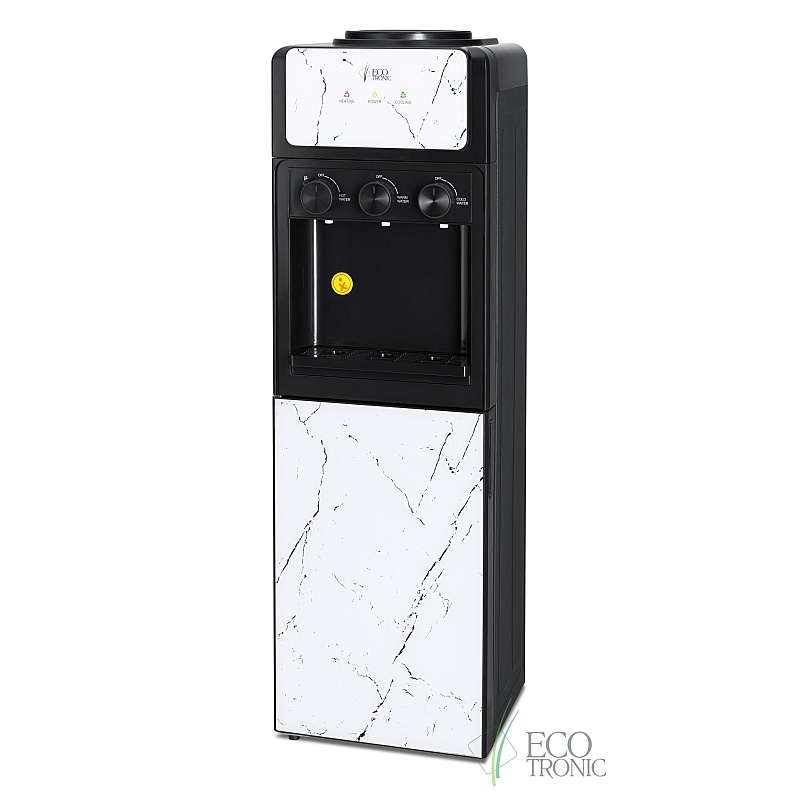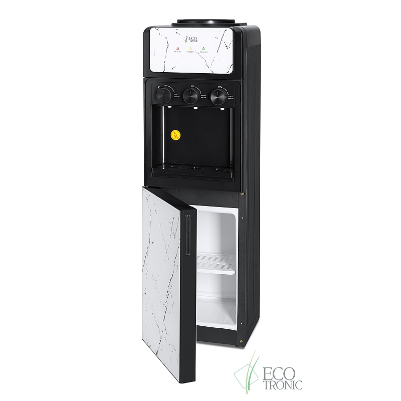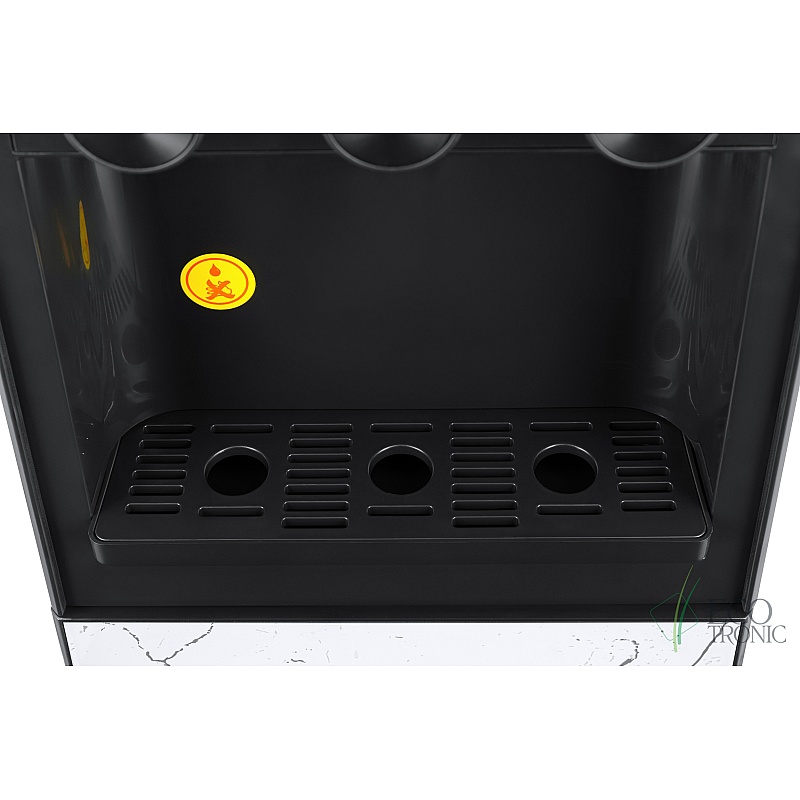 Кулер с электронным охлаждением и функциональным шкафчиком для хранения в нижней части. Электронное охлаждение. Поворотные краны подачи воды, три крана: для горячей воды, холодной и воды комнатной температуры. Корпус белого цвета с черной стеклянной вставкой под мрамор. В верхней части расположены индикаторы подключения к сети, нагрева и охлаждения.
