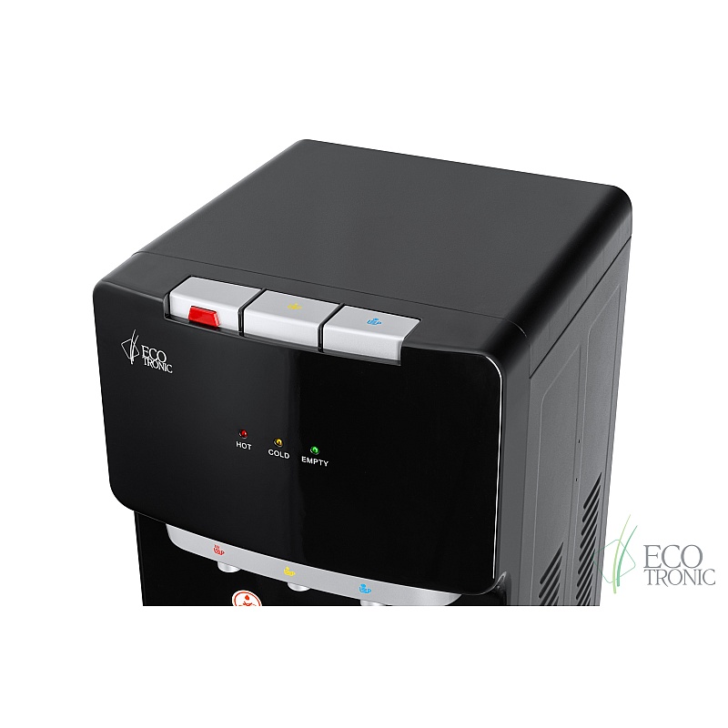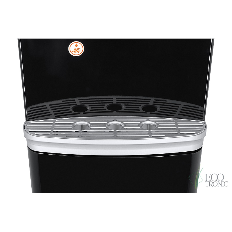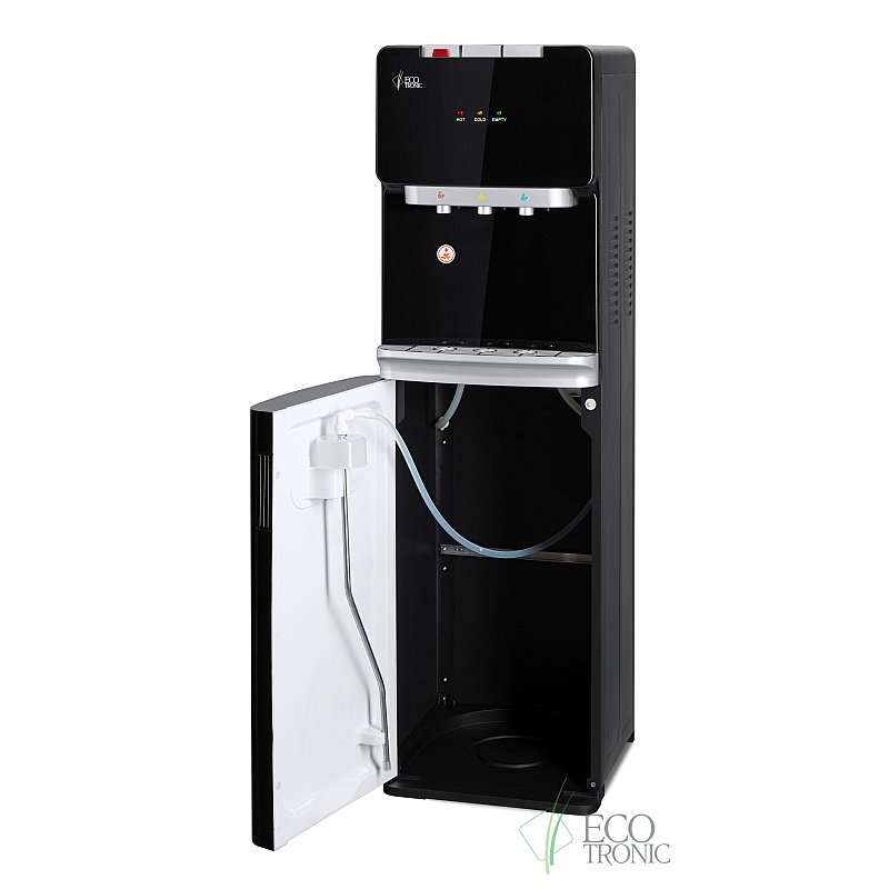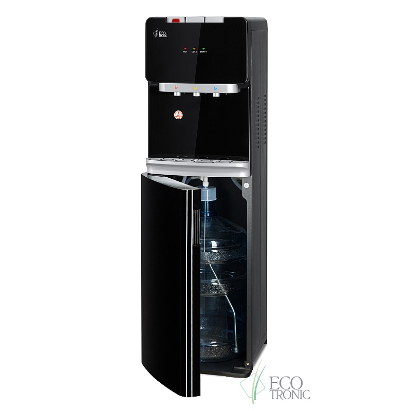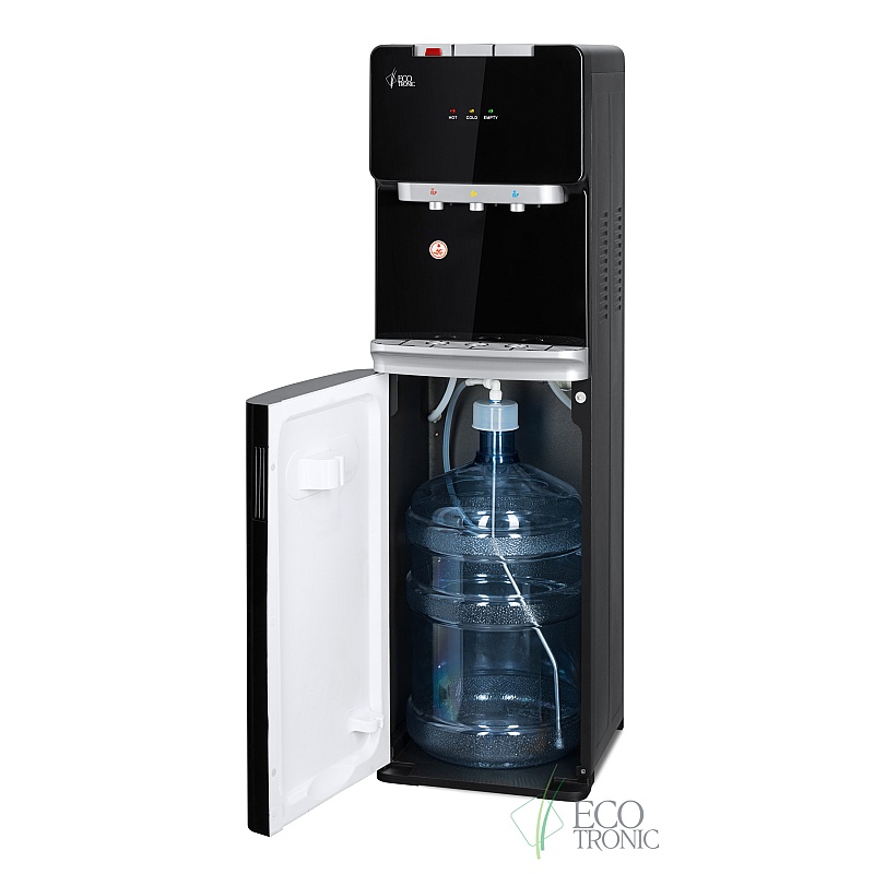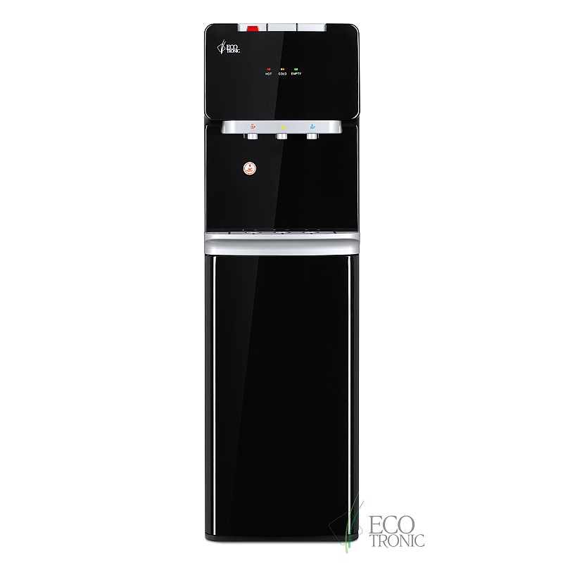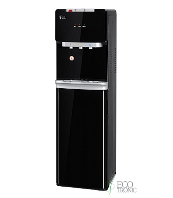 Кулер с нижней загрузкой бутыли и электронным охлаждением. Три крана подачи воды: горячей, холодной и комнатной температуры. Защита от ожогов на кране горячей воды. Отсек для бутыли в нижней части корпуса. Светодиодная индикация режимов нагрева и охлаждения воды, а также отсутствия воды в бутыли. Корпус черного цвета. Тип кранов подачи воды - "клавиши".