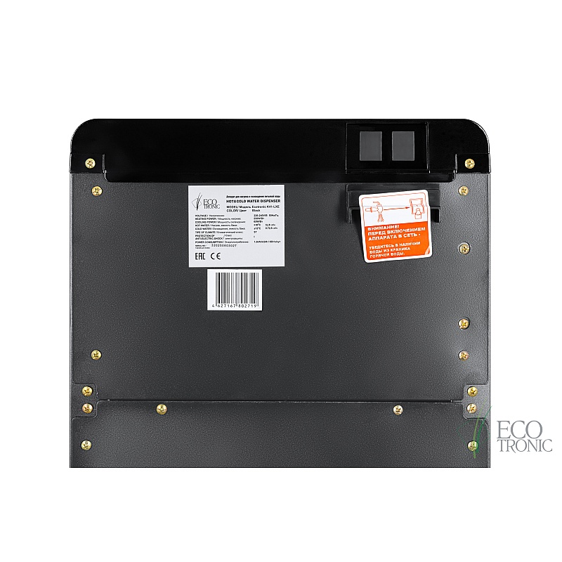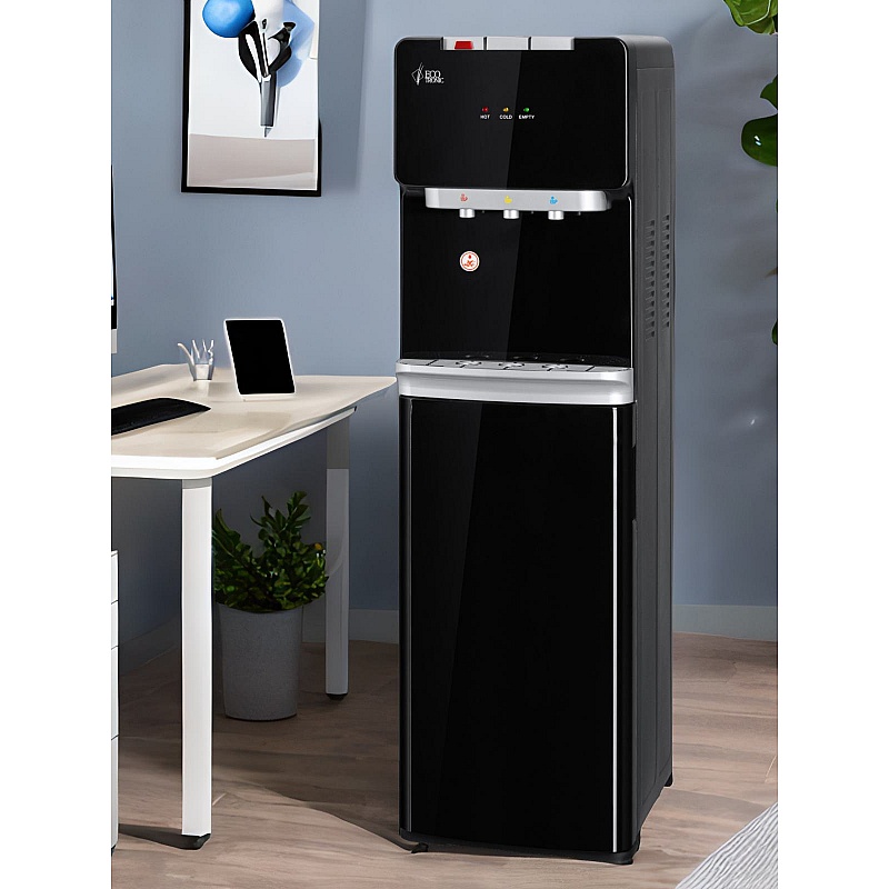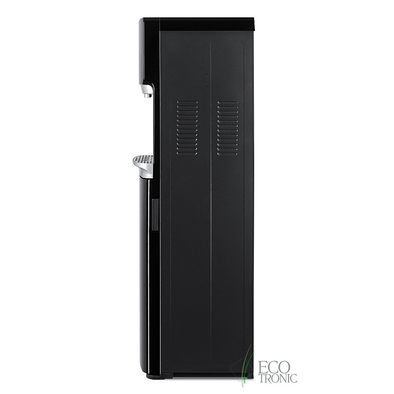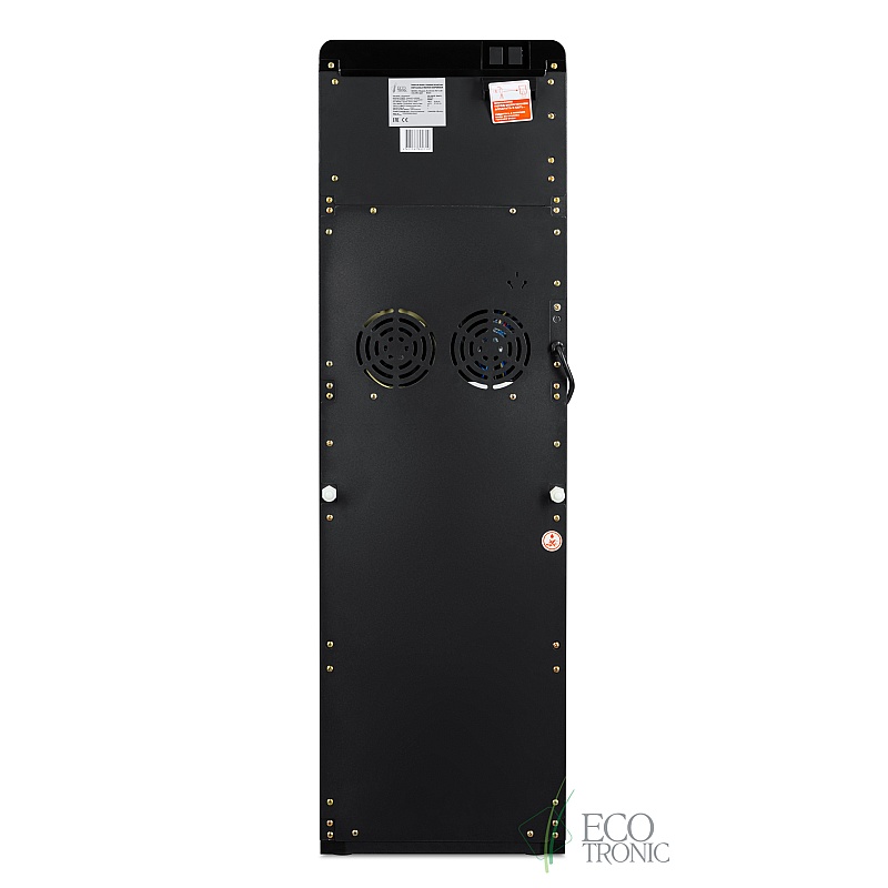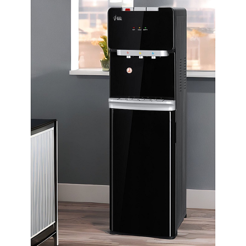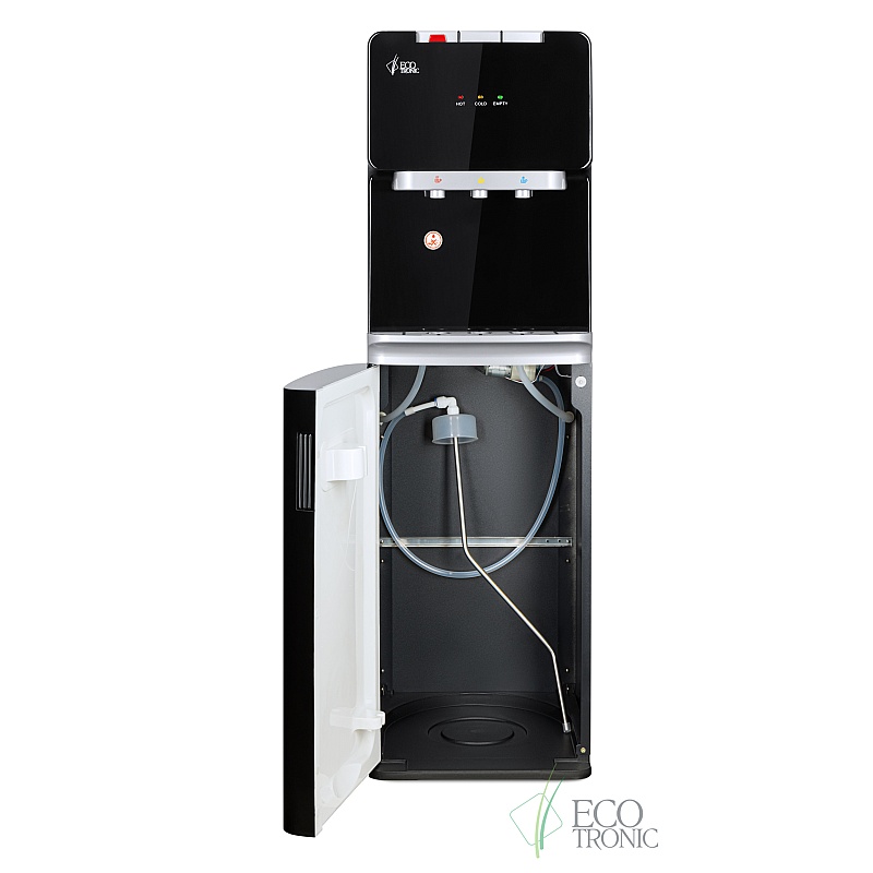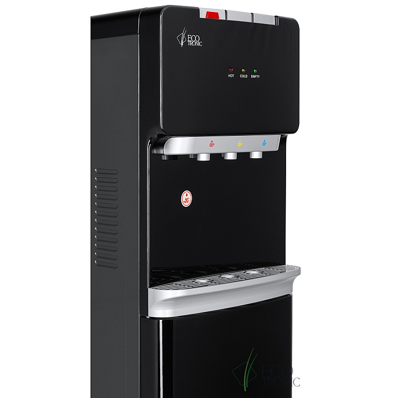 Кулер с нижней загрузкой бутыли и электронным охлаждением. Три крана подачи воды: горячей, холодной и комнатной температуры. Защита от ожогов на кране горячей воды. Отсек для бутыли в нижней части корпуса. Светодиодная индикация режимов нагрева и охлаждения воды, а также отсутствия воды в бутыли. Корпус черного цвета. Тип кранов подачи воды - "клавиши".