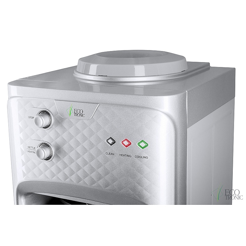 Серебристый цвет, нижняя загрузка бутыли, электронное охлаждение. Нагрев воды осуществляется при помощи компактного чайника, емкостью 1 литр. Стильный встроенный чайник (кипячение до 100oС), шкафчик с функцией озонирования, индикация режимов работы и готовности воды. Цвет корпуса: серебристый. Подача воды с помощью краников типа "нажим кружкой".
