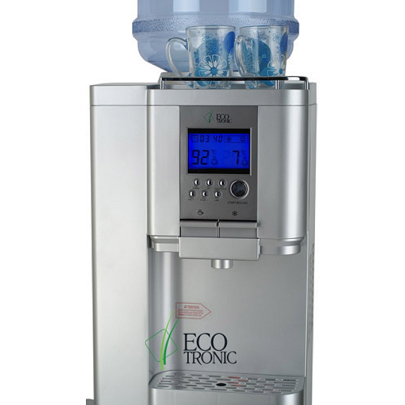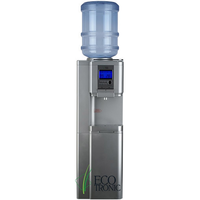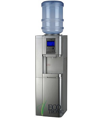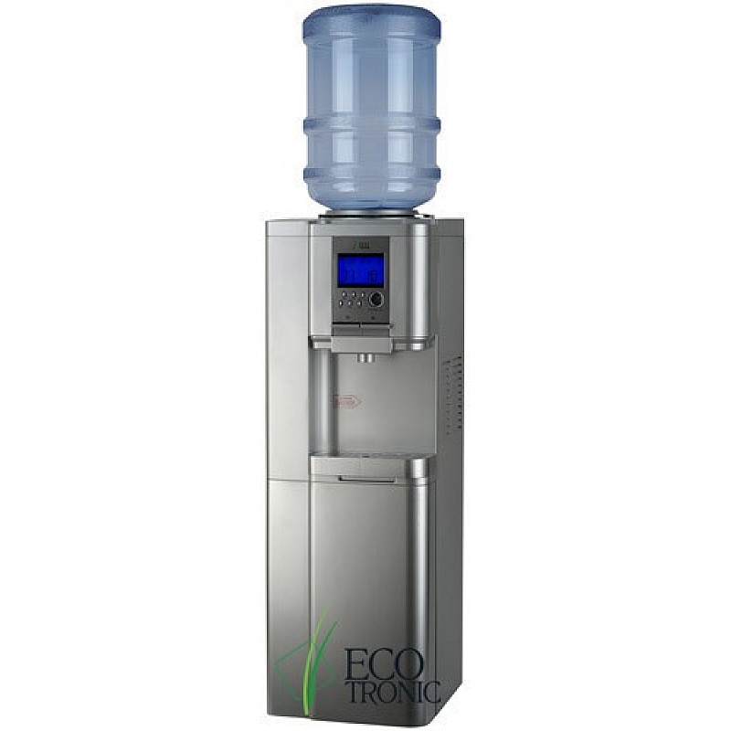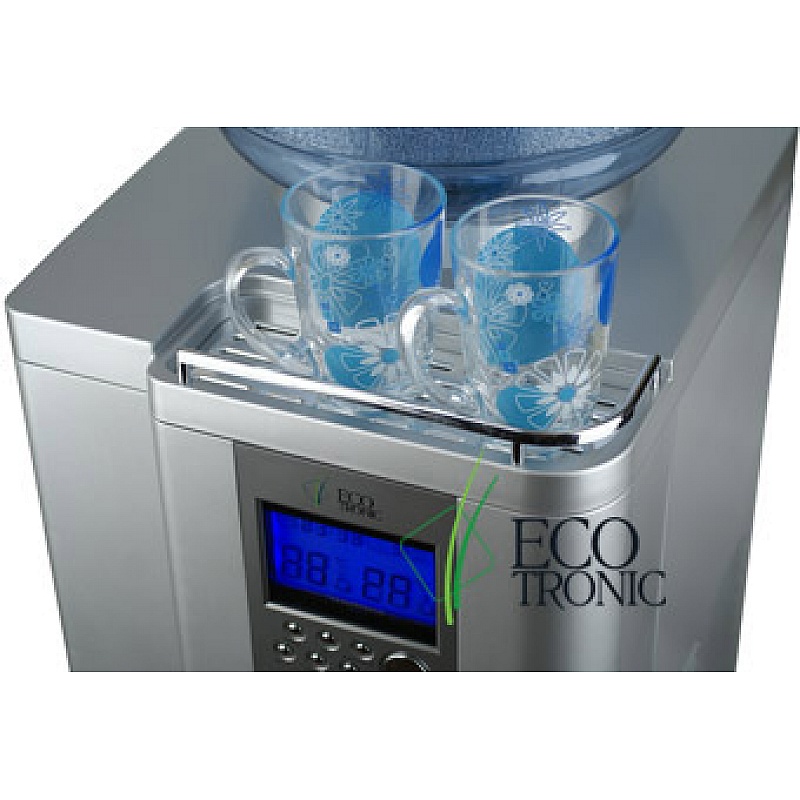 Оригинальная модель в серебристом исполнении с 16-литровым шкафчиком-озонатором, оснащенная панелью с функциями управления температурным режимом и быстрого нагрева. Подача воды осуществляется с помощью электронных кнопок. В верхней части кулера имеется небольшая зона для стаканчиков.