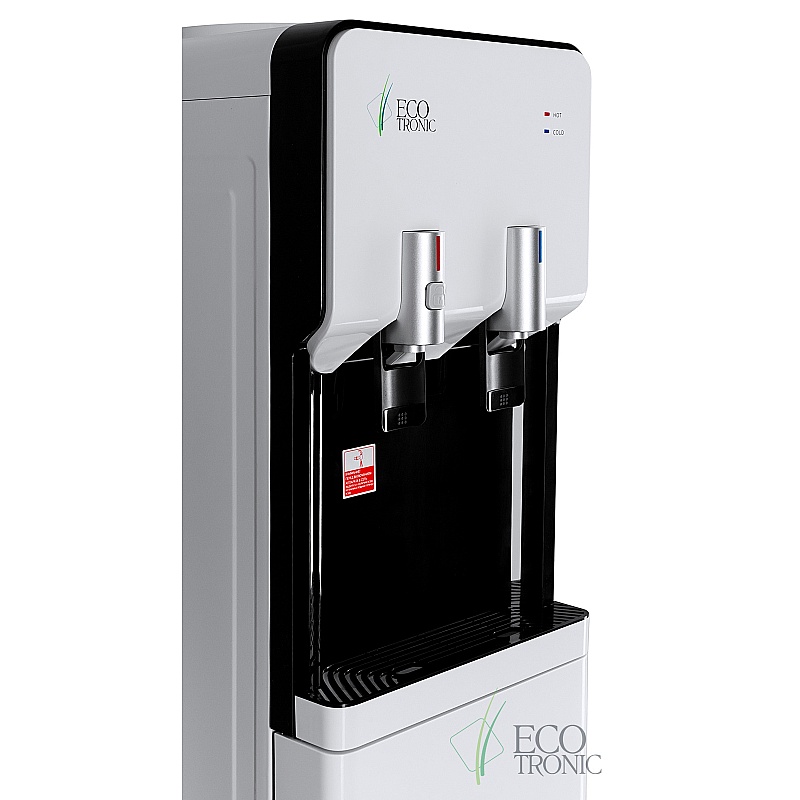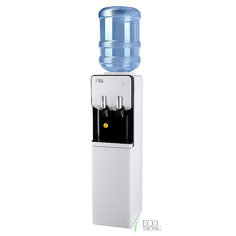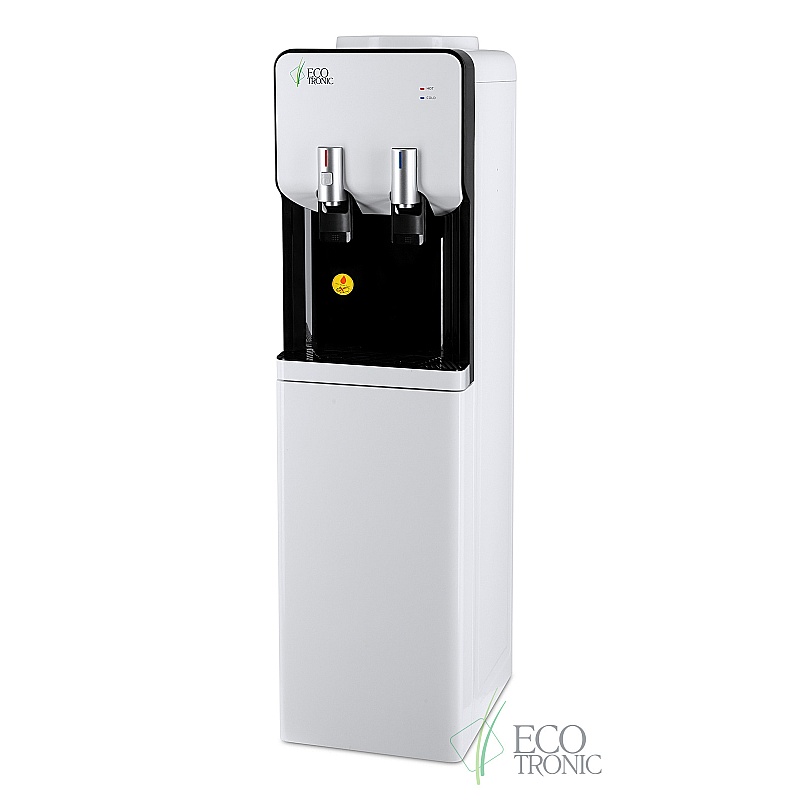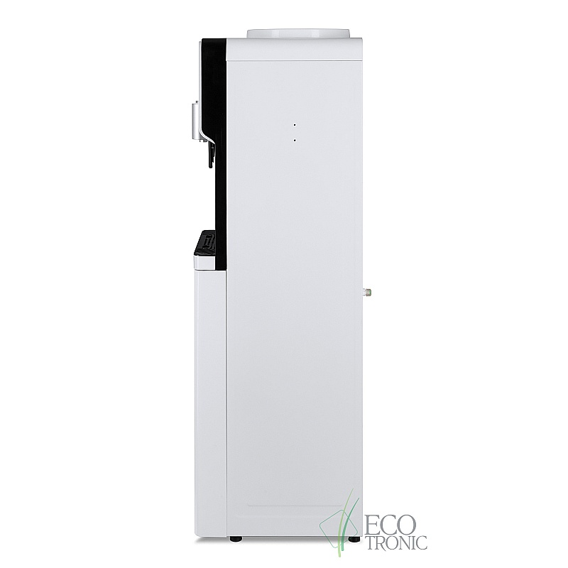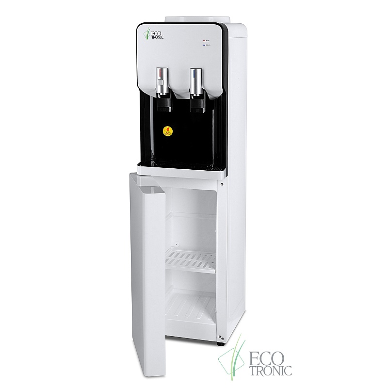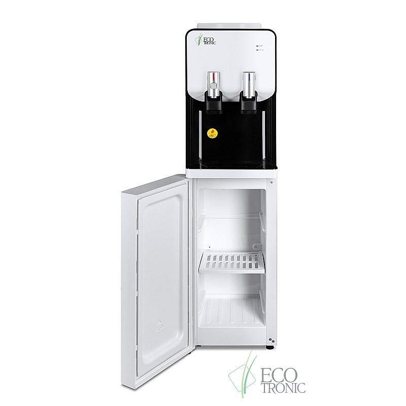 Бюджетный кулер со шкафчиком для хранения кофе, чая, стаканчиков и других принадлежностей. Электронное охлаждение. Корпус черно-белого цвета. Индикация режимов нагрева, охлаждения и готовности воды, а также отсутствия воды в бутыли. Краны нажим кружкой. Горячий кран с защитой от случайного нажатия (защита от детей). Есть возможность отдельного отключения горячей и холодной воды на задней панели.