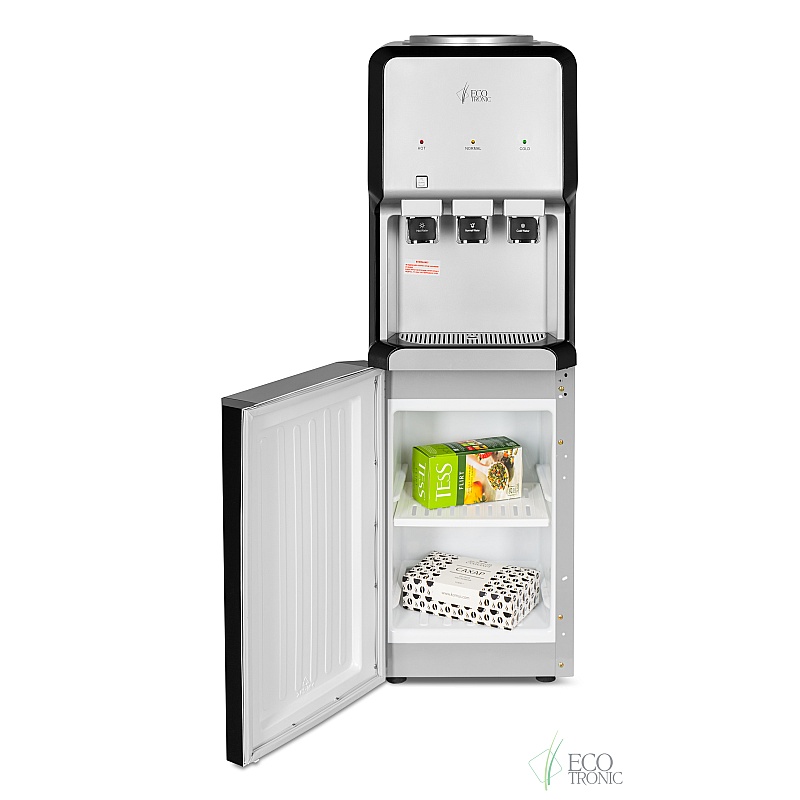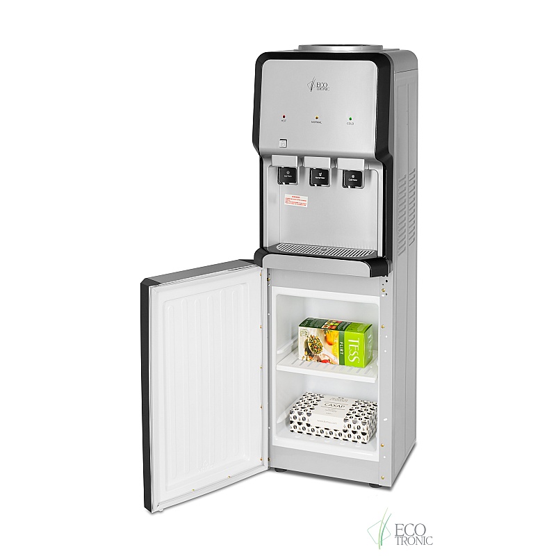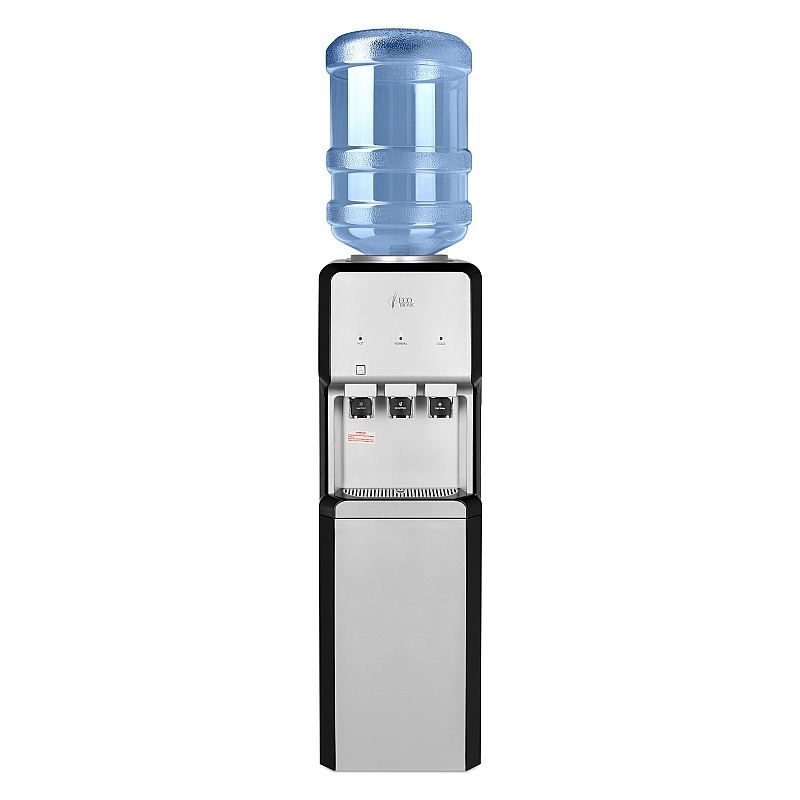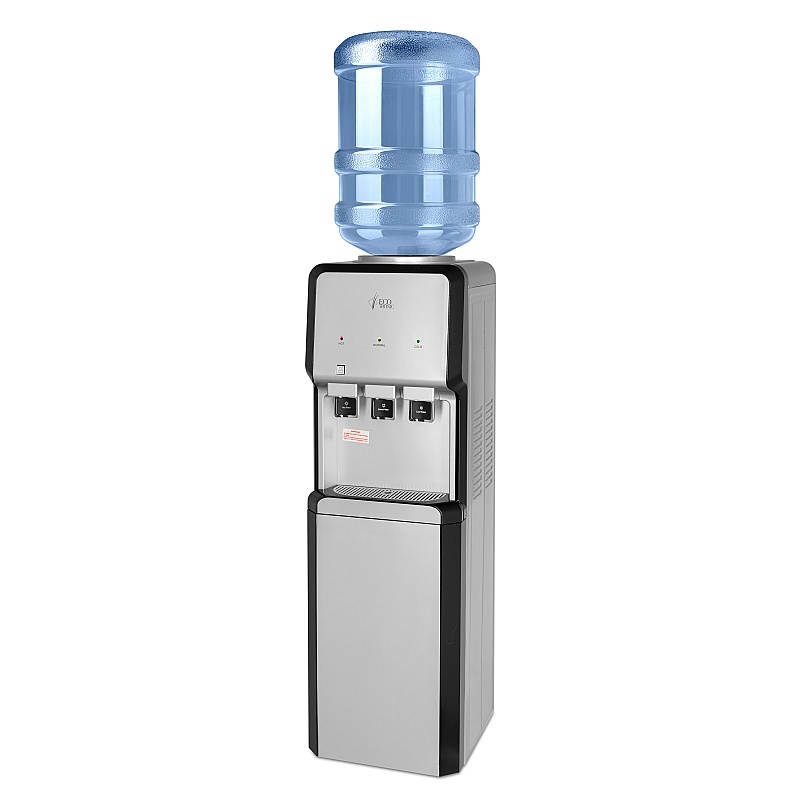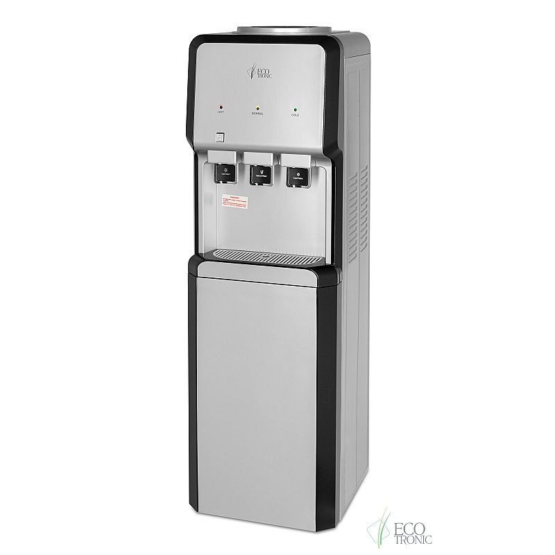 Недорогой напольный кулер с электронным охлаждением и шкафчиком в нижней части. Три крана типа "нажим кружкой" для подачи воды (горячая/комнатной температуры/холодная). Защита на кране горячей воды. Корпус серебристого цвета с черным декором на передней панели. В верхней части расположены индикаторы нагрева, охлаждения и готовности.