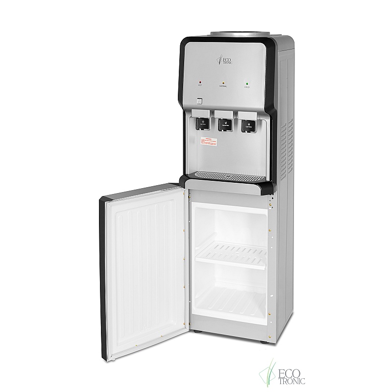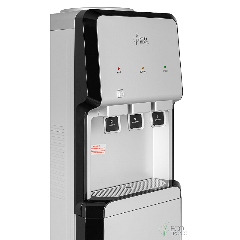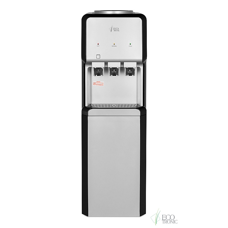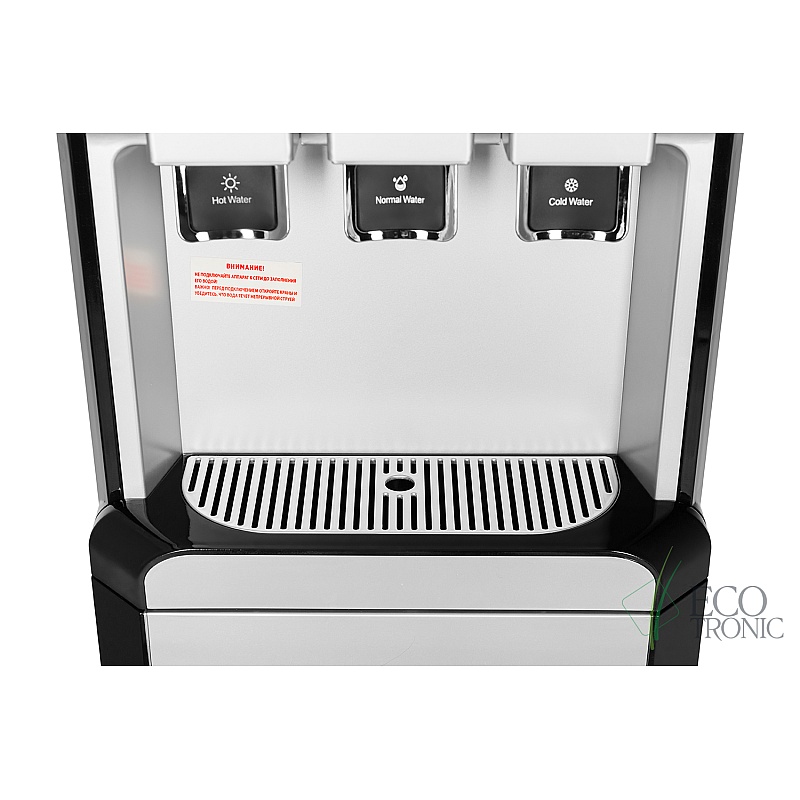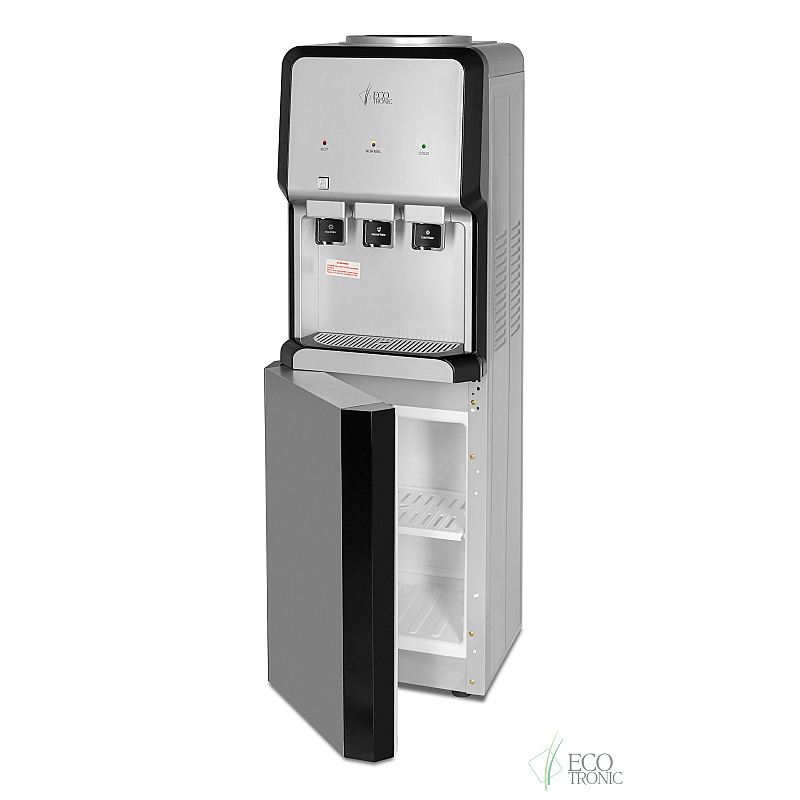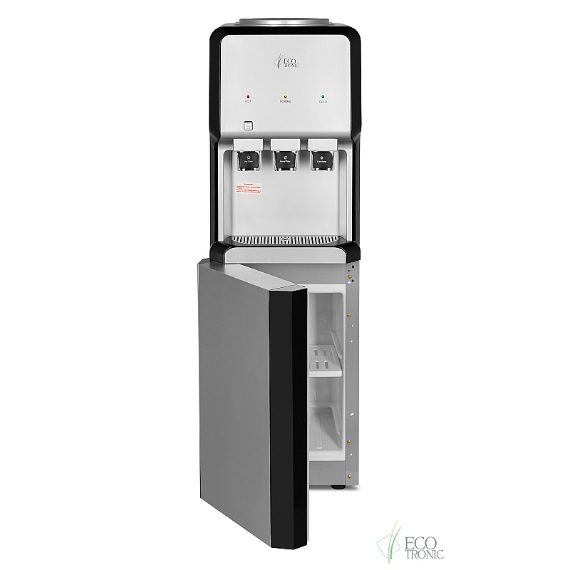 Недорогой напольный кулер с электронным охлаждением и шкафчиком в нижней части. Три крана типа "нажим кружкой" для подачи воды (горячая/комнатной температуры/холодная). Защита на кране горячей воды. Корпус серебристого цвета с черным декором на передней панели. В верхней части расположены индикаторы нагрева, охлаждения и готовности.