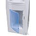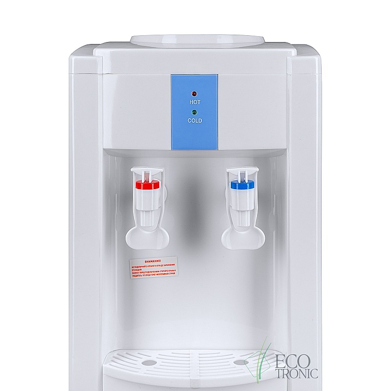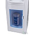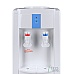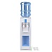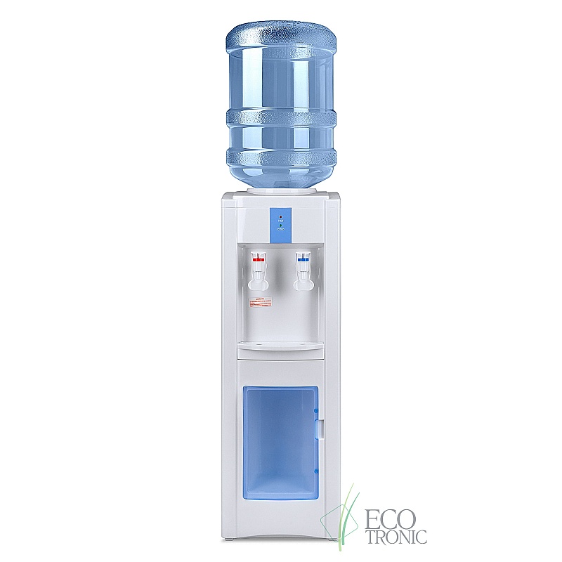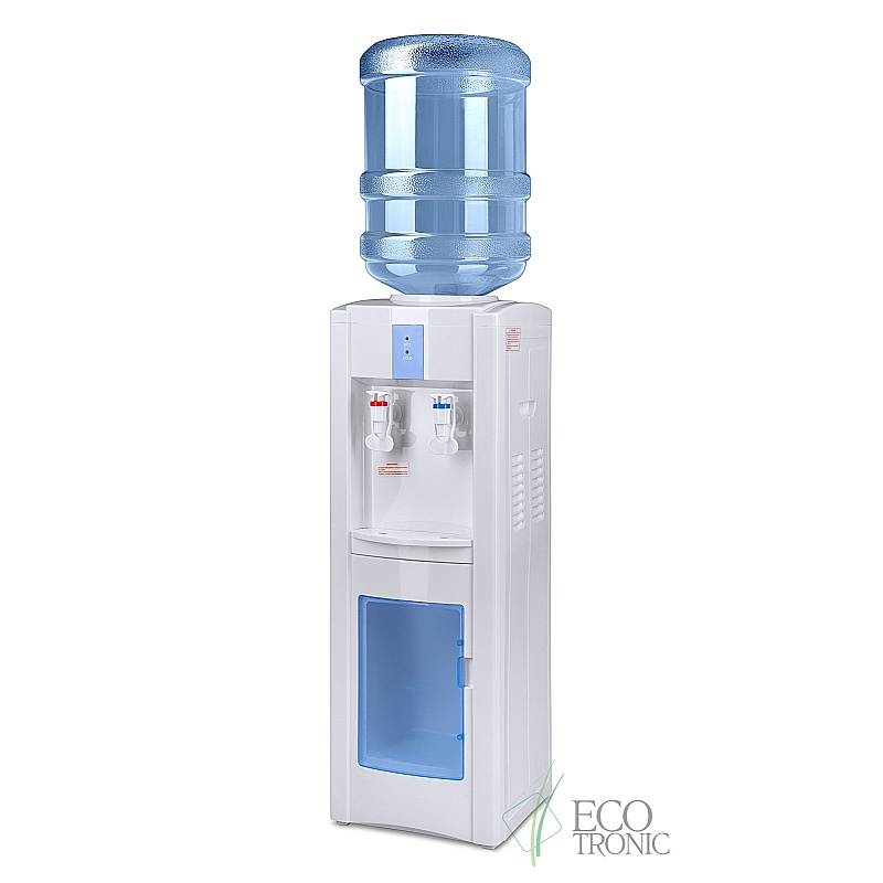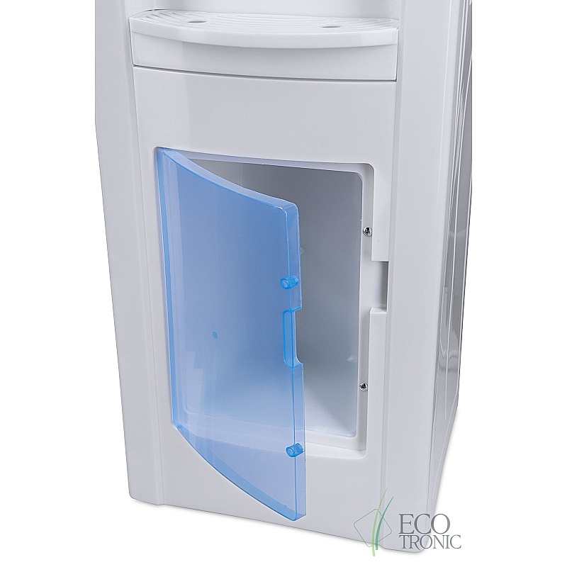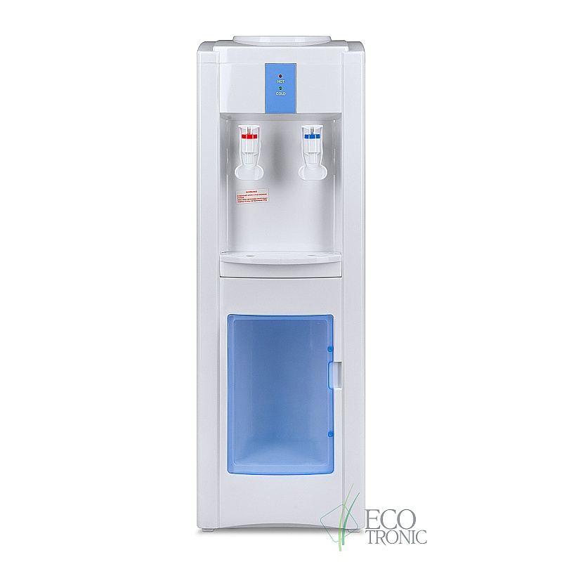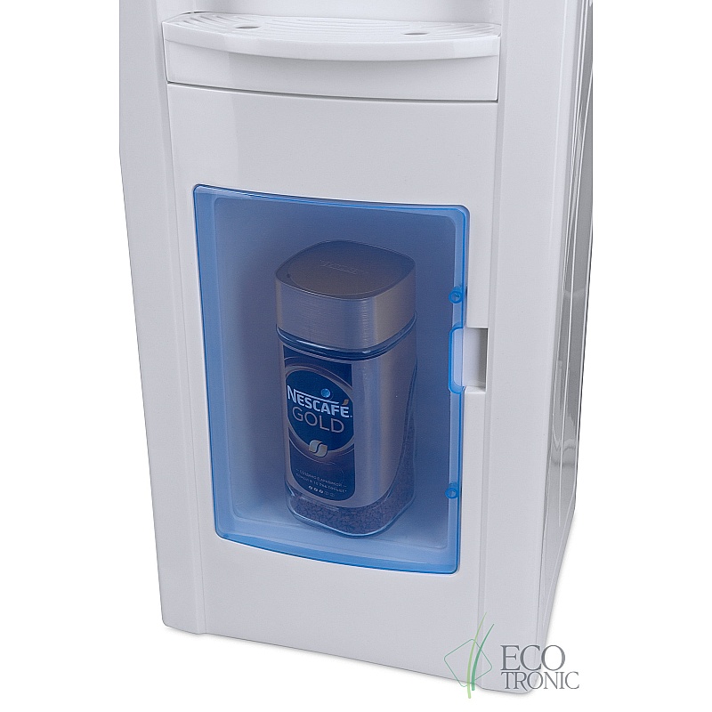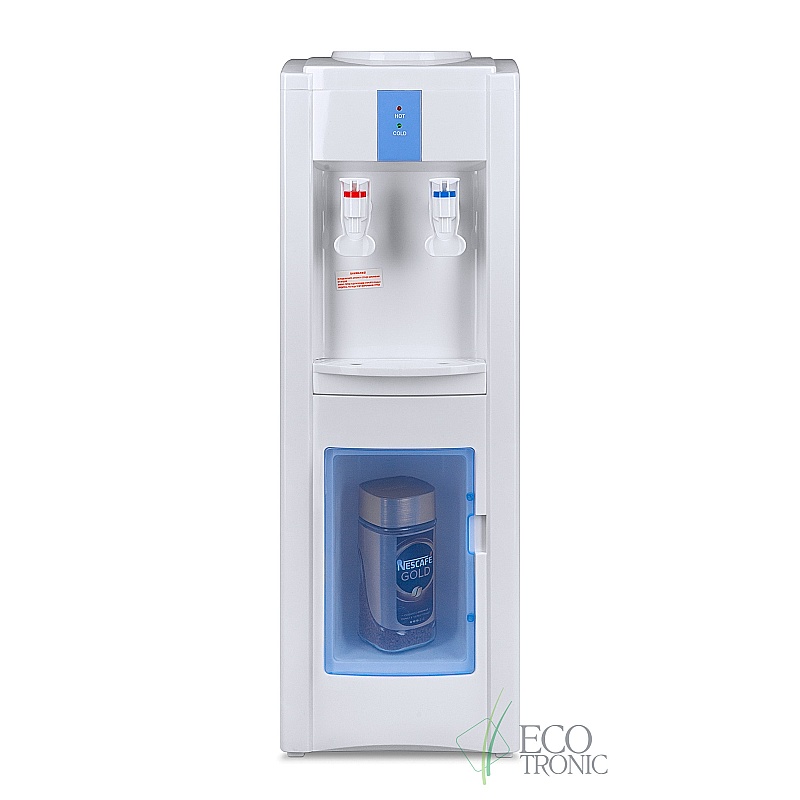 Компактный кулер со шкафчиком для хранения. Напольная модель небольшого размера, легко вписывается в любой интерьер. Электронное охлаждение. Корпус белого цвета с голубыми вставками. Индикация режимов нагрева и охлаждения воды. Краны "нажим кружкой".