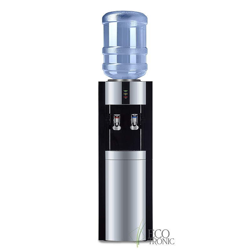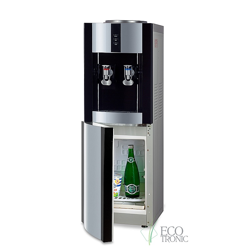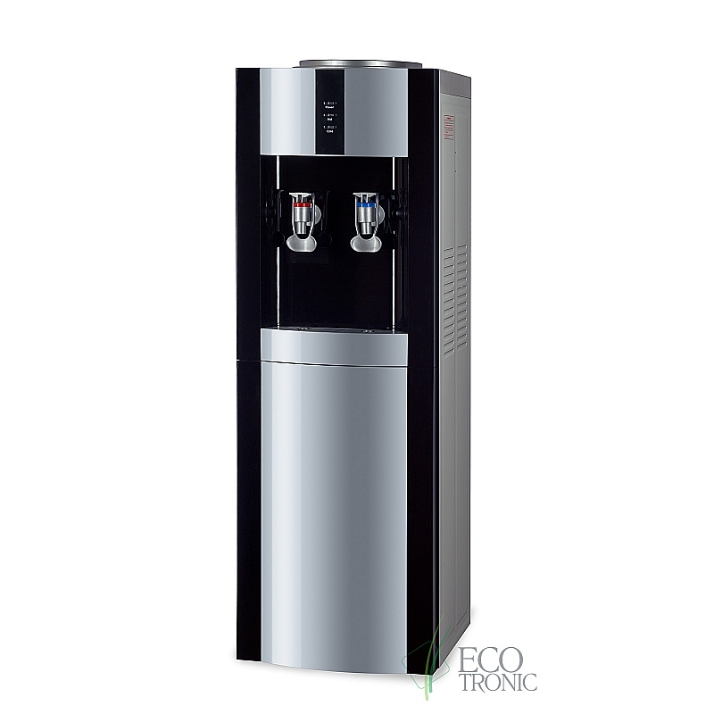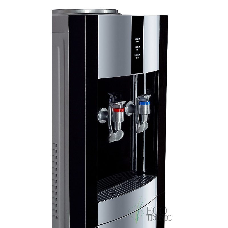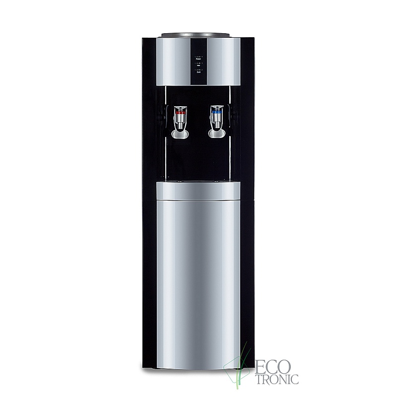 Кулер с холодильником. Бюджетный аналог классической модели Ecotronic Н1-LF. Напольный кулер черного цвета с серебристой вставкой. Компрессорное охлаждение. Тип кранов подачи воды - "нажим кружкой".
