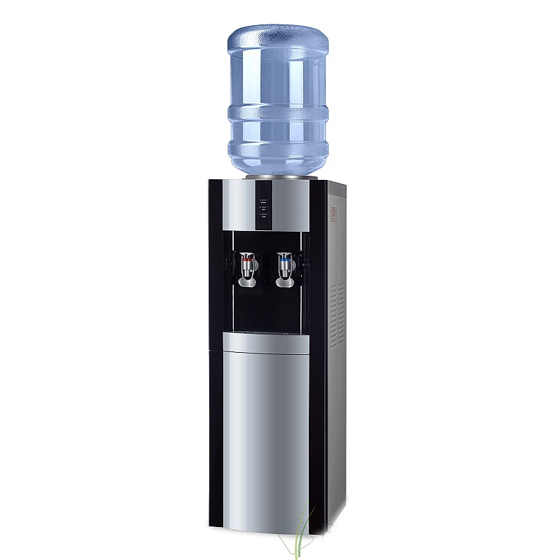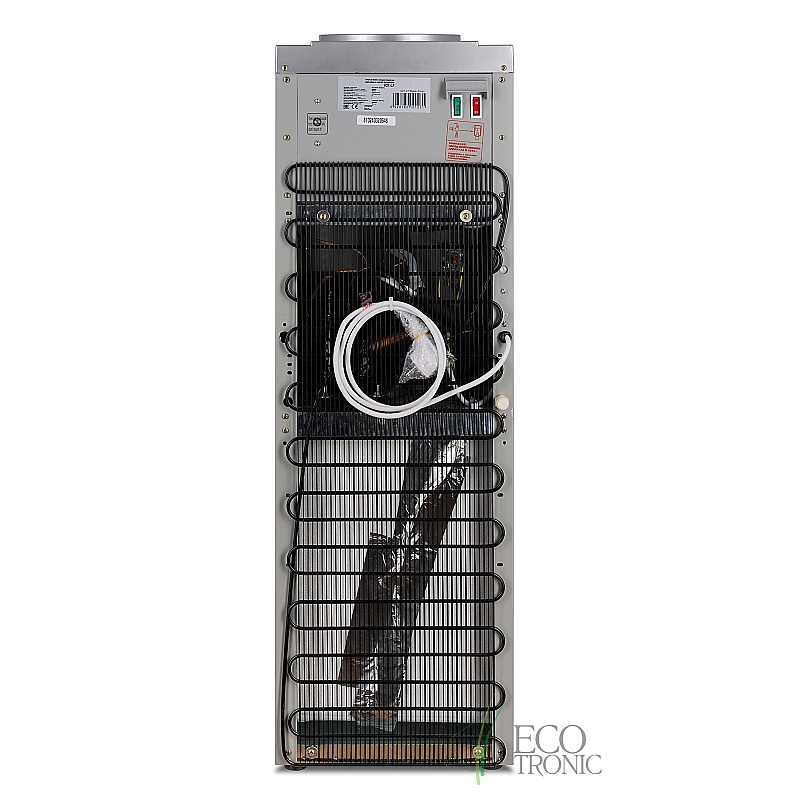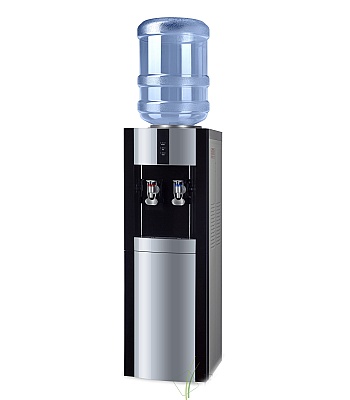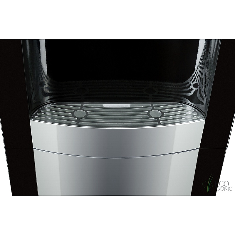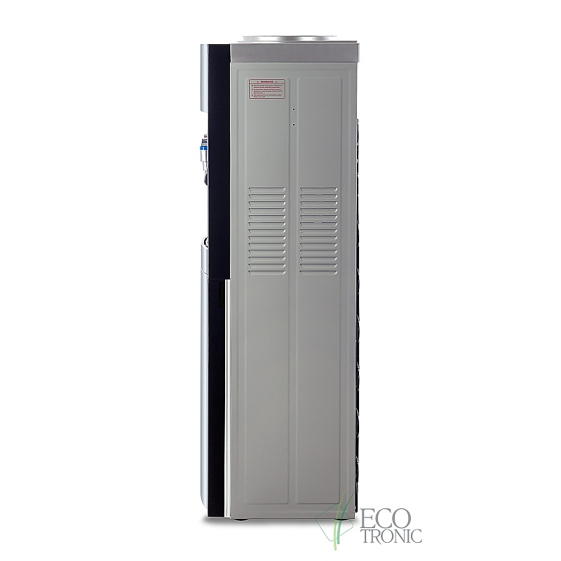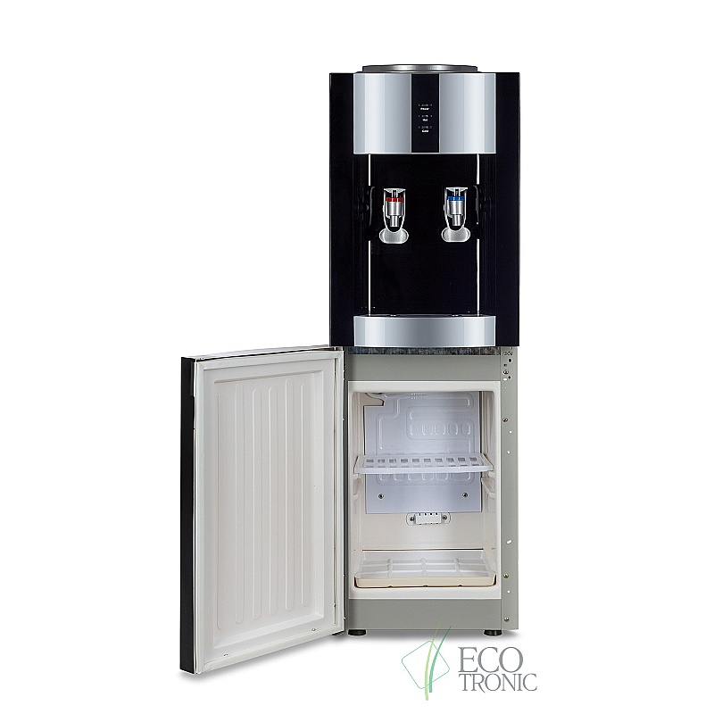 Кулер с холодильником. Бюджетный аналог классической модели Ecotronic Н1-LF. Напольный кулер черного цвета с серебристой вставкой. Компрессорное охлаждение. Тип кранов подачи воды - "нажим кружкой".