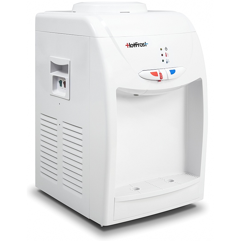 Настольный кулер с компрессорным охлаждением. Аппарат порадует своих владельцев белым дизайном, компрессором с низким уровнем шумности, возможностью подачи воды двух разных температур и функцией блокировки случайного слива воды из горячего краника.