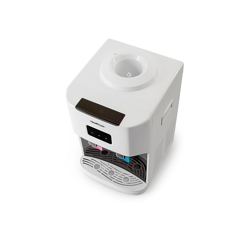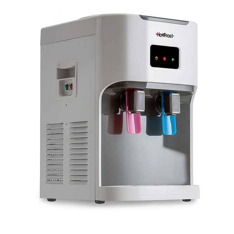 Главное преимущество HotFrost D115 – его компактность, при том же наборе функций, которые выполняют полноразмерные кулеры. Кулер представлен в традиционном белом цвете. Аппарат оснащен компрессорной системой охлаждения, отличается высокой производительностью: подает до двух литров холодной воды в час, и подходит для установки в офисах с многочисленным персоналом.