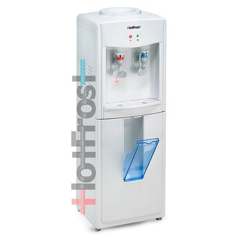Стандартный в плане функциональных возможностей кулер с компрессорным типом охлаждения, выполненный в белом цвете с удобными кранами типа "нажим кружкой". В нижней части кулера расположен отсек для пластиковых стаканчиков, а небольшие габариты позволяют разметить кулер HotFrost V118 даже в небольших помещениях.