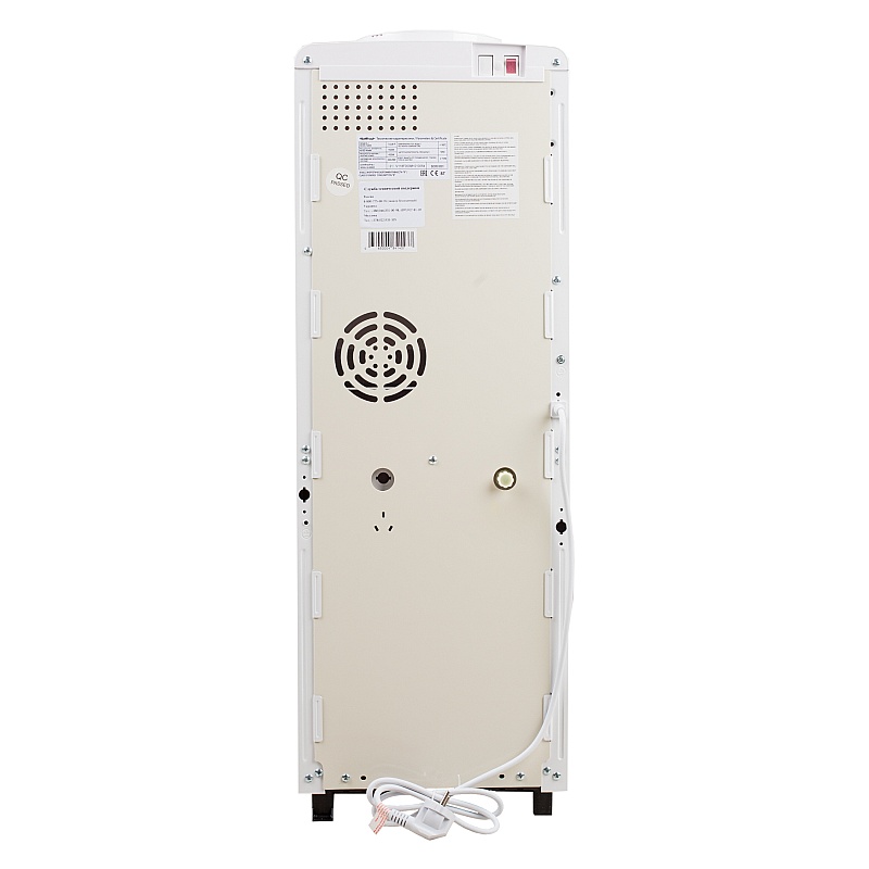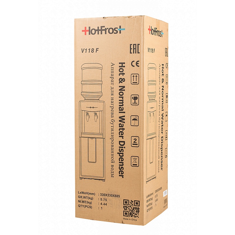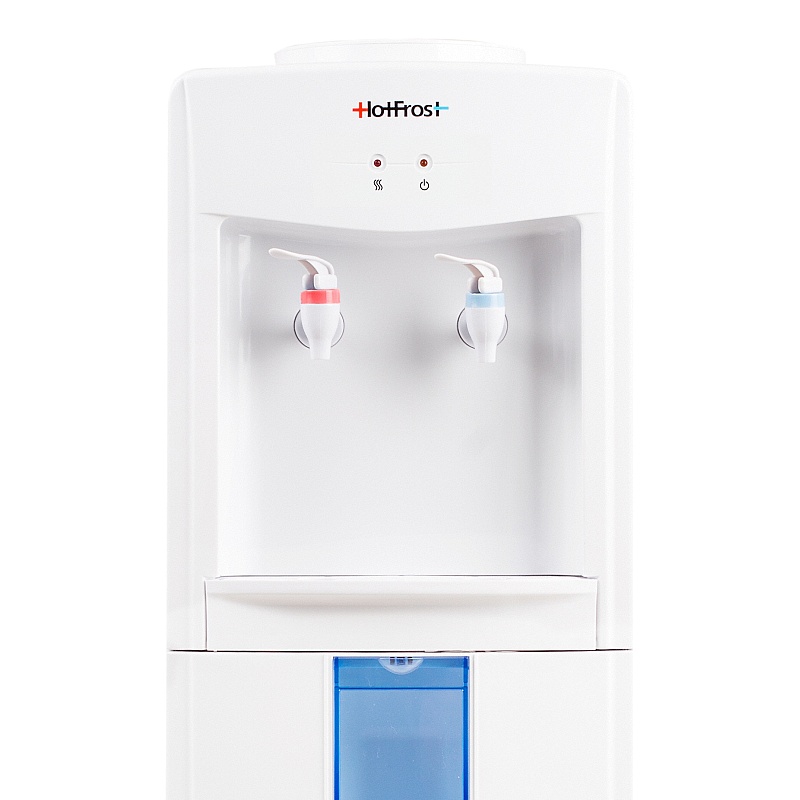 Кулер для нагрева и раздачи бутилированной воды от компании Хотфрост. Функция охлаждения - отсутствует. Из краника холодной воды подаётся вода комнатной температуры. Встроенный отсек для одноразовых стаканов.