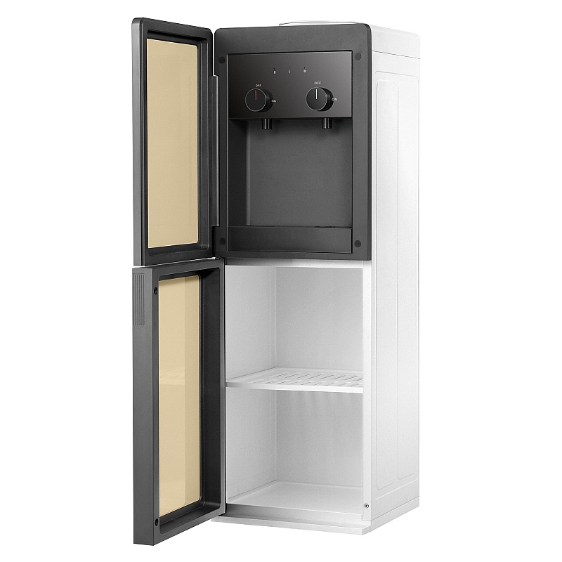 Кулер имеет термоэлектрическое (электронное) охлаждение воды. Из дополнительных бонусов - это шкафчик объемом 36 литров, который пригодится для хранения посуды. Данный аппарат - это идеальное решение, выполненное из стекла и металла.