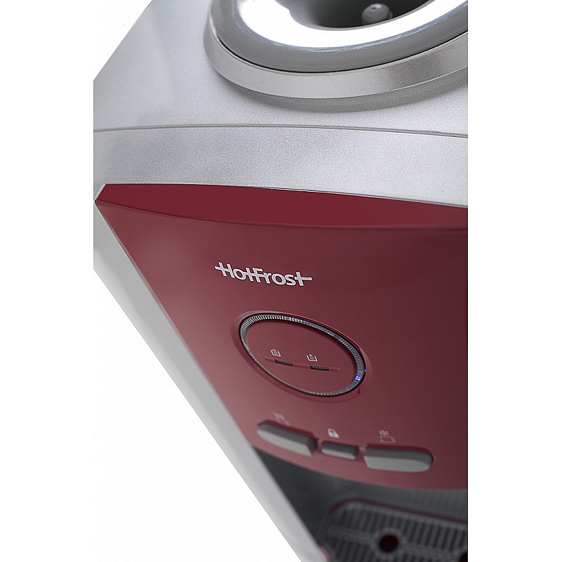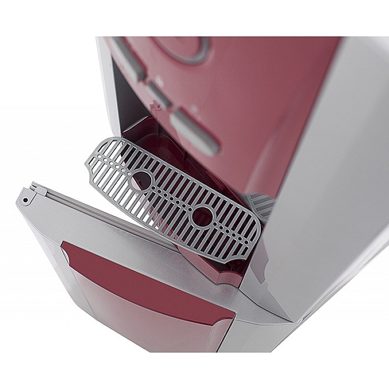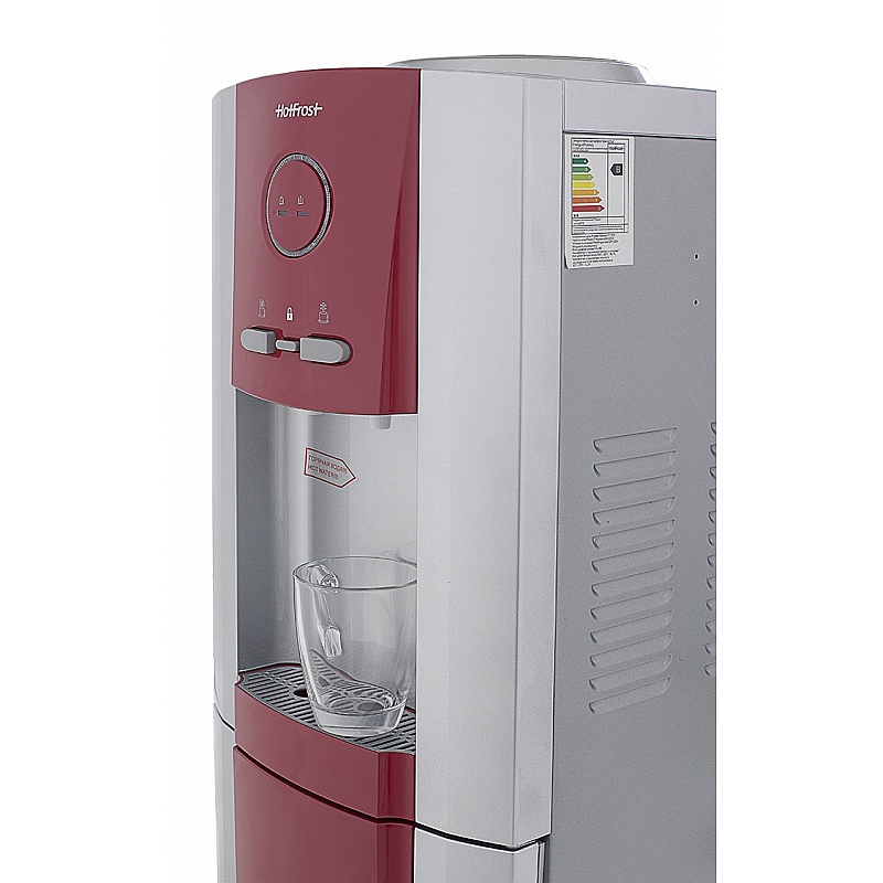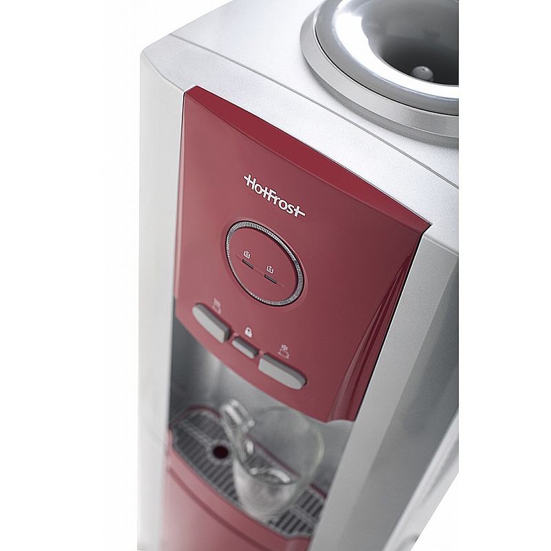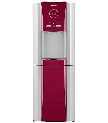 Кулер напольного исполнения с электронной системой охлаждения. Цвет – металлик со вставкой красного цвета на передней панели. Подача воды осуществляется посредством механических клавиш. В нижнюю часть корпуса встроен шкафчик объемом 17 литров.