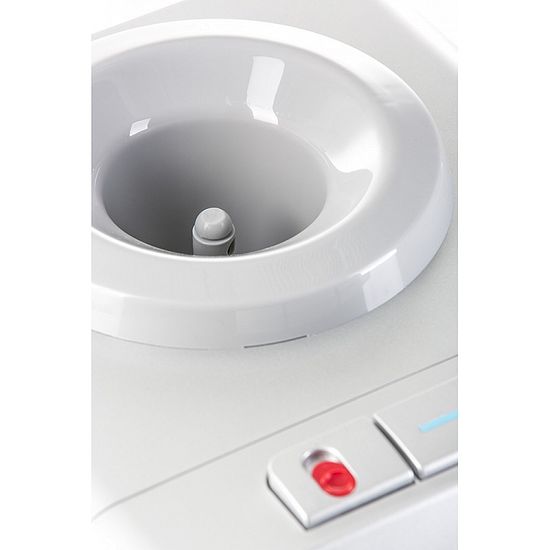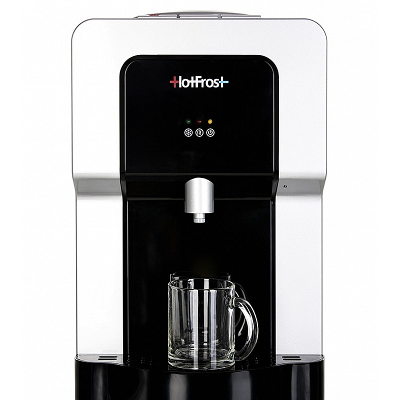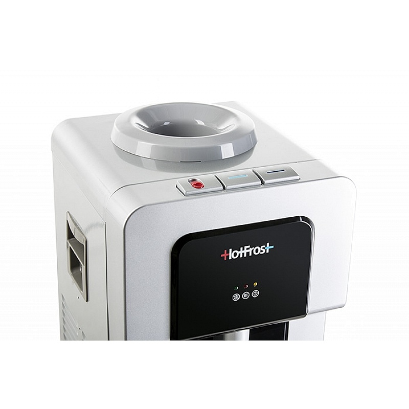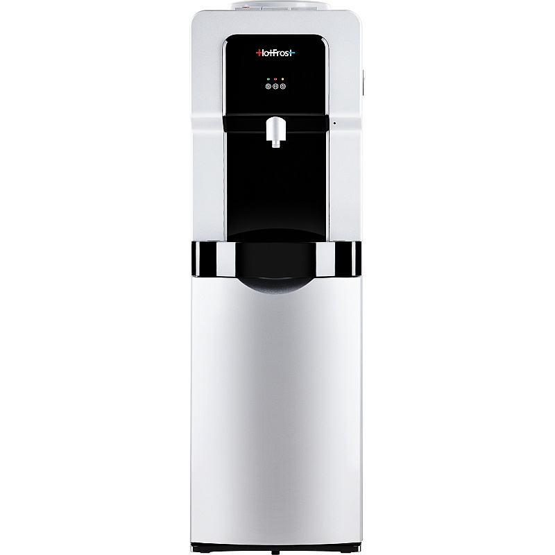 Напольный кулер с компрессорным охлаждением. В нижней части имеется небольшой не охлаждаемый шкафчик на 16 л. Один кран подачи воды из которого течет горячая, холодная вода и вода комнатной температуры. На горячем кране имеется защита от случайного нажатия и ошпаривания. Отличная, стильная модель кулера прекрасно впишется в любой интерьер дома или офиса.