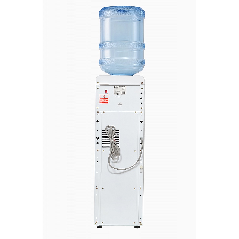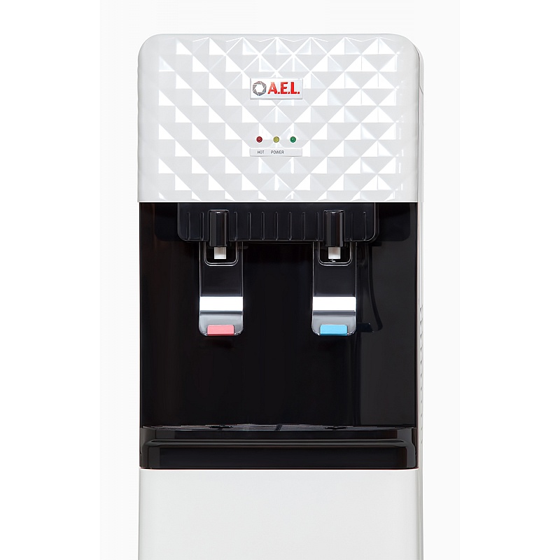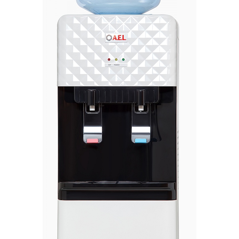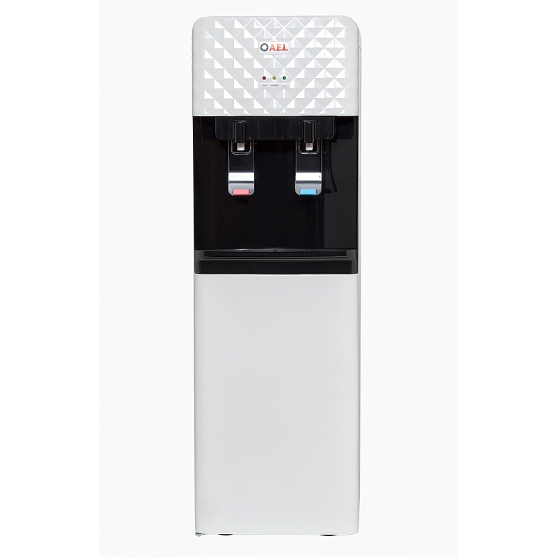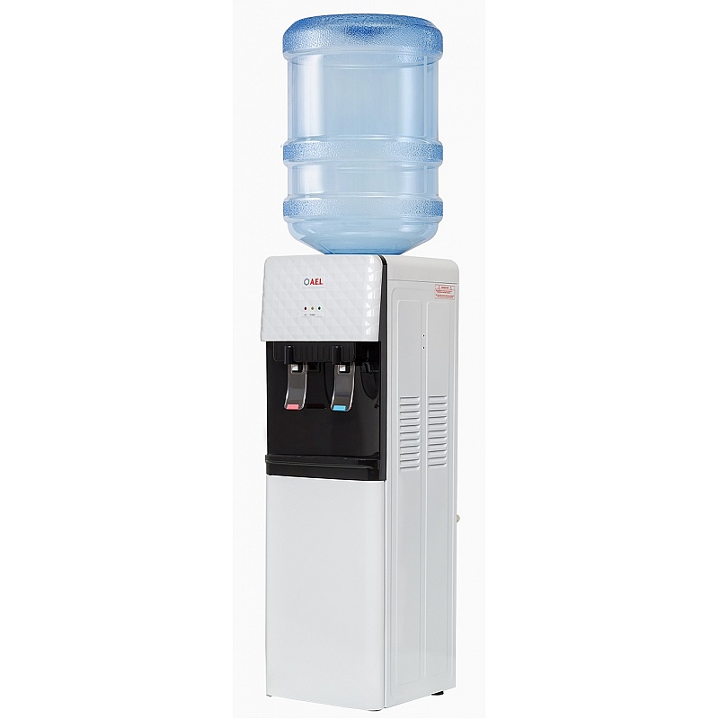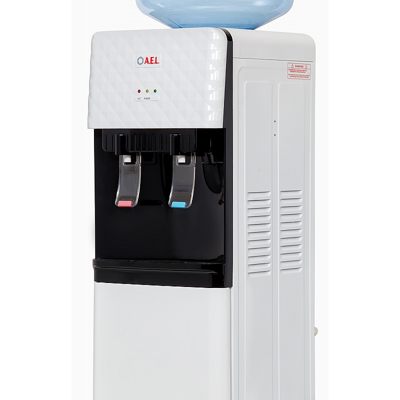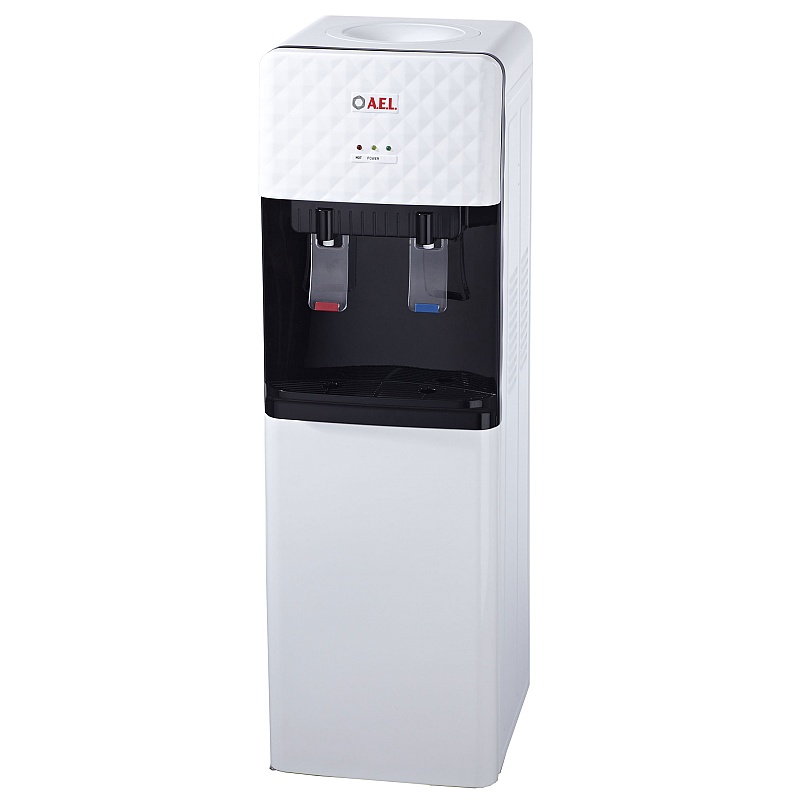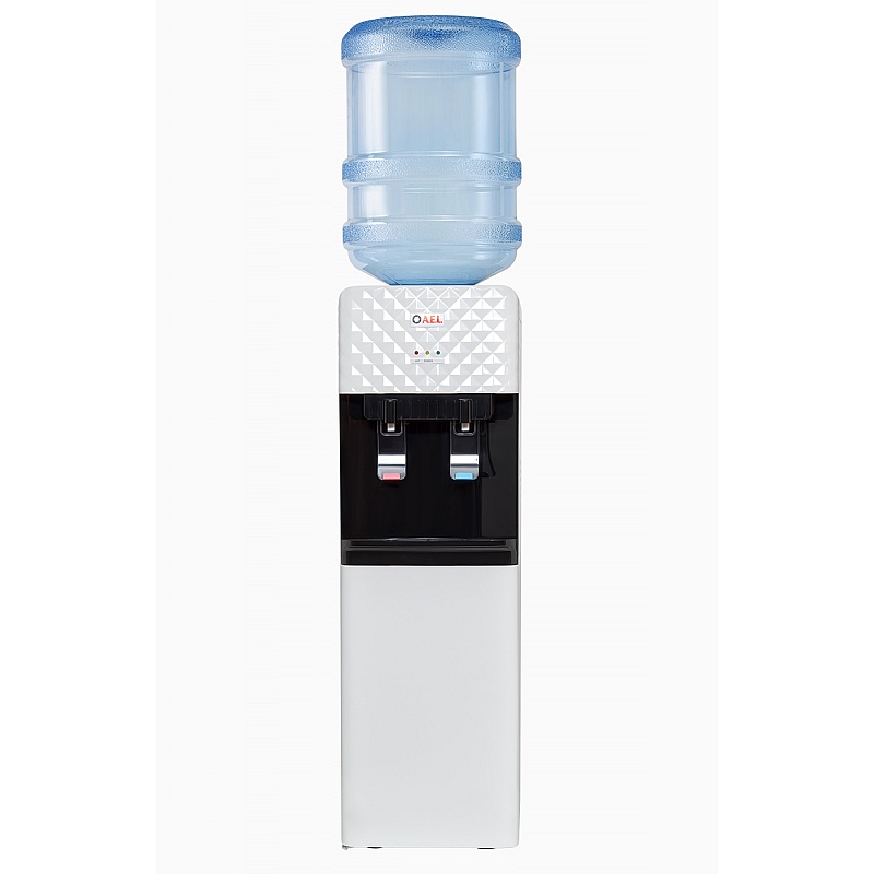 Напольный кулер-чайник без охлаждения и верхней загрузкой бутыли. Классический бюджетный кулер для нагрева воды. Цвет белый с черной вставкой на лицевой панели. Шкафчик на 9 литров. Краны "нажим чашкой".
