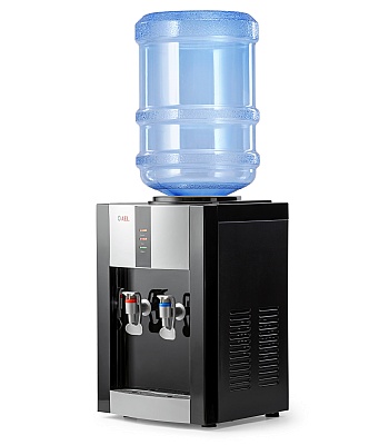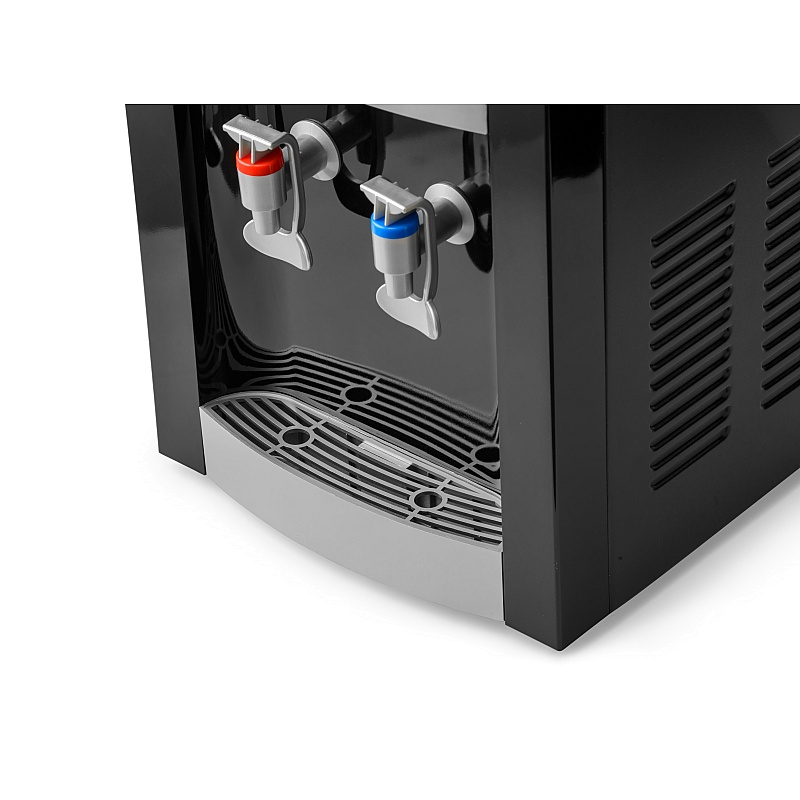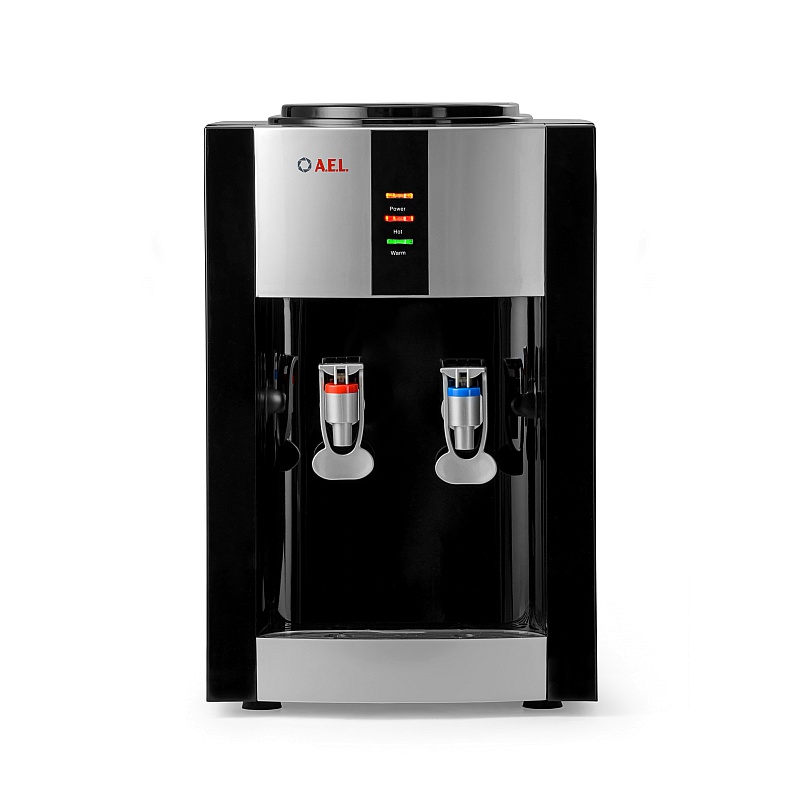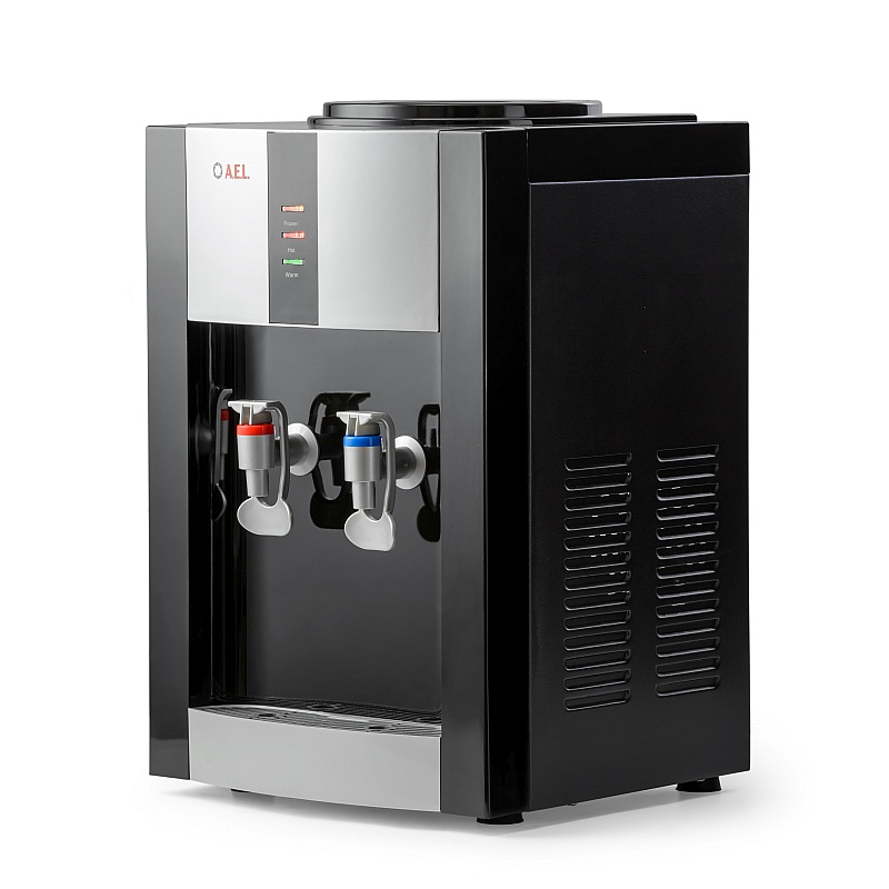Настольный кулер с компрессорной системой охлаждения. Черного цвета с серебристыми вставками. Отличается высокой производительностью (нагревает до 5 л и охлаждает до 2 л воды в час). Охлаждение и нагрев воды можно отключить с помощью тумблеров на задней панели кулера. Оснащен кранами типа "нажим кружкой". Изготовлен из высококачественного пищевого пластика, а боковые черные стенки сделаны из металла, что позволяет крепить держатель на магните.