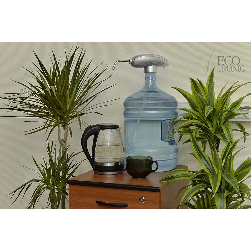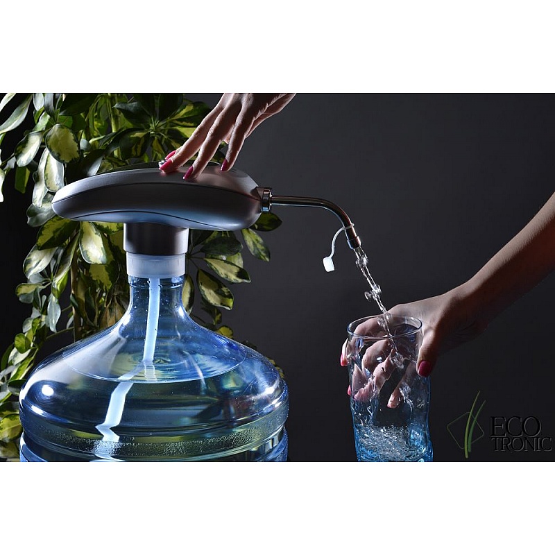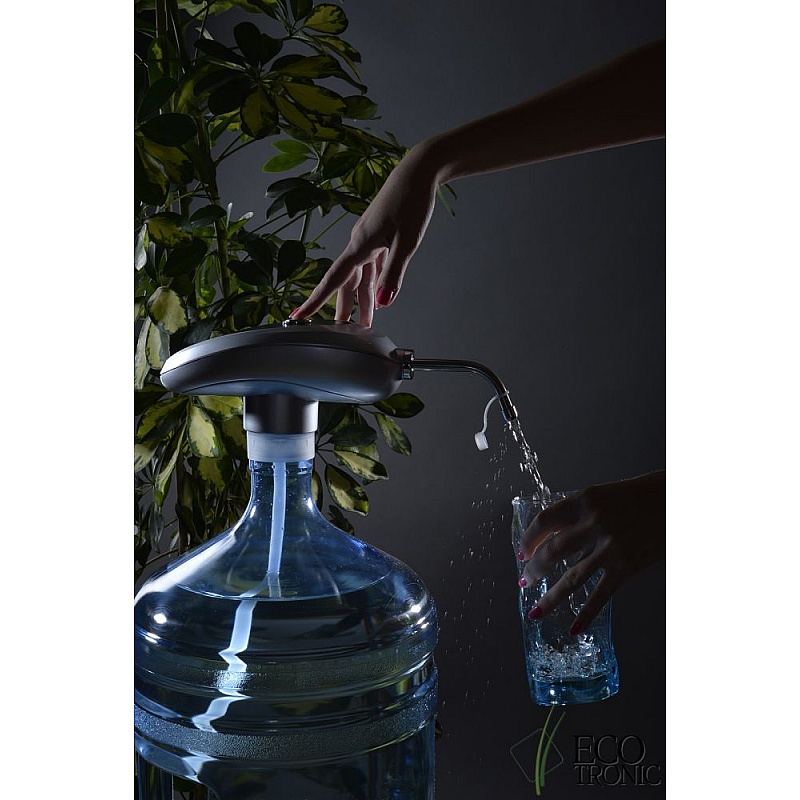 Больше 10 бутылей на одном заряде (внутри мощный насос и батарея). Заряжается с помощью адаптера. Простая установка на бутыль (без снятия крышки). Гибкая трубка забора воды (для забора воды без остатка). Индикатор заряда.