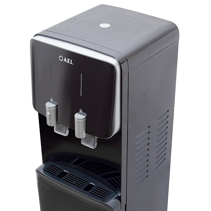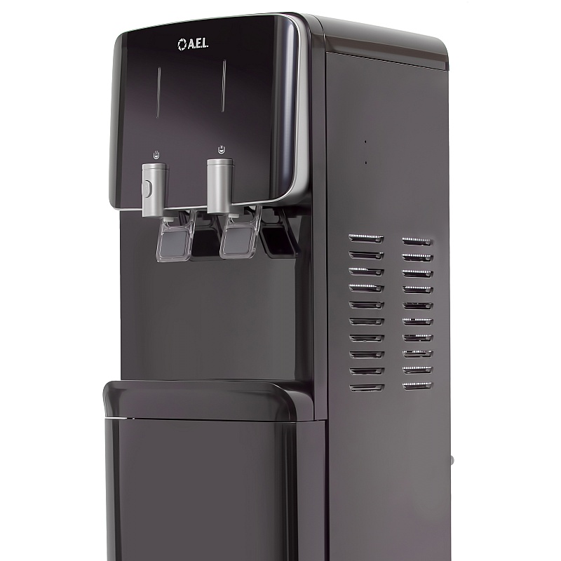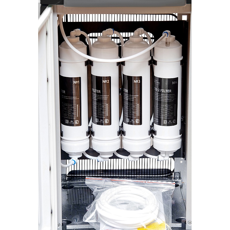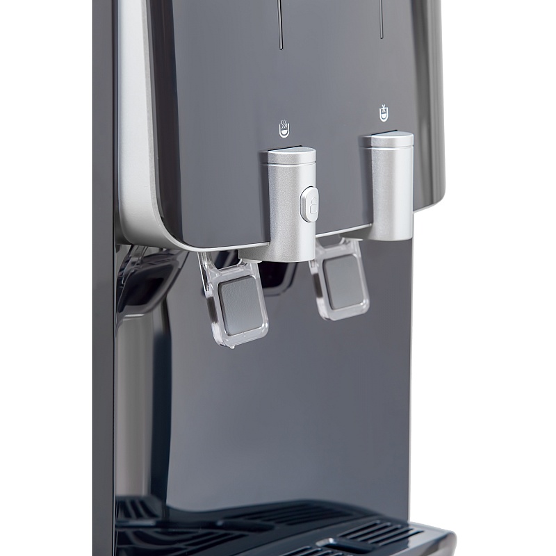 Краны "нажим кружкой" с защитой от случайного нажатия на кране горячей воды. Цвет черный с серебристой вставкой. Современный, продвинутый дизайн. Имеет дополнительную защиту от перелива воды в накопительном баке. В случае выхода из строя механической защиты (например, из-за неправильно установленных фильтров или несвоевременной замены), срабатывает дополнительный электромагнитный клапан. Важно! Пурифайер имеет блокировку на подачу воды при отключении от электрической сети.