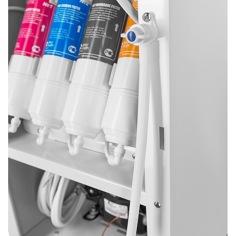 4-х ступенчатая ультрафильтрационная система очистки воды. Накопительный бак - 19л, бак холодной воды - 5.6л, горячей воды - 4.3л. Мощность нагревательного элемента 800Вт. Краны "нажим кружкой". Цвет белый с синей вставкой.