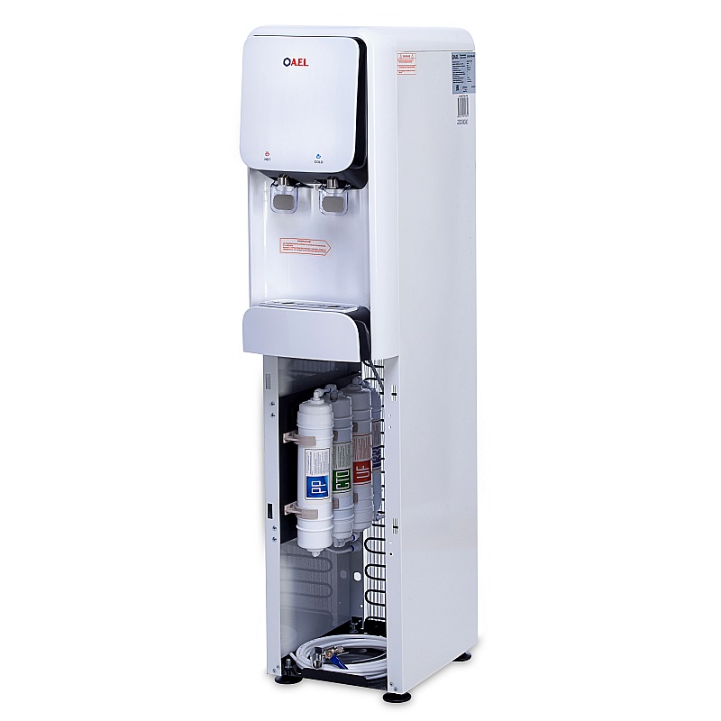 Высокий пурифайер с четырьмя ступенями очистки воды в среднем ценовом сегменте. Белого цвета. Удобные краны нажим чашкой с защитой от случайного нажатия. Компрессорное охлаждение и производительный нагрев позволят использовать данную модель в офисах с небольшим количеством персонала до 20 человек.