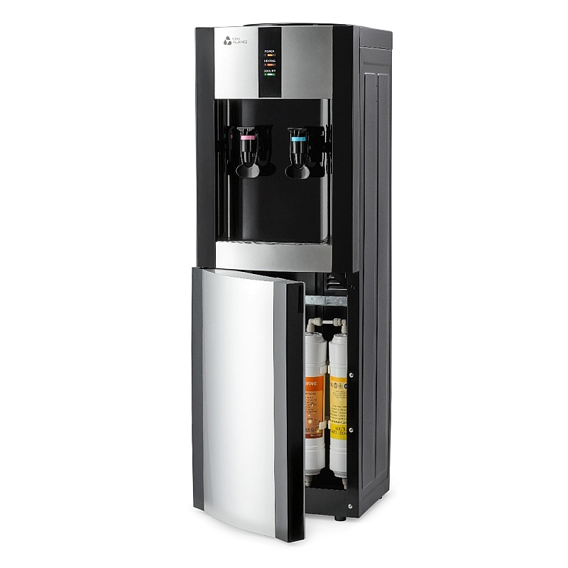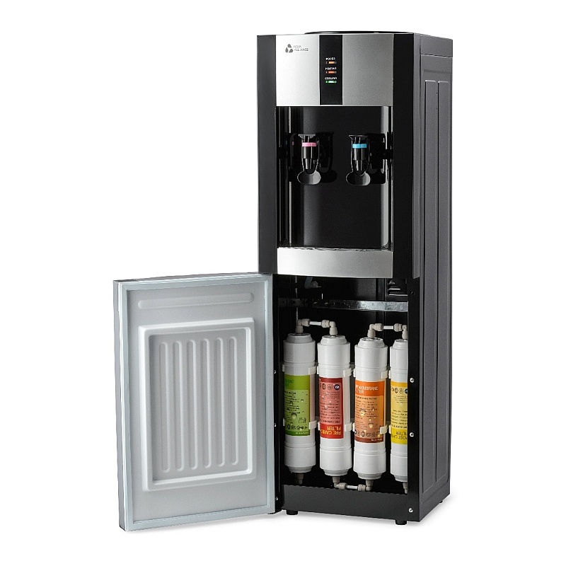 Напольный пурифайер с 4-х UF системой очистки и электронной системой охлаждения. Внешний нагревательный элемент и бак нагрева 1,2л. Удобные краники "нажим кружкой" с внутренней резьбой. Цвет - черный с серебристыми вставками, боковые панели черного цвета. Комплектация: кран врезки, трубка 1/4 - 3 метра, фильтры тип - I тип, фильтры размер - 12".